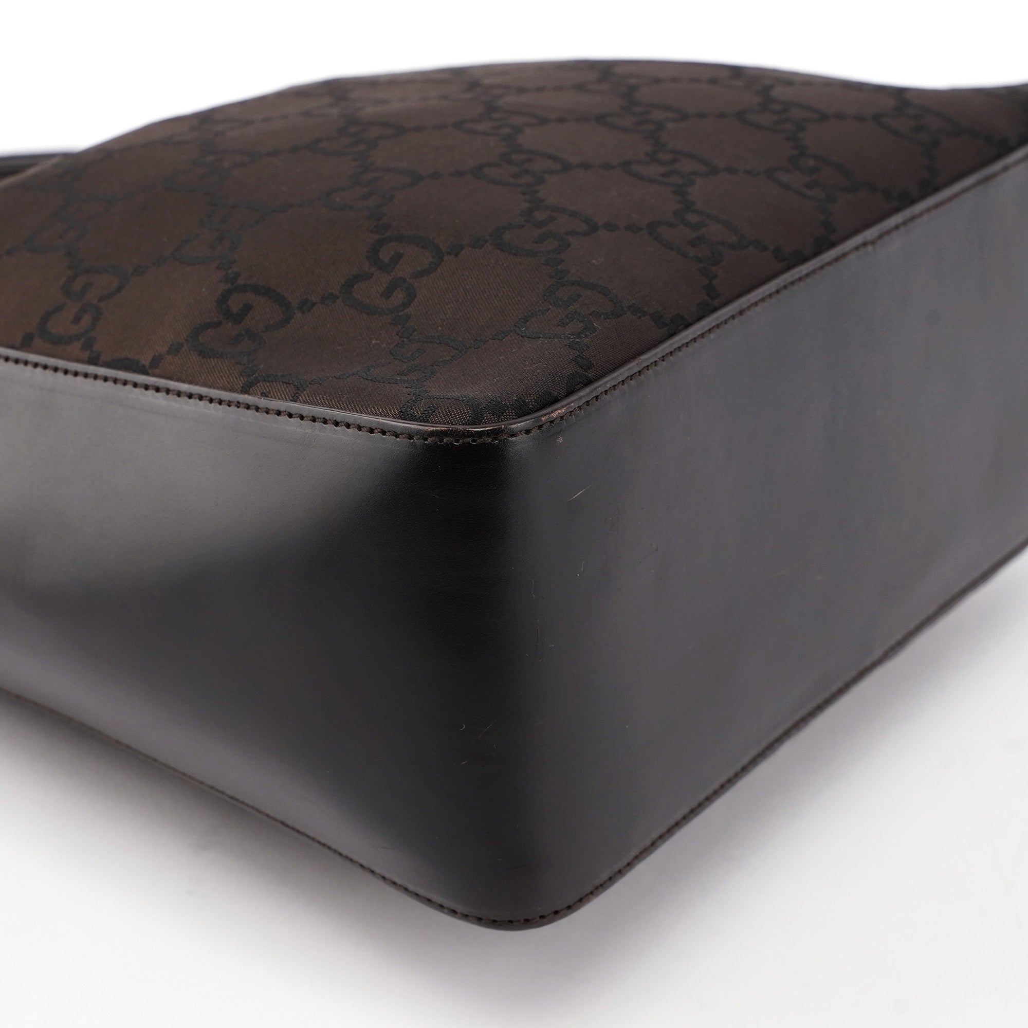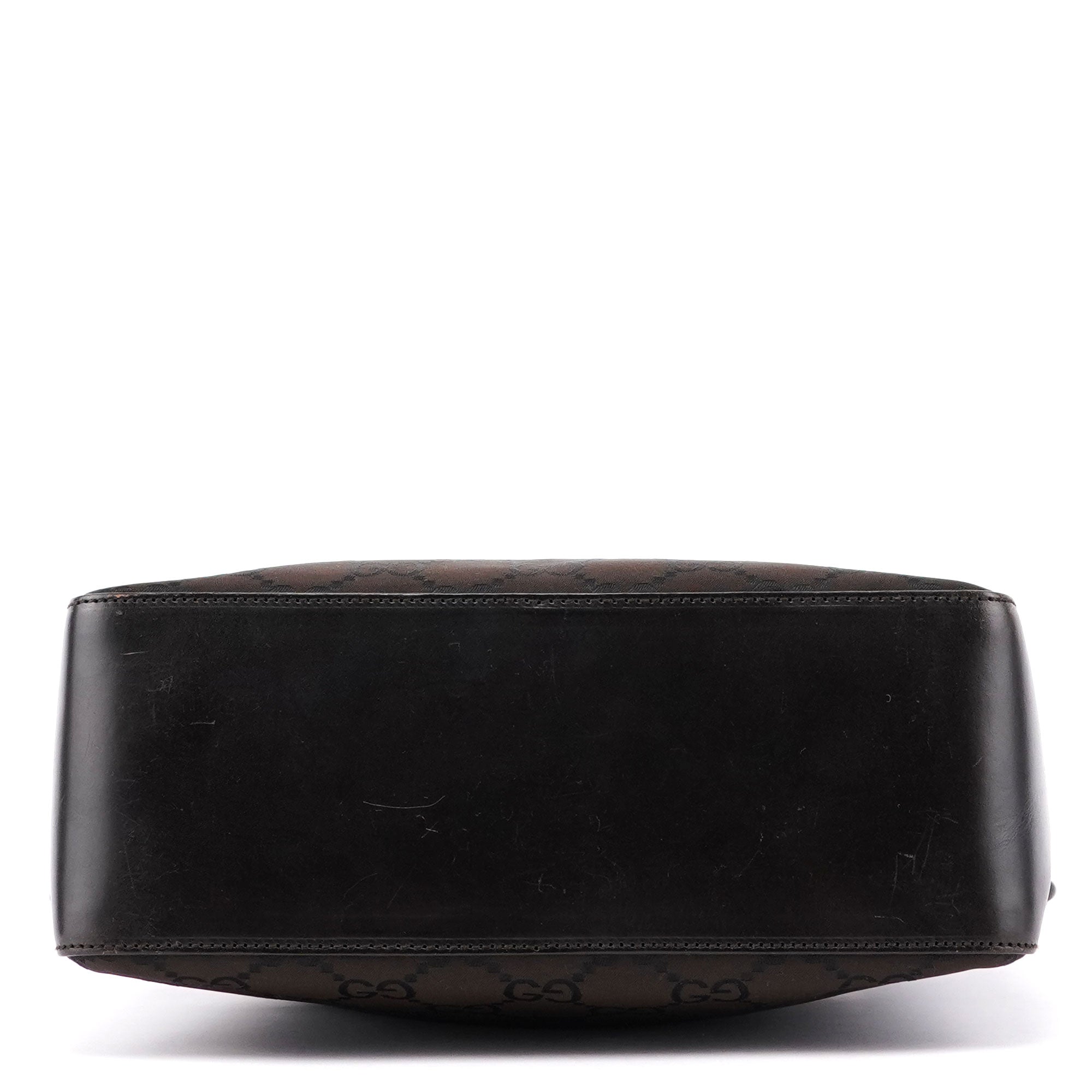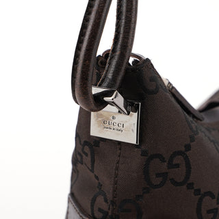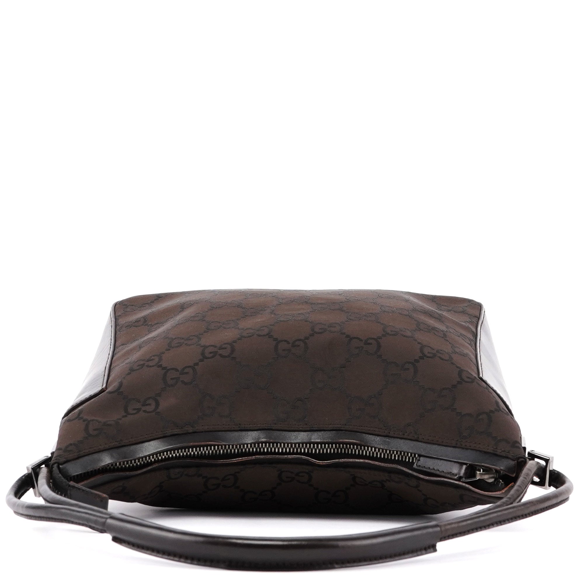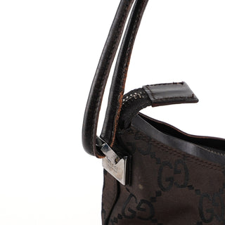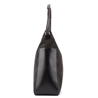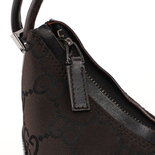 Designed by Tom Ford in the late 1990s, the Gucci hobo bag blends brown GG canvas and tonal leather elegantly. Silver-tone hardware complements its design. The cotton-lined interior features a convenient zipper pocket, with a discreet Gucci logo plate adorning the side.