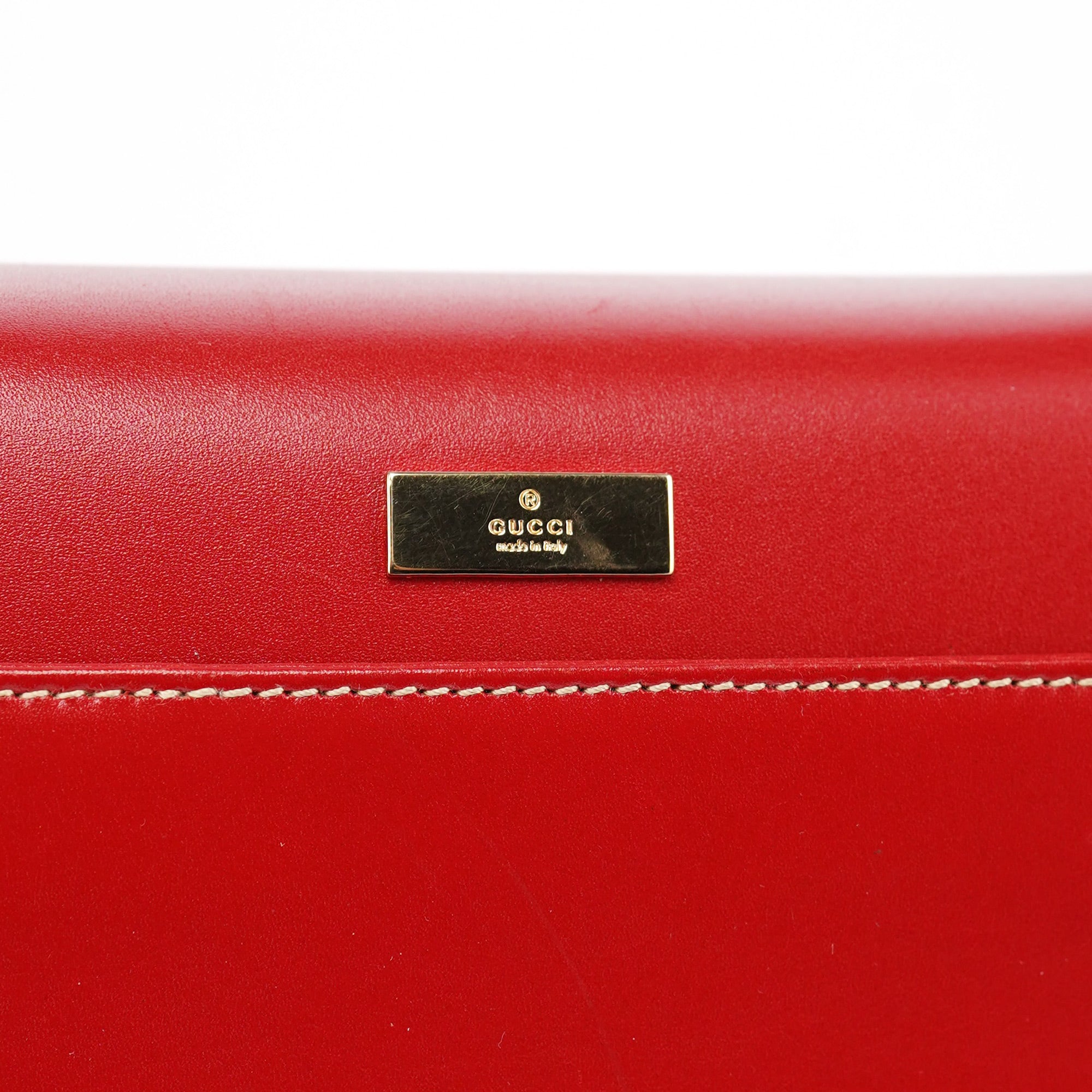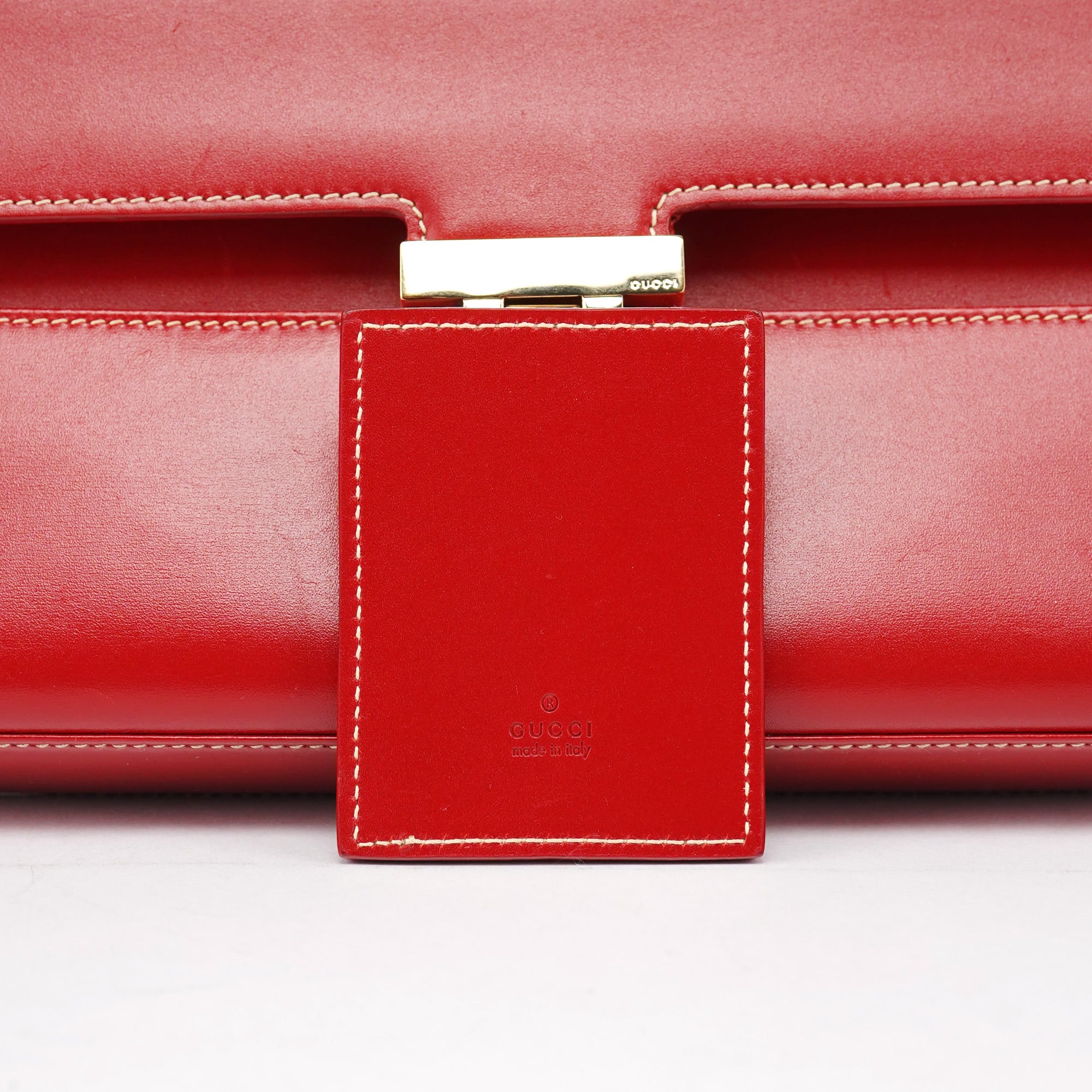 Designed in the late 1990s under Tom Ford’s creative direction, this Gucci Lady Lock bag is crafted in vibrant red calfskin leather with a structured rectangular silhouette, contrast topstitching, and a sleek gold-tone push-lock clasp. It features a flat adjustable shoulder strap and a flap closure that opens to a leather-lined interior with one slip pocket.