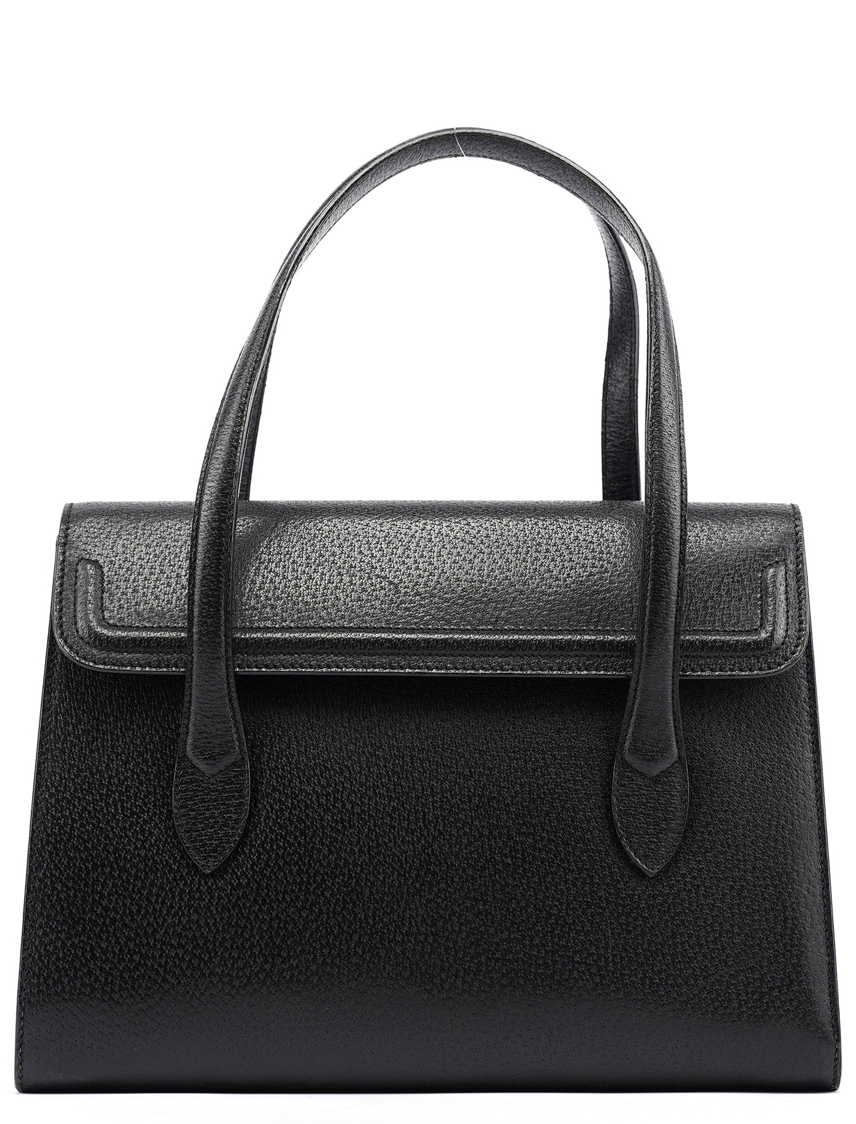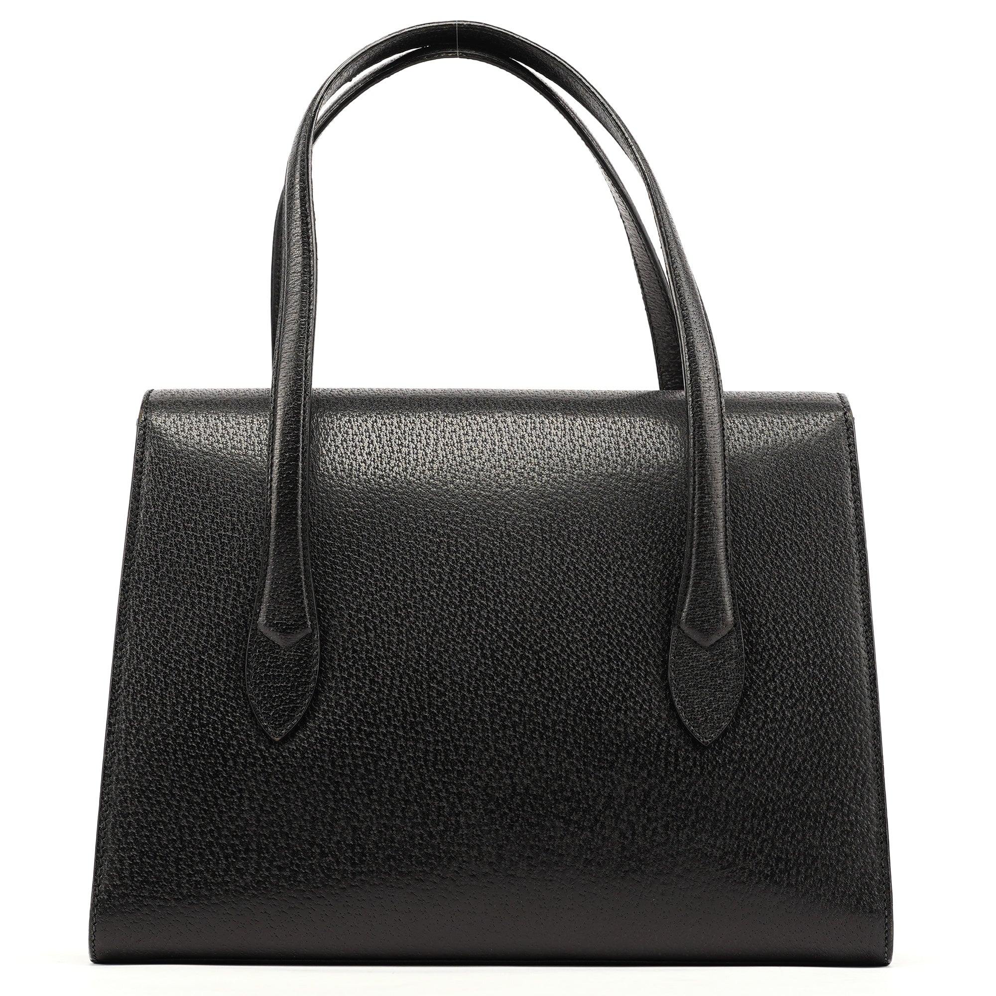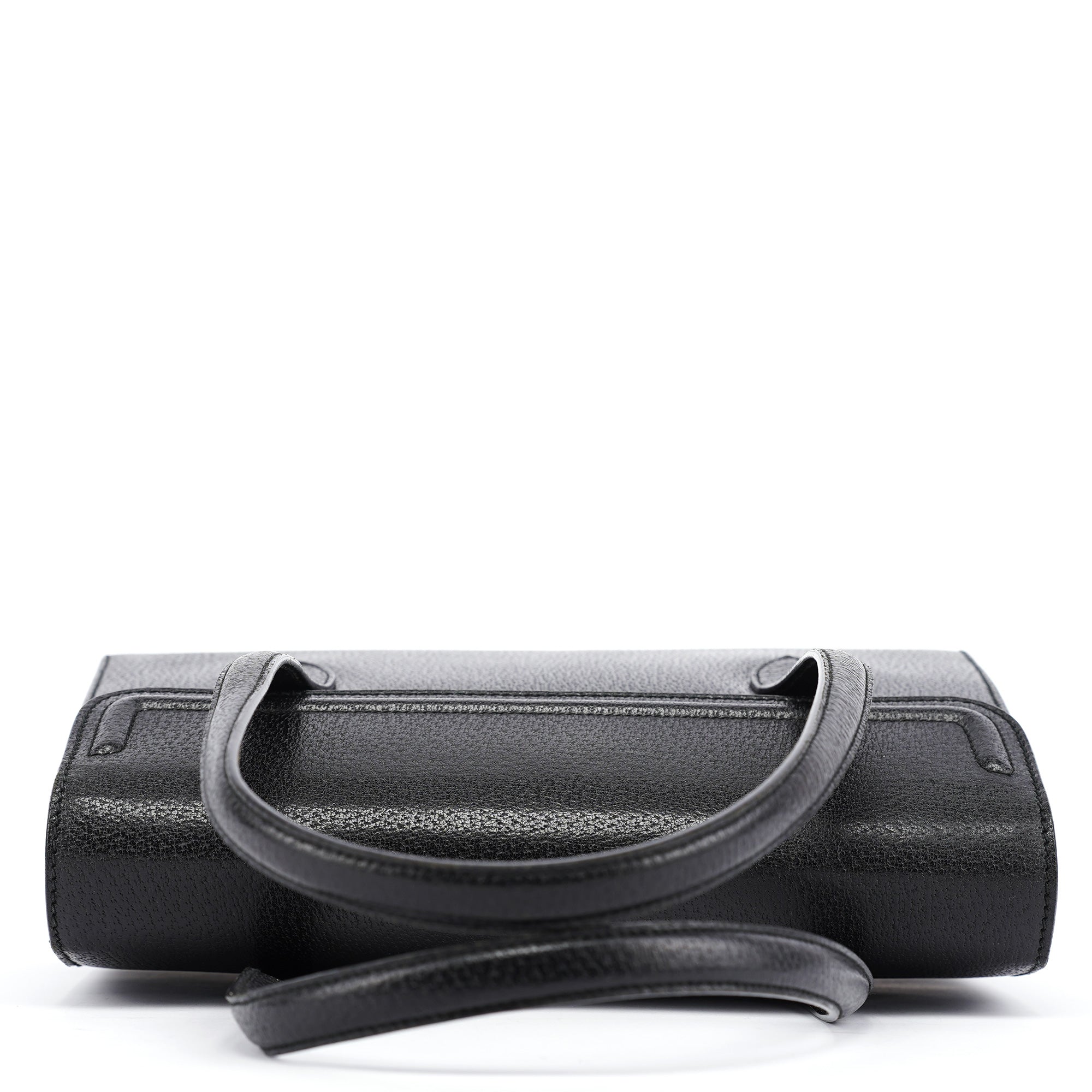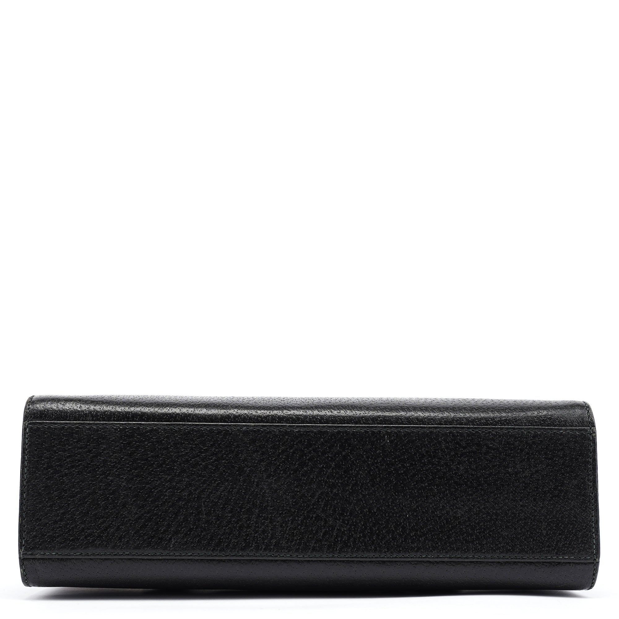 Designed in the mid-1990s by Tom Ford, this vintage Gucci handbag features smooth black calfskin leather with a minimalist design that exemplifies Ford's streamlined aesthetic for the house. The bag showcases a structured rectangular silhouette with dual top handles, no exterior hardware for a minimalist look, and a fold-over flap closure. The interior is lined in black suede with an interior zipper pocket.