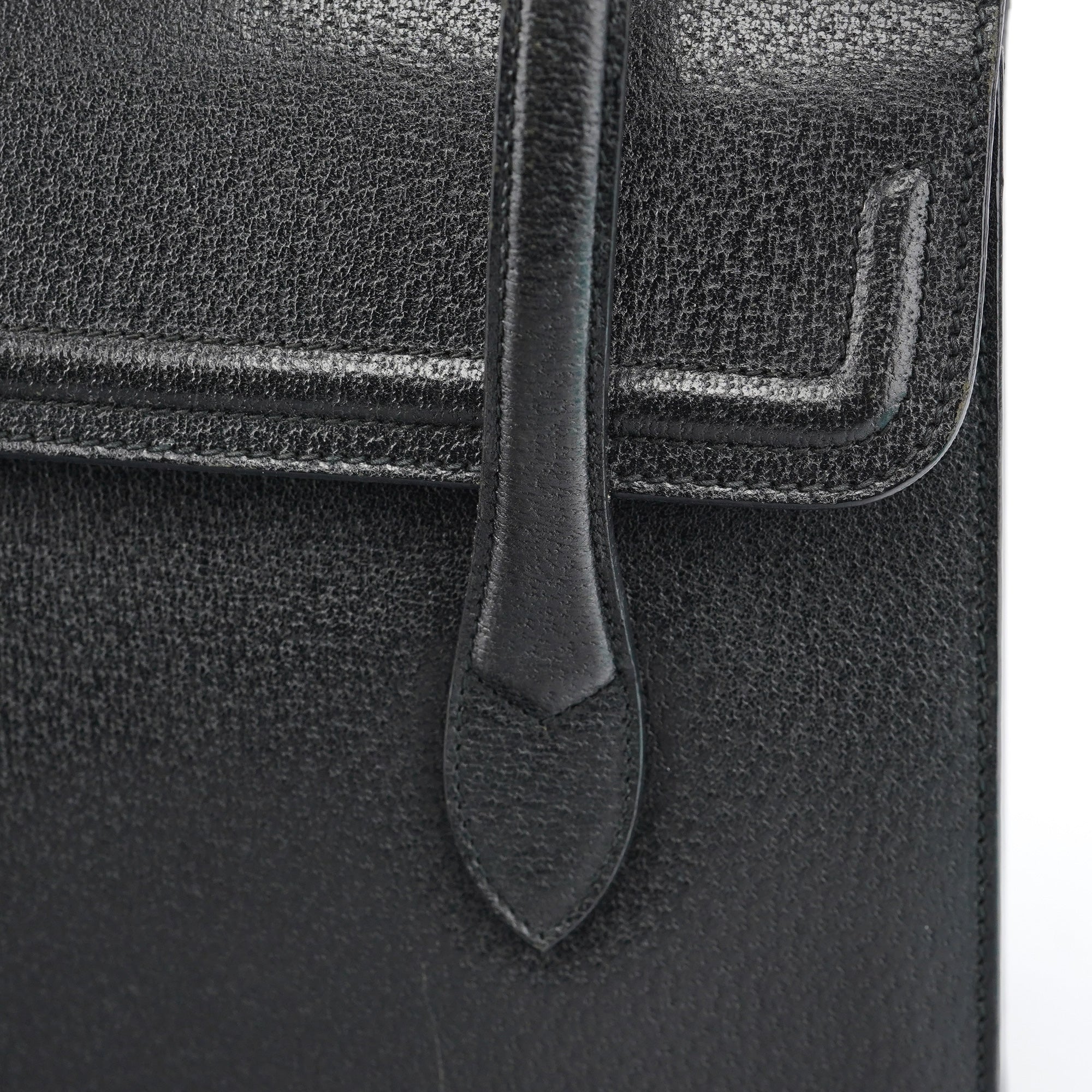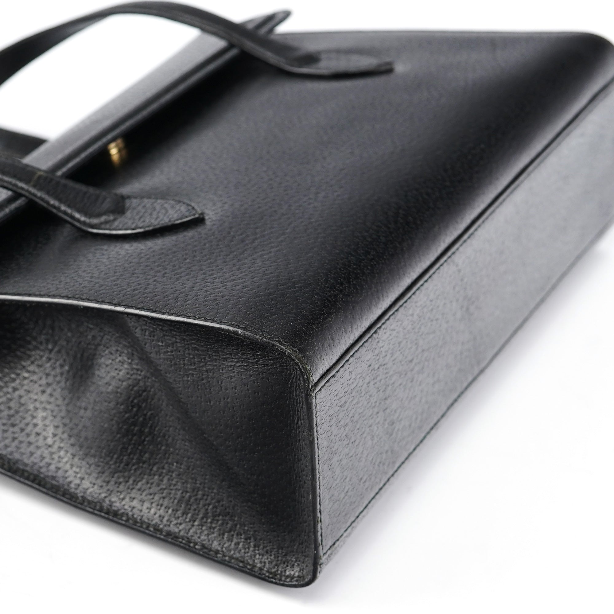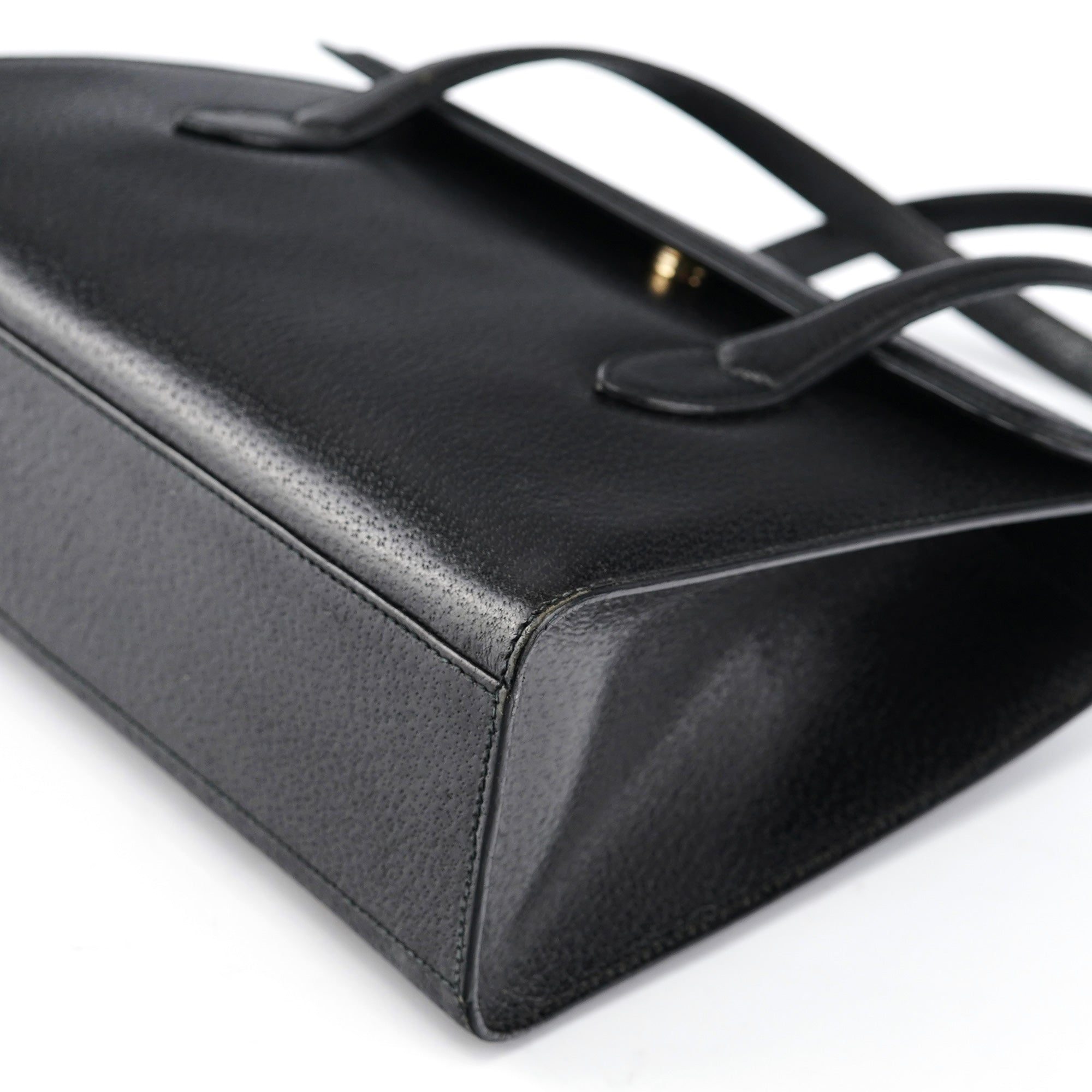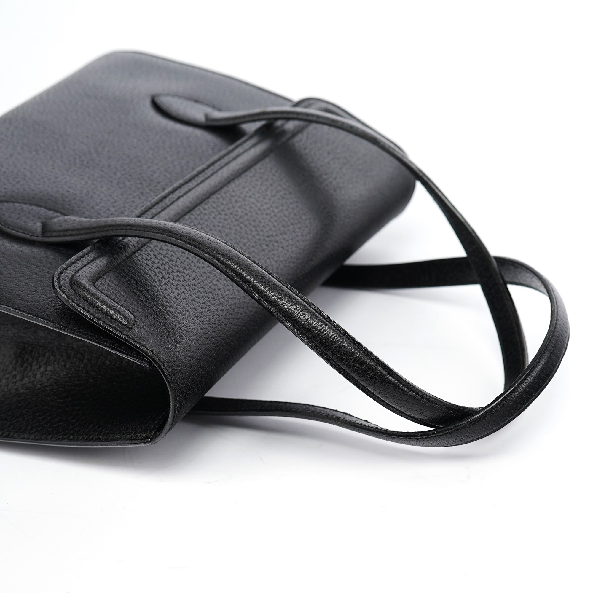Designed in the mid-1990s by Tom Ford, this vintage Gucci handbag features smooth black calfskin leather with a minimalist design that exemplifies Ford's streamlined aesthetic for the house. The bag showcases a structured rectangular silhouette with dual top handles, no exterior hardware for a minimalist look, and a fold-over flap closure. The interior is lined in black suede with an interior zipper pocket.