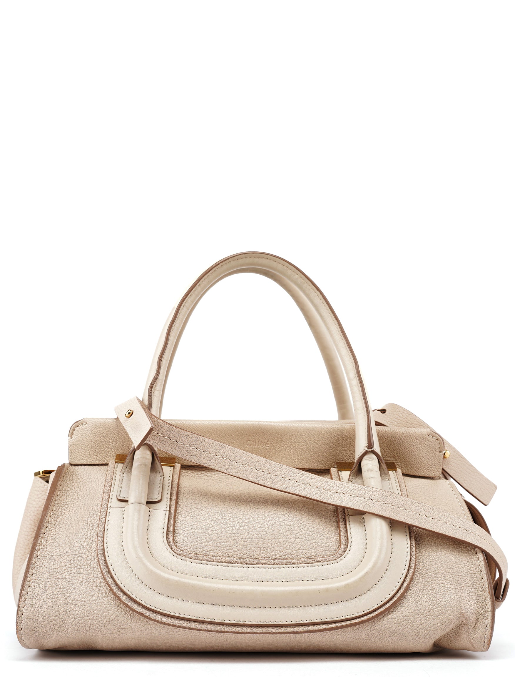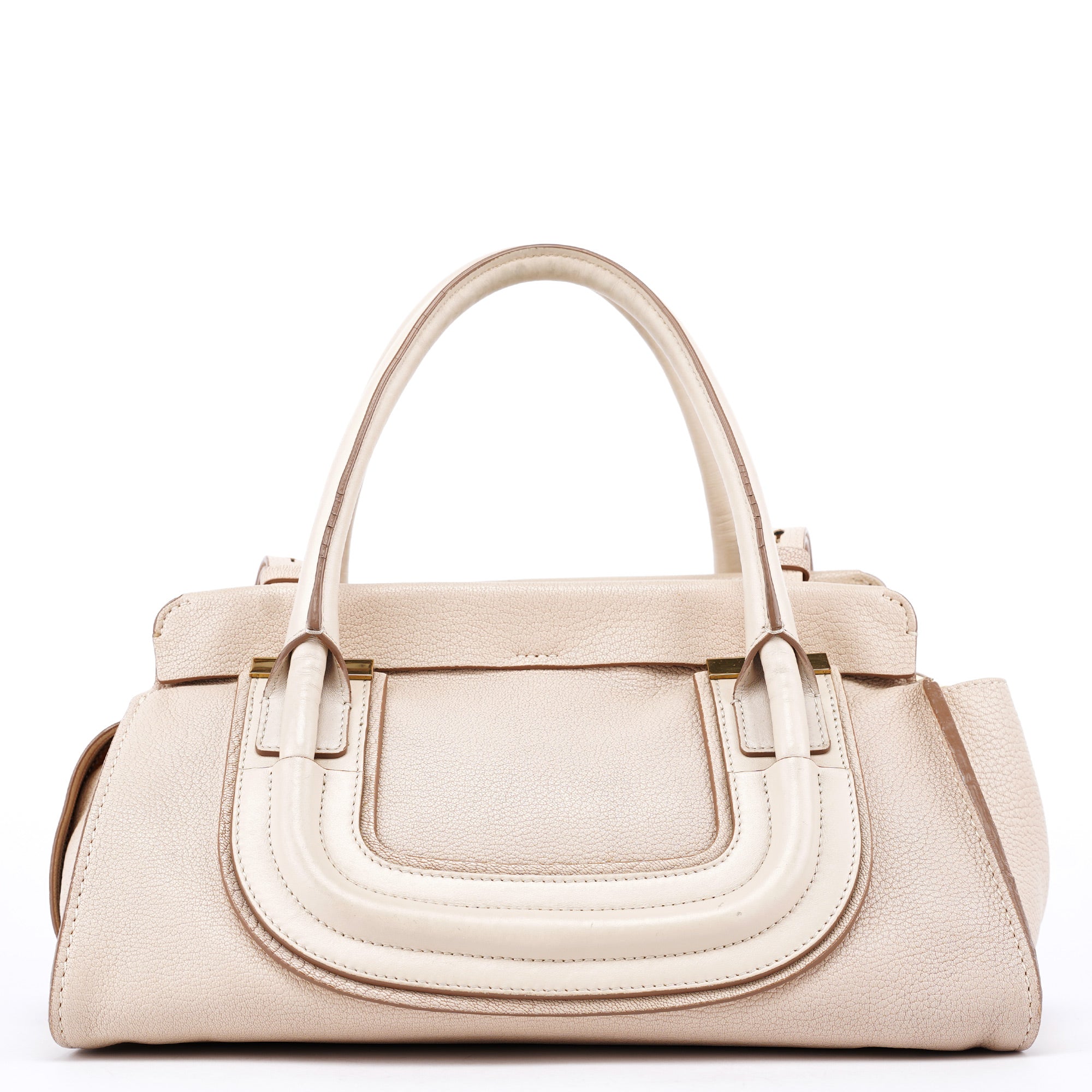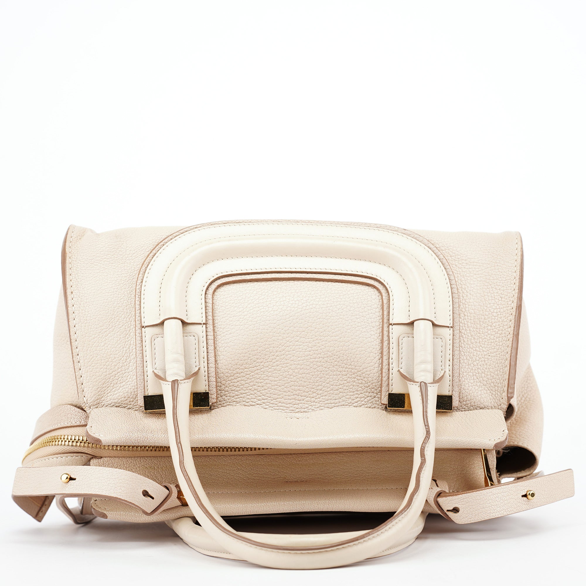 Designed in the 2010s under Clare Waight Keller, this Chloé tote is crafted from ivory grained leather with tonal smooth leather trim and structured rolled handles. Gold-tone hardware and a removable crossbody strap add versatility to the clean, architectural silhouette. The zip-top closure opens to a spacious fabric-lined interior with a zip pocket, blending practical design with understated elegance.
