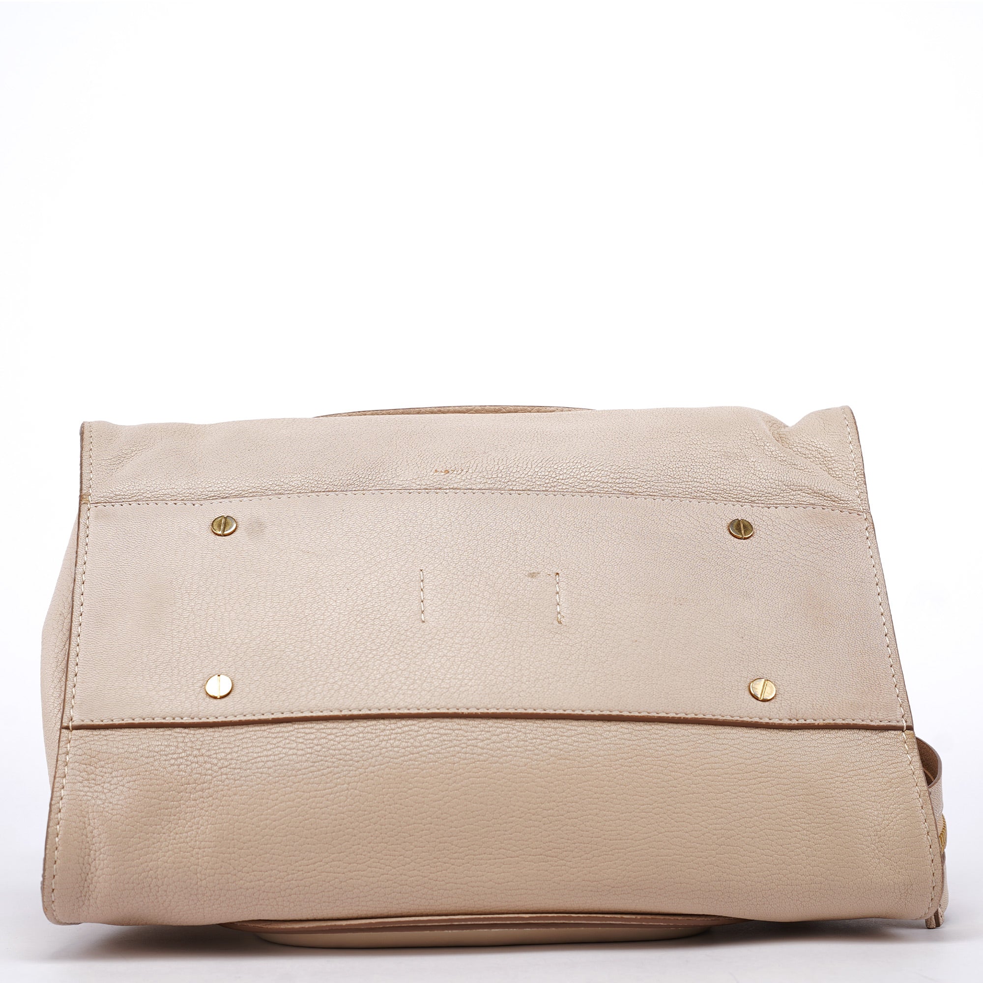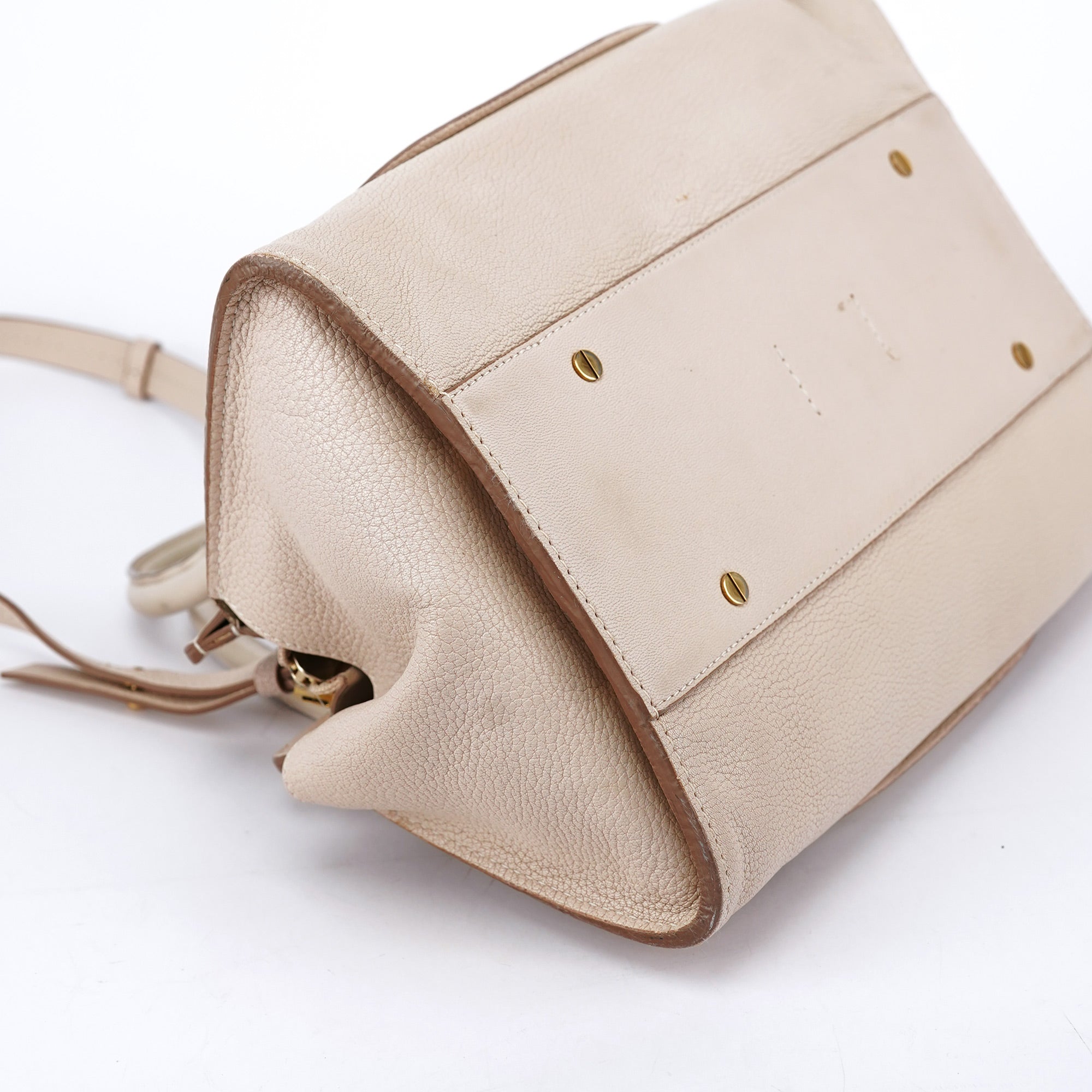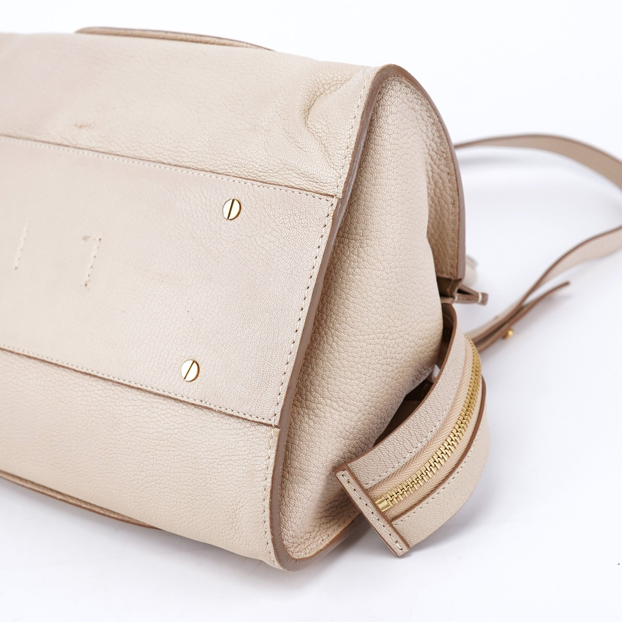 Designed in the 2010s under Clare Waight Keller, this Chloé tote is crafted from ivory grained leather with tonal smooth leather trim and structured rolled handles. Gold-tone hardware and a removable crossbody strap add versatility to the clean, architectural silhouette. The zip-top closure opens to a spacious fabric-lined interior with a zip pocket, blending practical design with understated elegance.