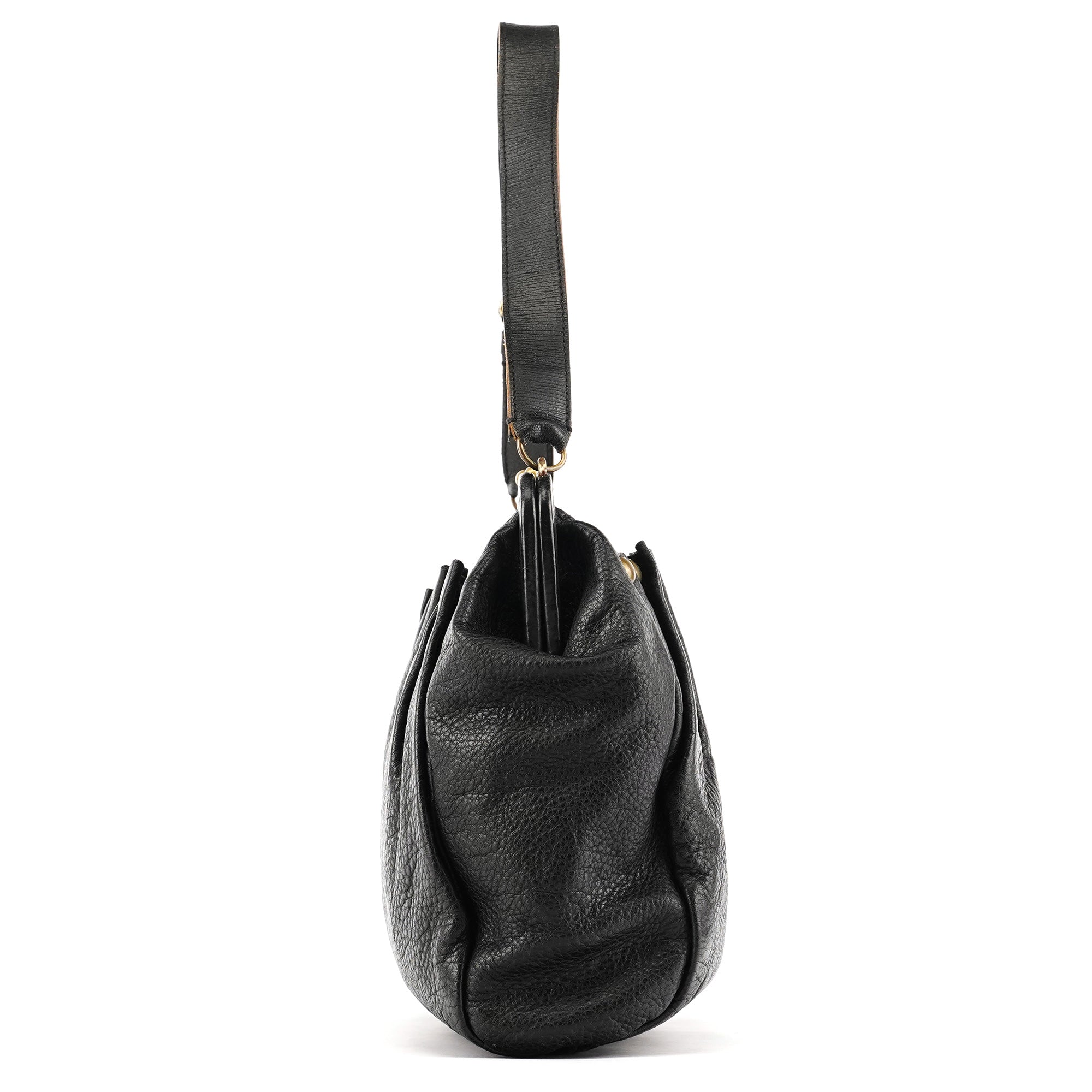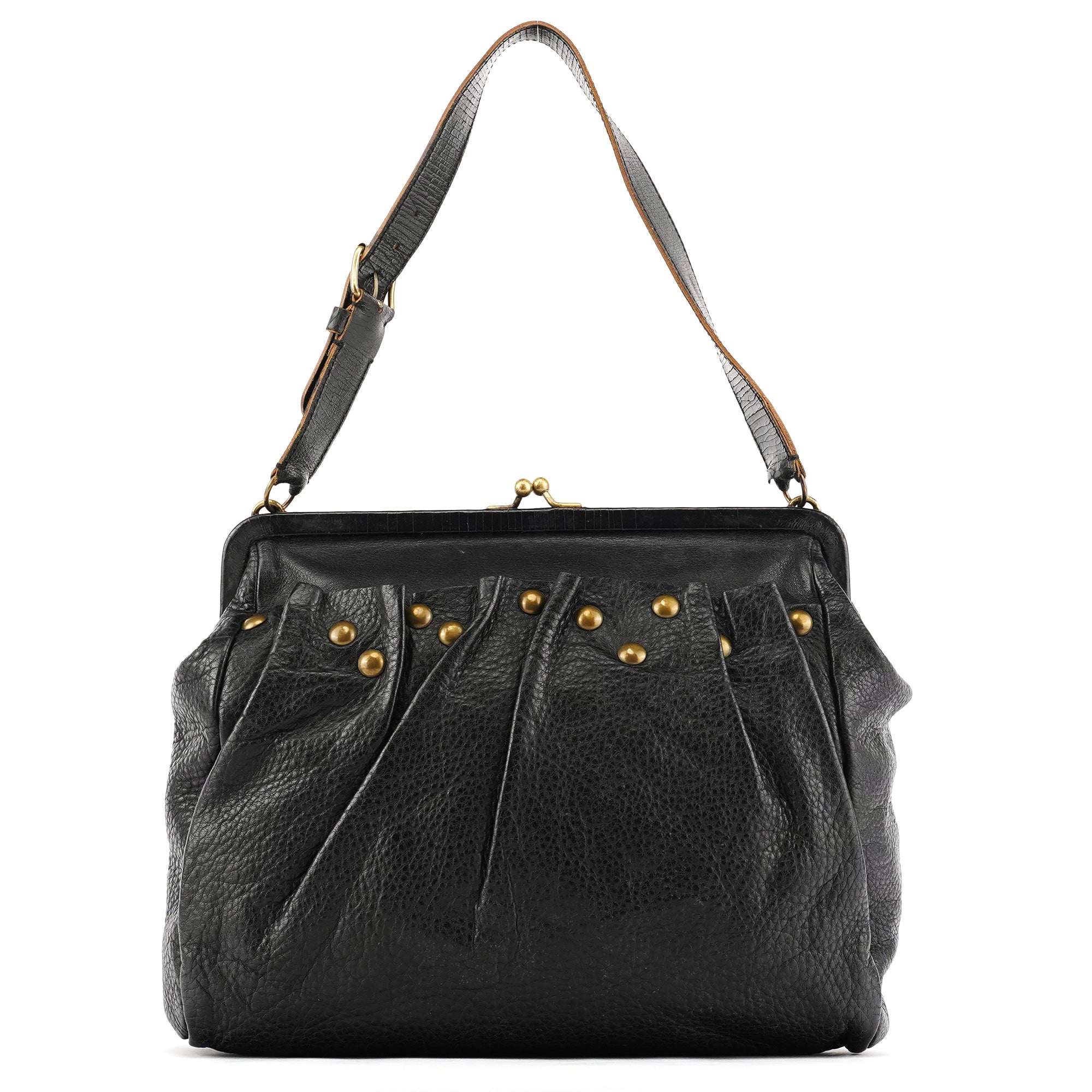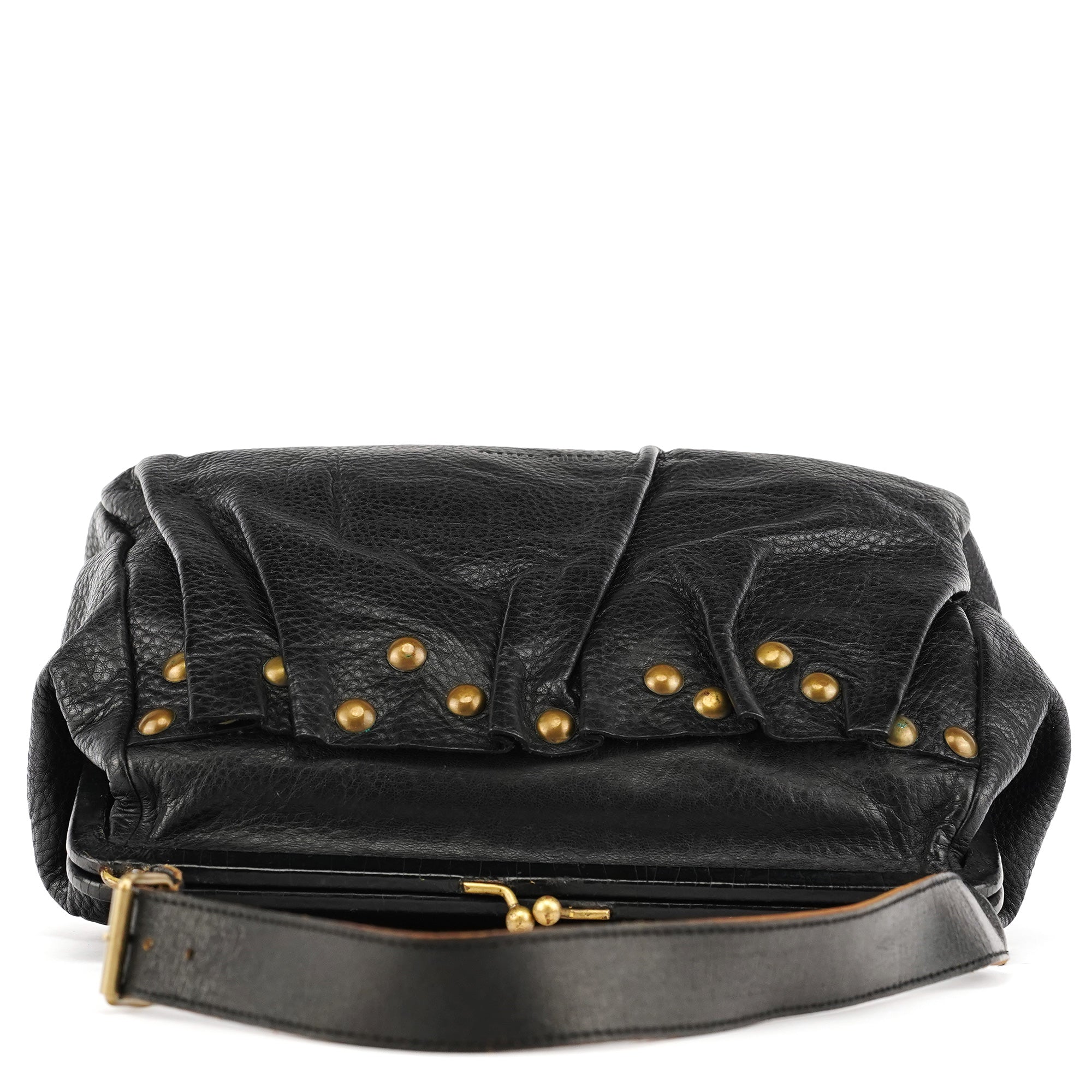 Designed in the early 2000s by Miuccia Prada, this Miu Miu shoulder bag is crafted from black calfskin leather with soft ruching and brass stud detailing. The structured frame opens with a kiss-lock closure, paired with an adjustable leather shoulder strap. The interior is finished in black nylon with a zip pocket.