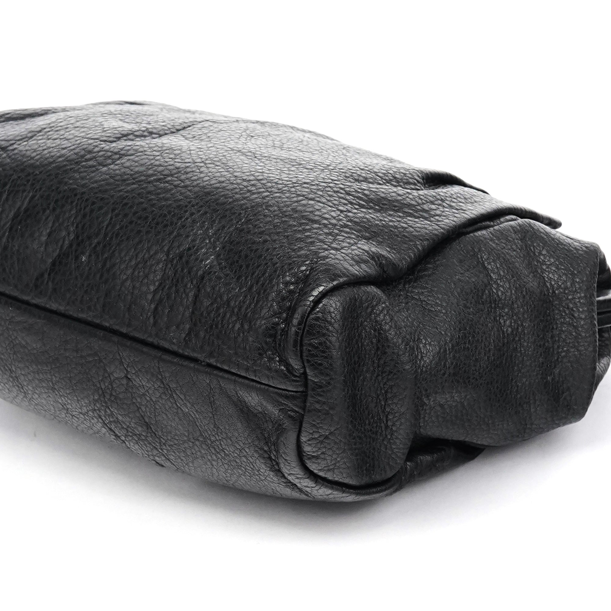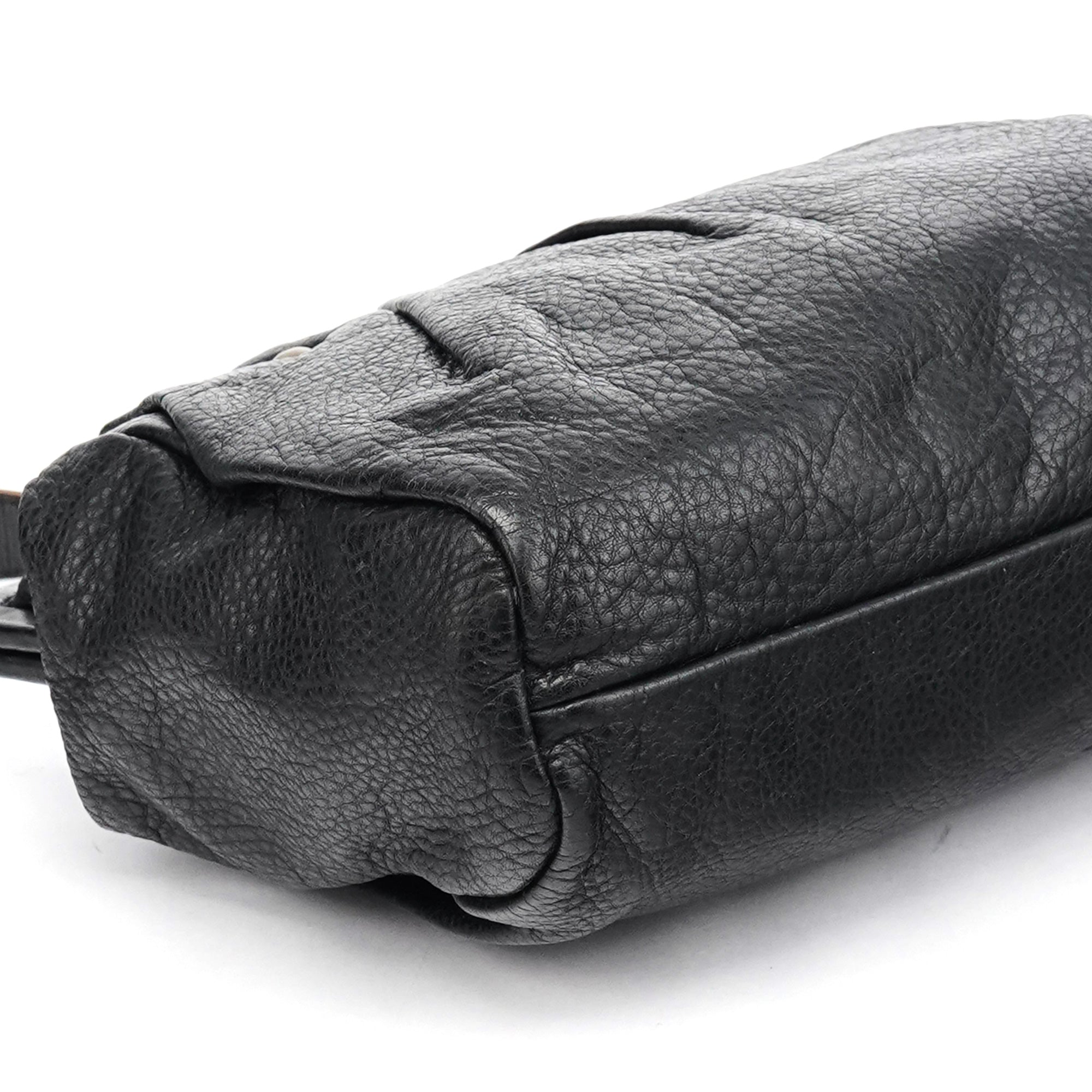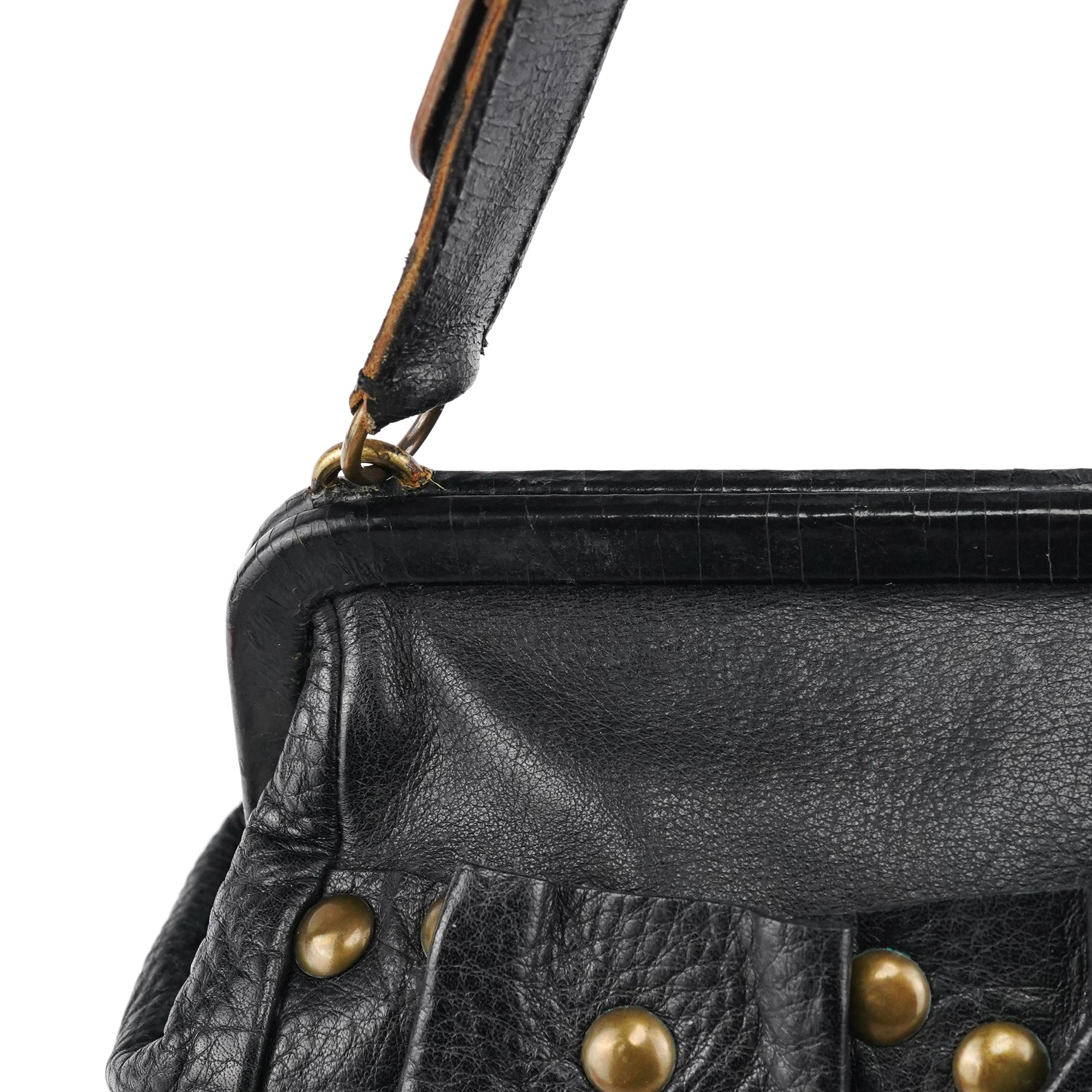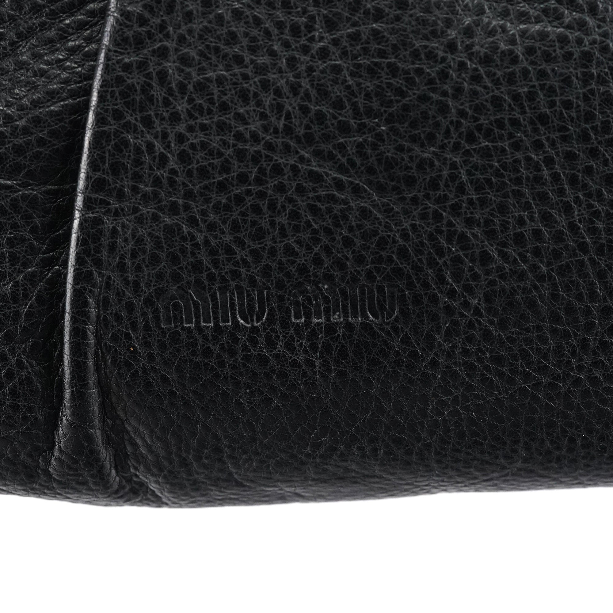 Designed in the early 2000s by Miuccia Prada, this Miu Miu shoulder bag is crafted from black calfskin leather with soft ruching and brass stud detailing. The structured frame opens with a kiss-lock closure, paired with an adjustable leather shoulder strap. The interior is finished in black nylon with a zip pocket.