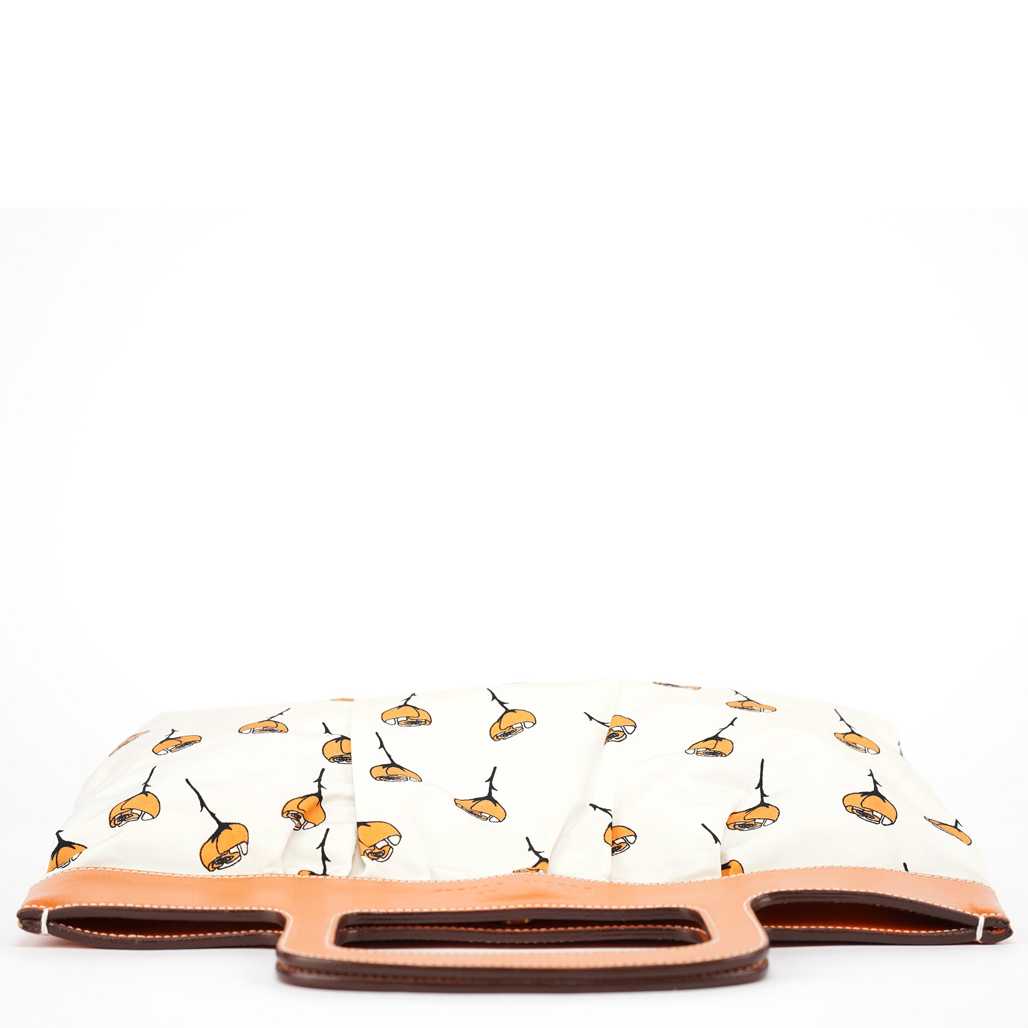 Designed in the mid-2000s by Miuccia Prada, this Miu Miu top handle clutch is crafted from white nylon with a playful allover floral print and tan leather trim. The sculptural top handle is integrated into the leather frame, while gentle pleating adds volume and softness to the silhouette. It features a magnetic closure and a fabric-lined interior with a zip pocket.