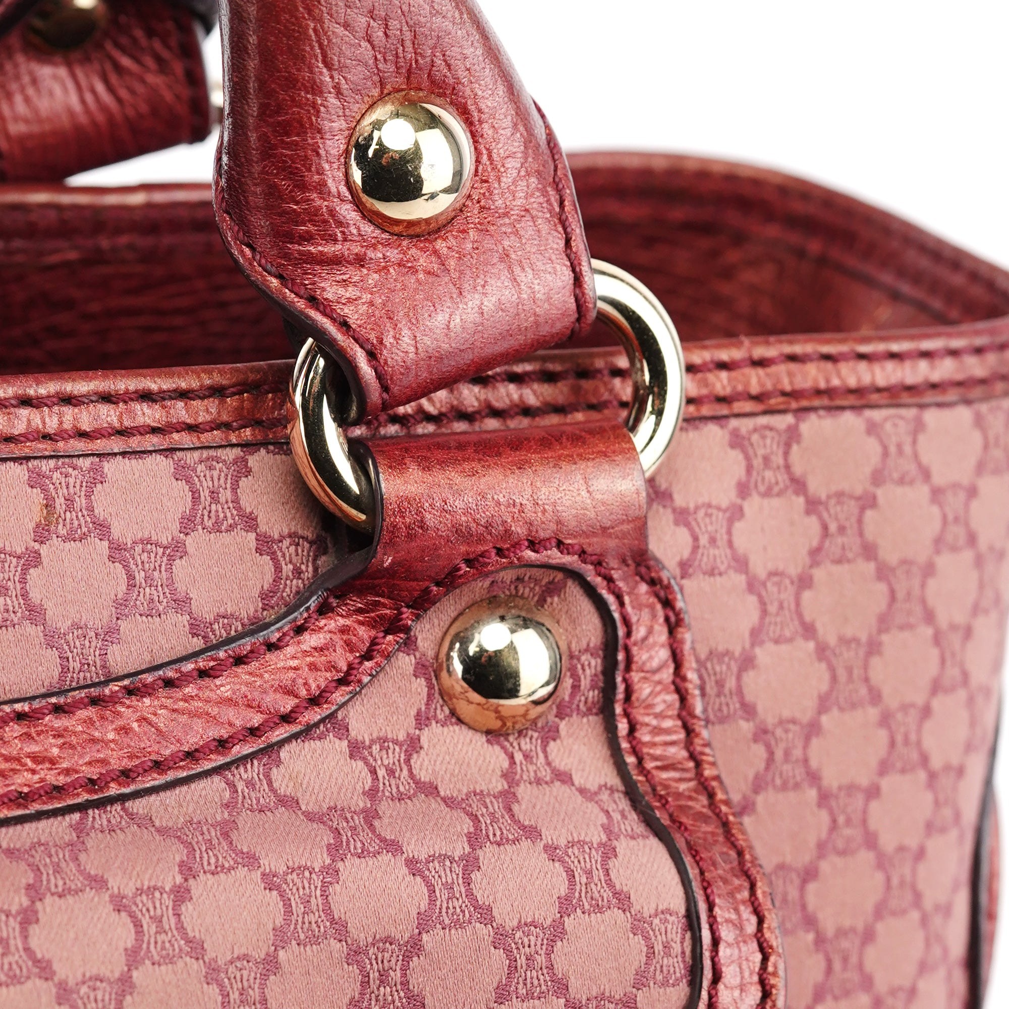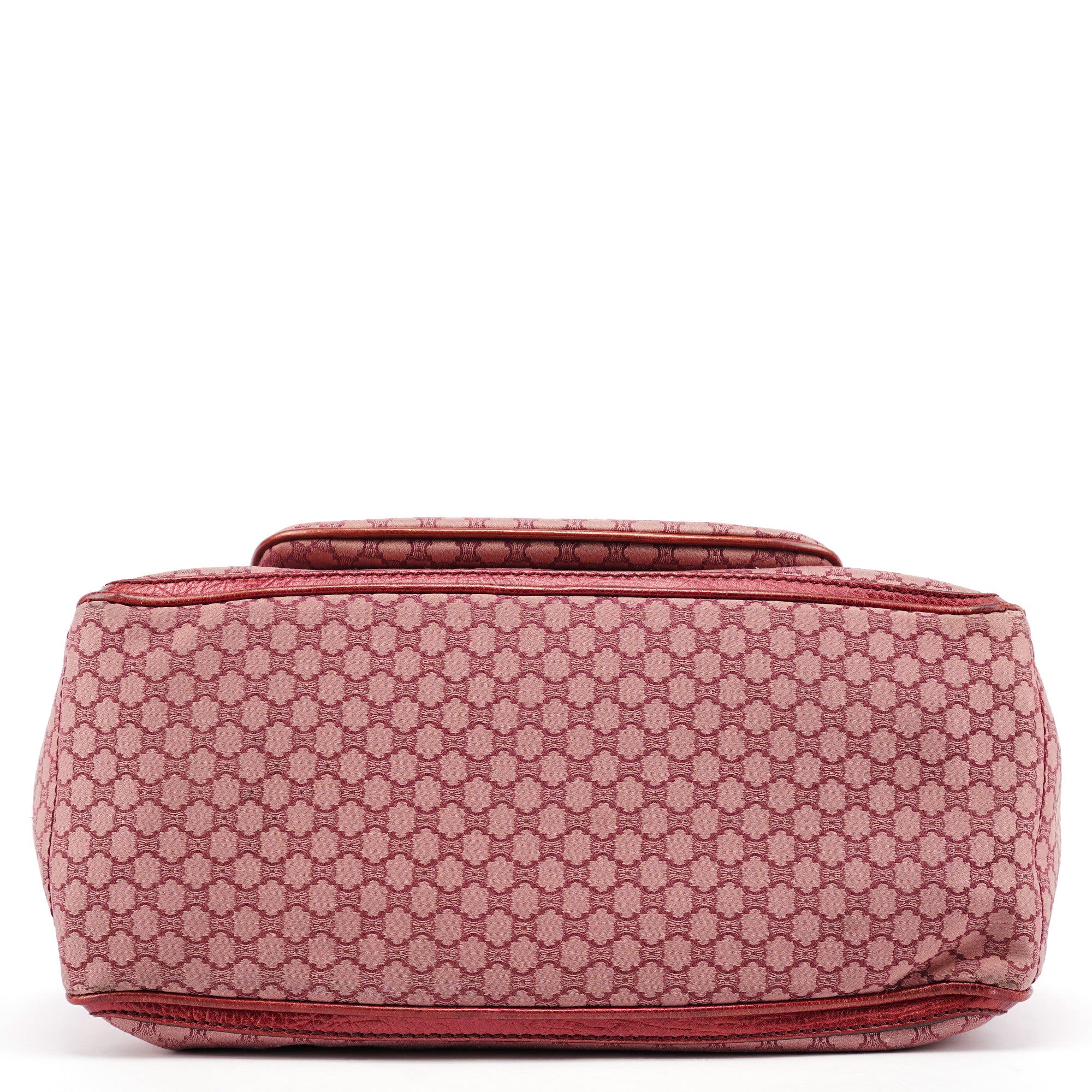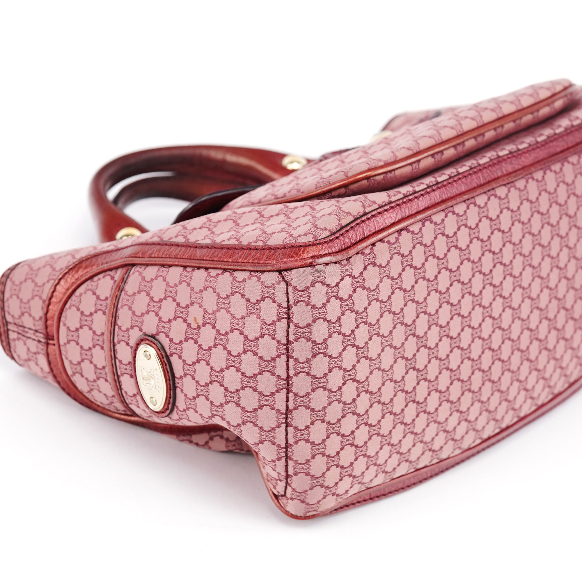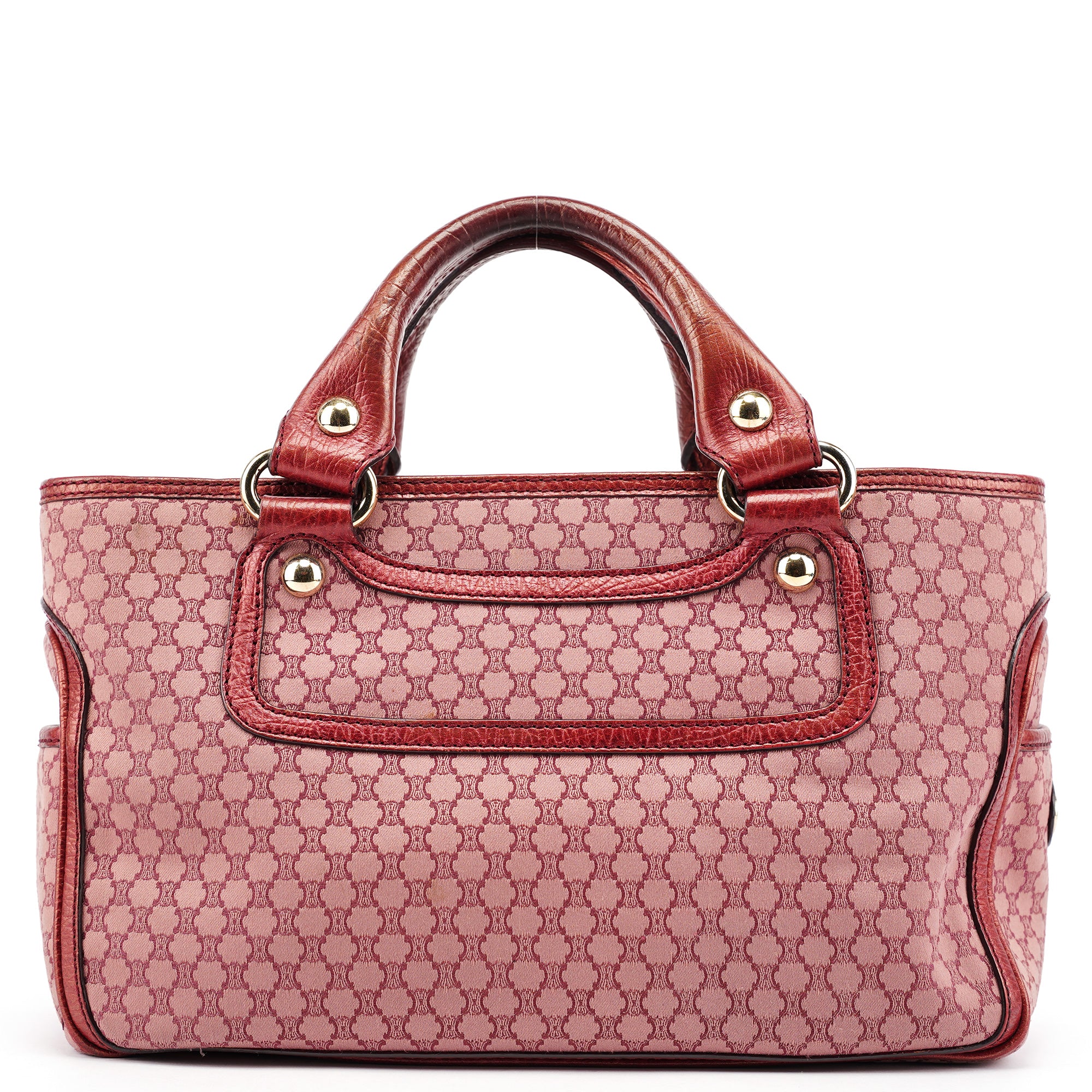 Designed in the early 2000s, this Celine Boogie tote is crafted in pink Macadam canvas with burgundy leather trim and gold-tone hardware. It features a structured silhouette with dual top handles, a front flap pocket with snap closure, open side pockets, and a spacious interior lined in fabric with an open pocket.