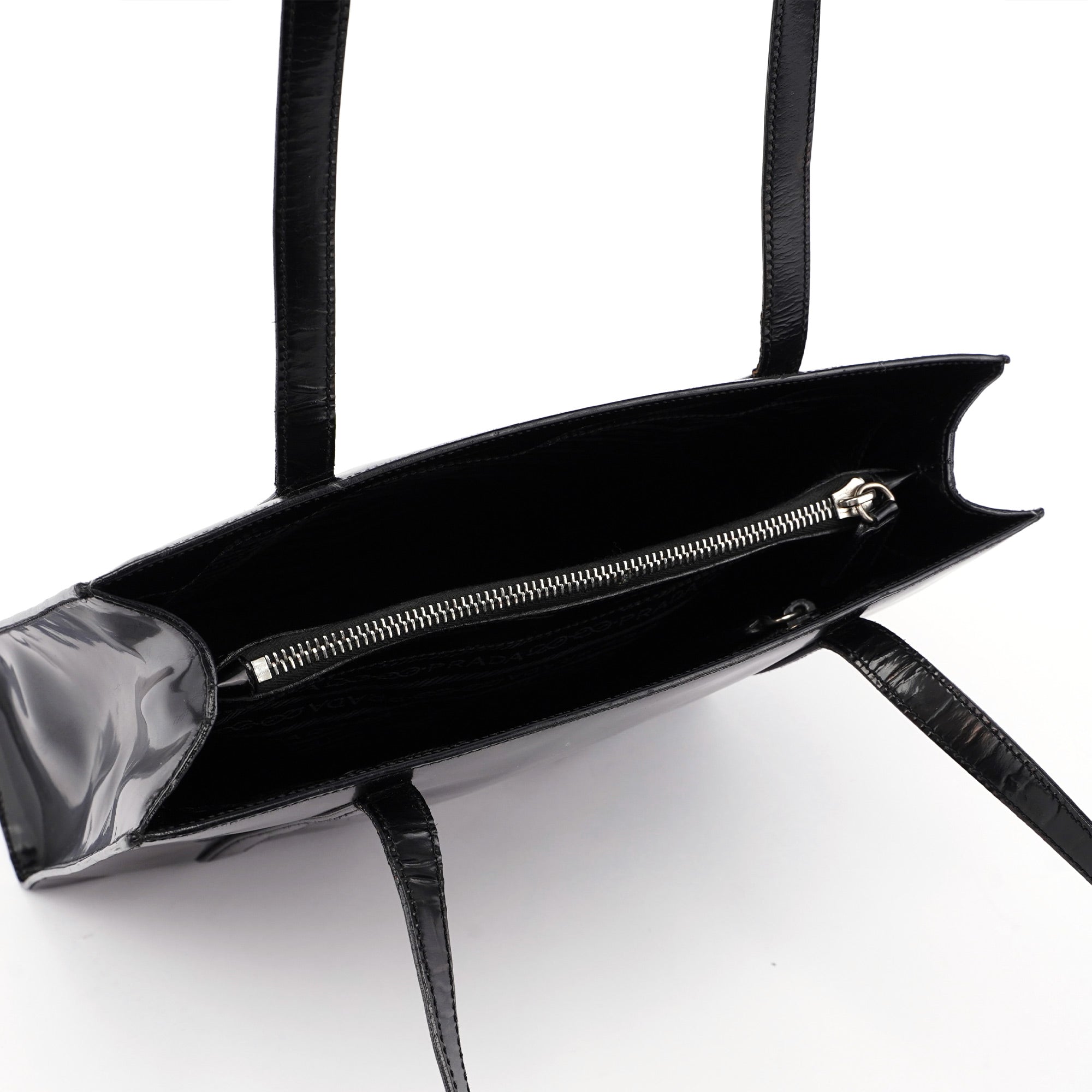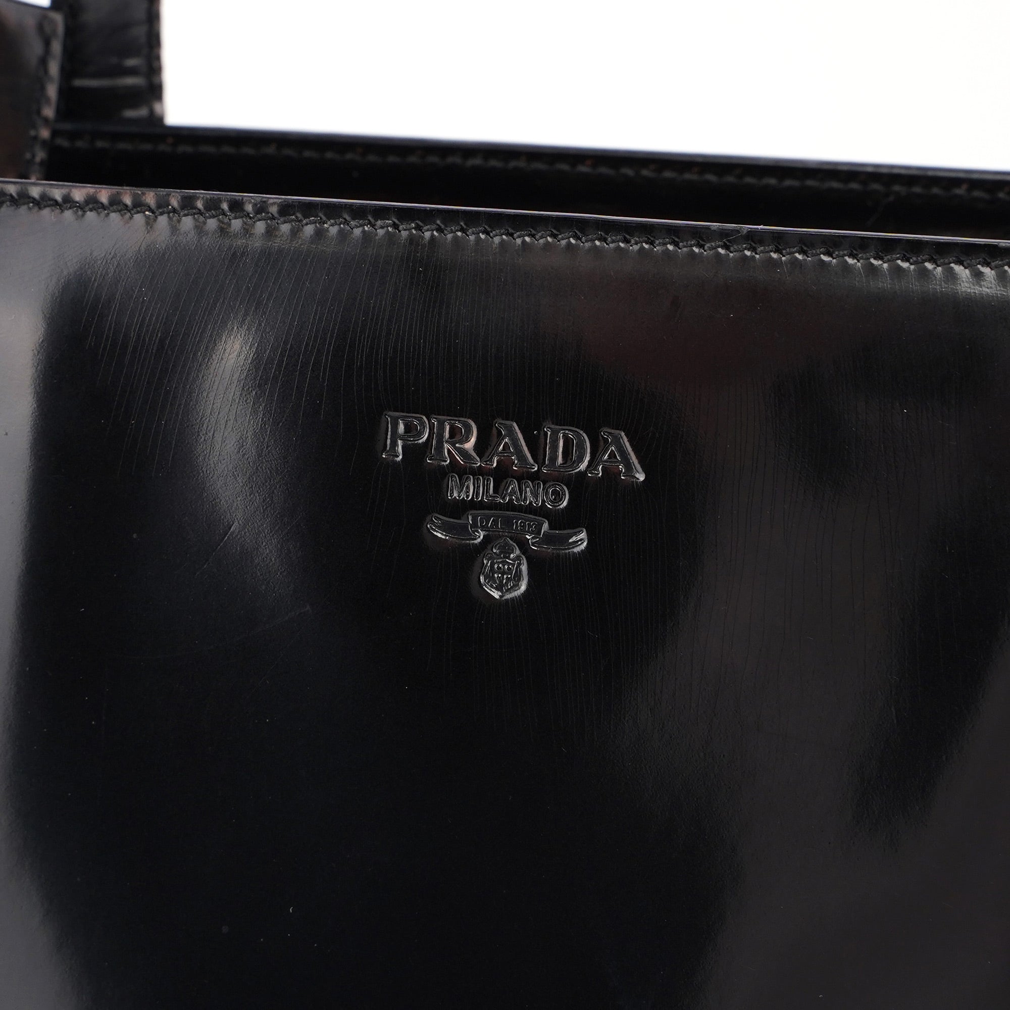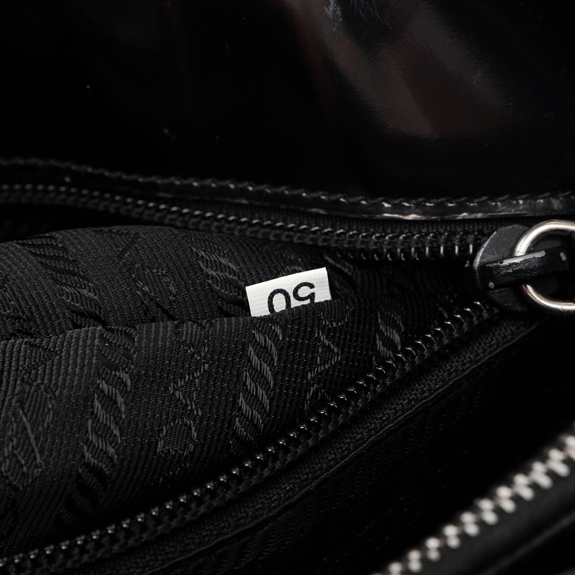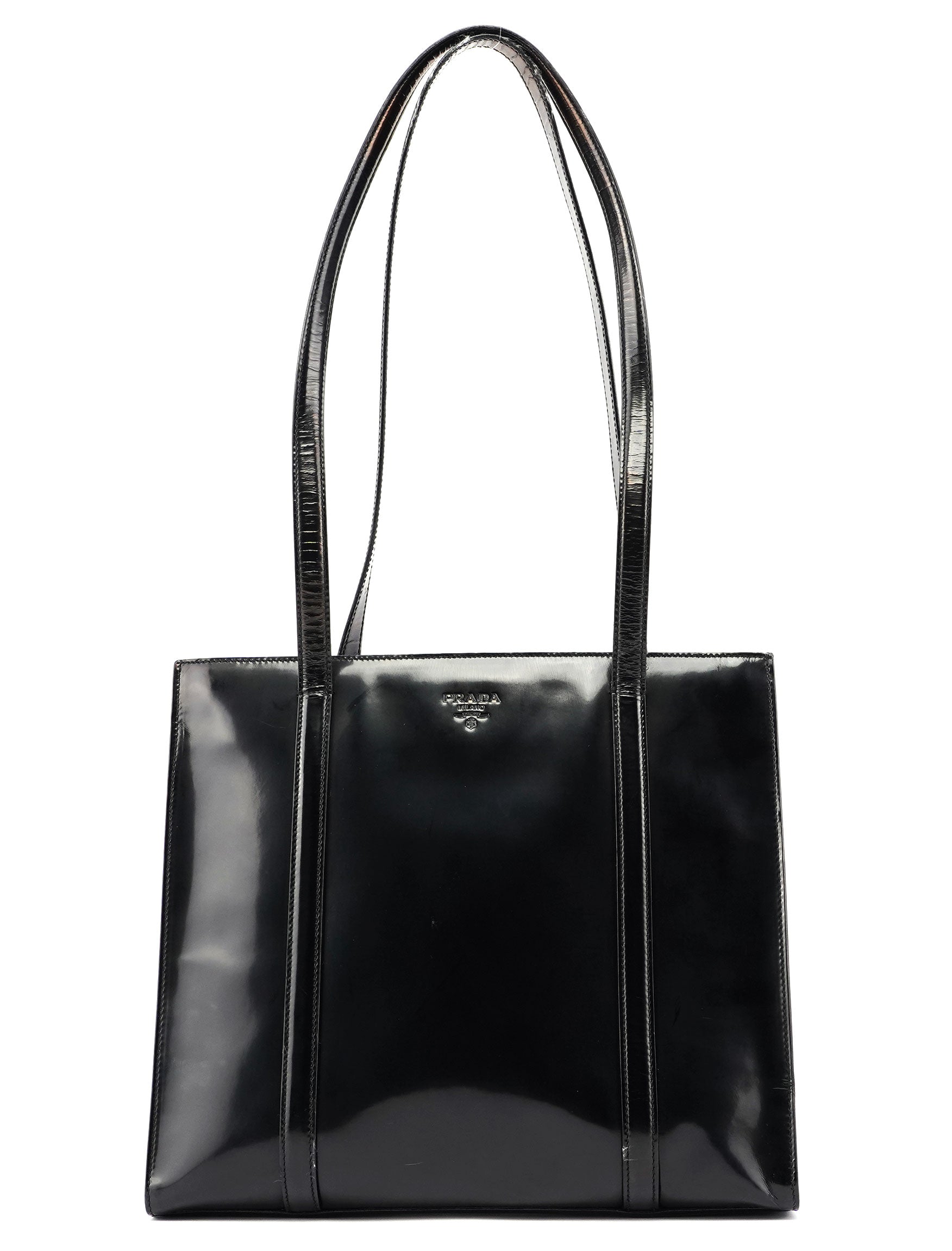 Designed by Miuccia Prada in 1995 and recently re-editioned, this original Prada Spazzolato tote bag is made from black patent leather with silver-tone hardware. It features three satin-lined interior compartments, including a zipper pocket, and the Prada logo embossed on the front, blending classic elegance with practicality.