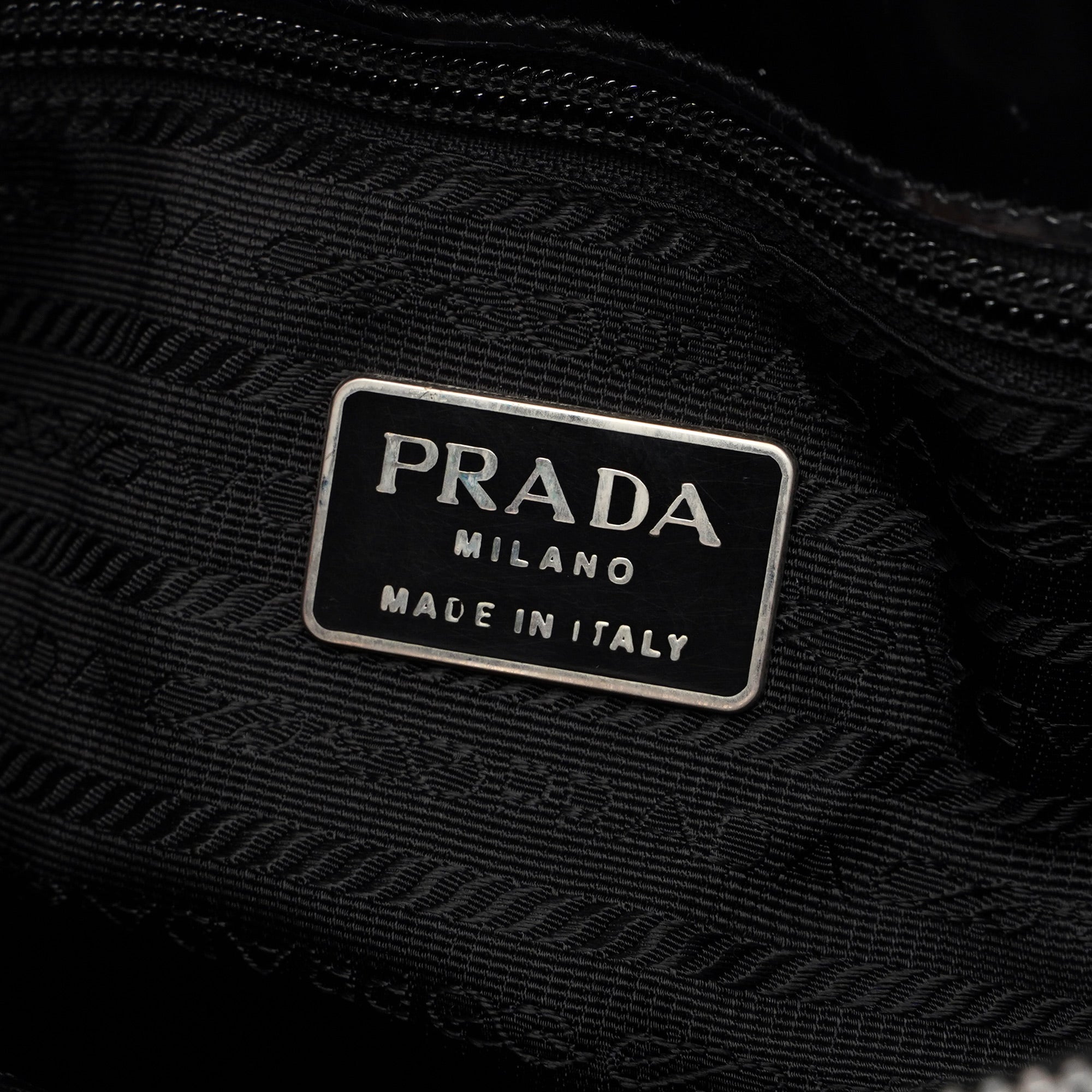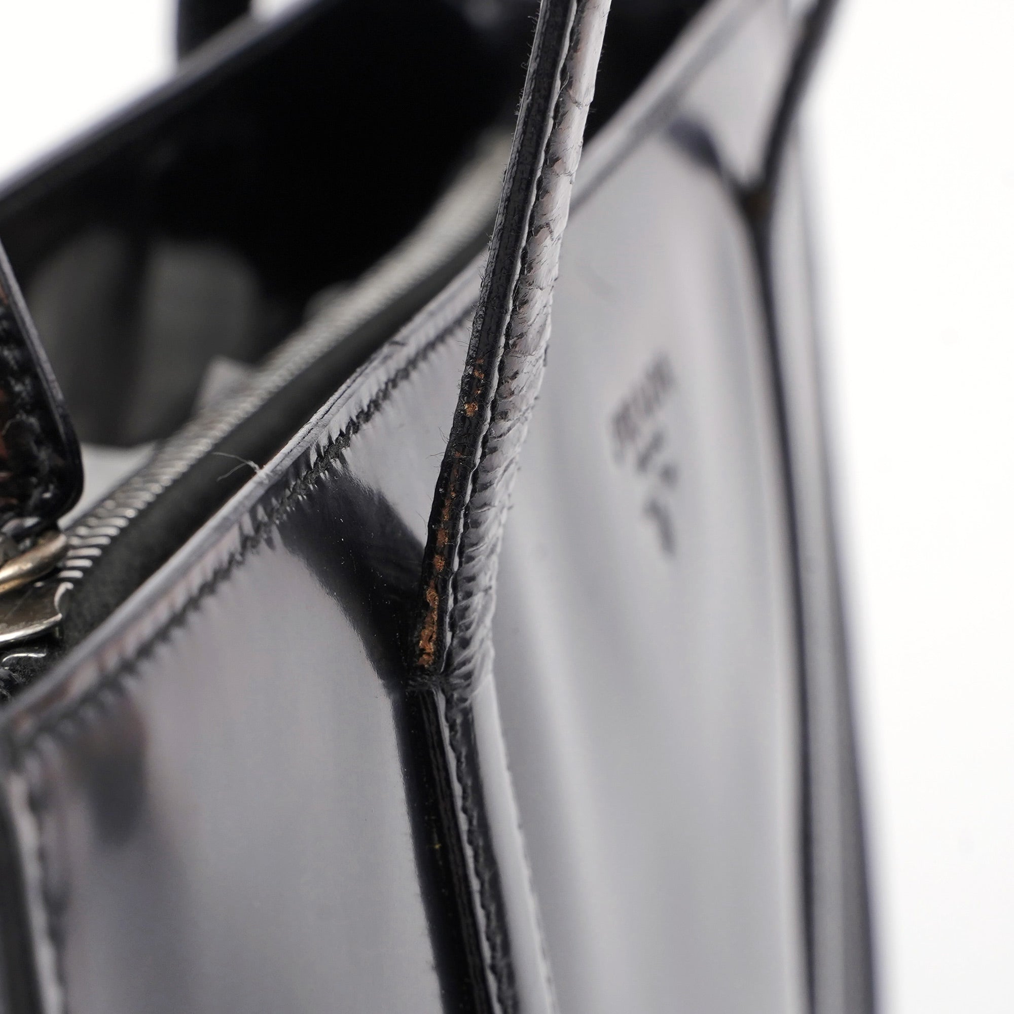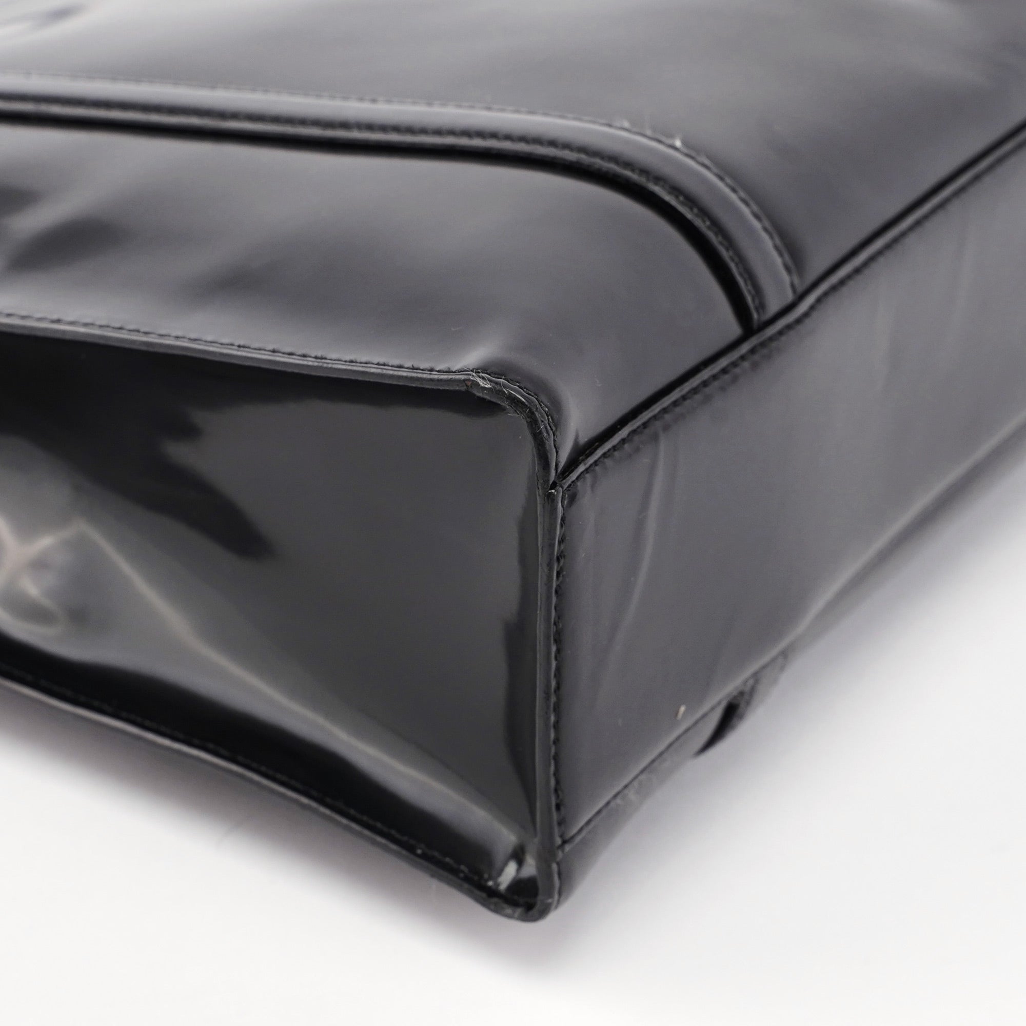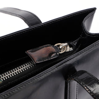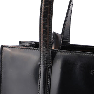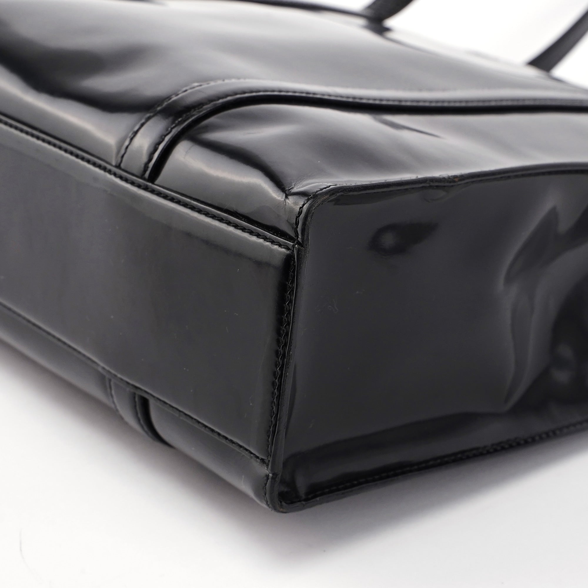 Designed by Miuccia Prada in 1995 and recently re-editioned, this original Prada Spazzolato tote bag is made from black patent leather with silver-tone hardware. It features three satin-lined interior compartments, including a zipper pocket, and the Prada logo embossed on the front, blending classic elegance with practicality.