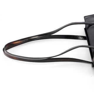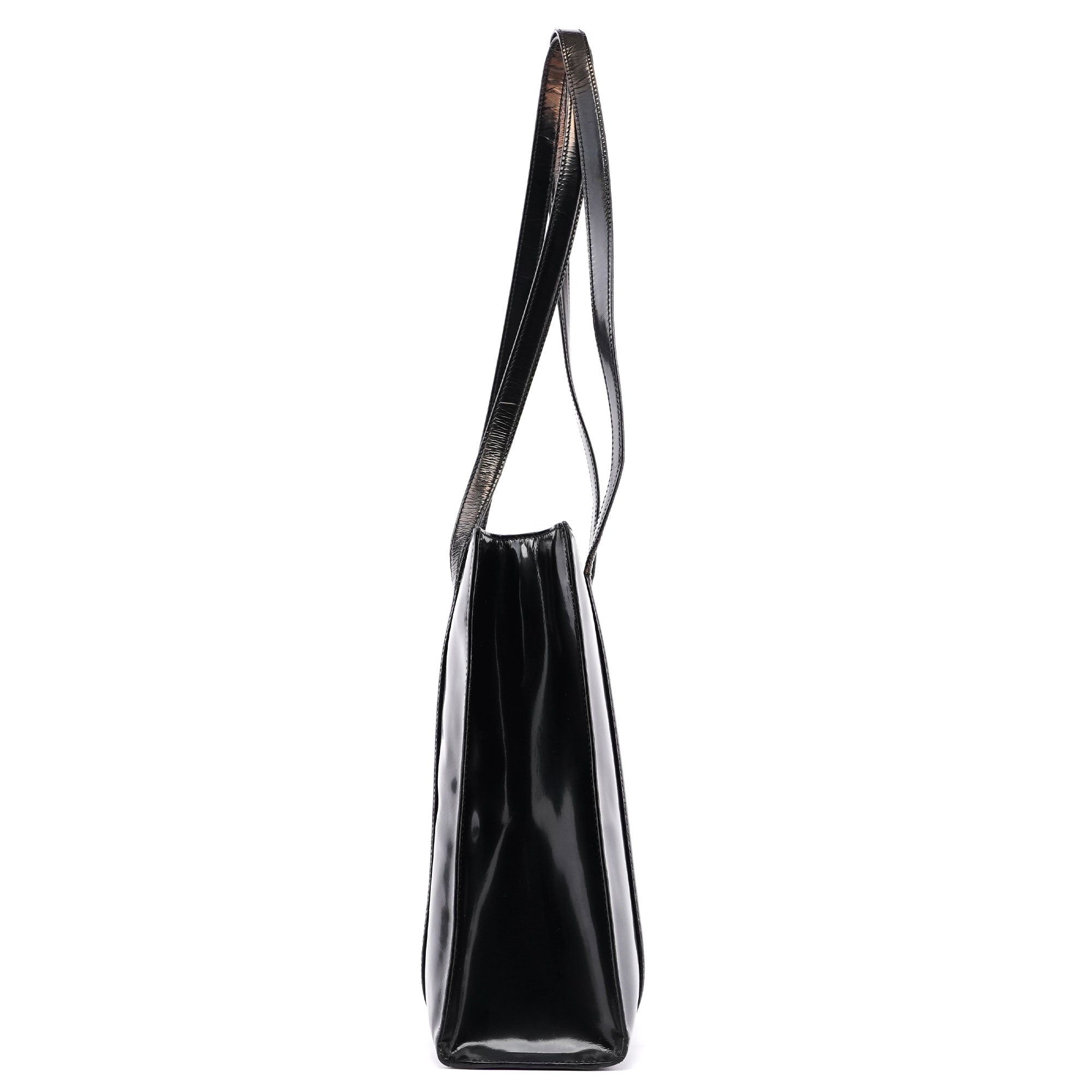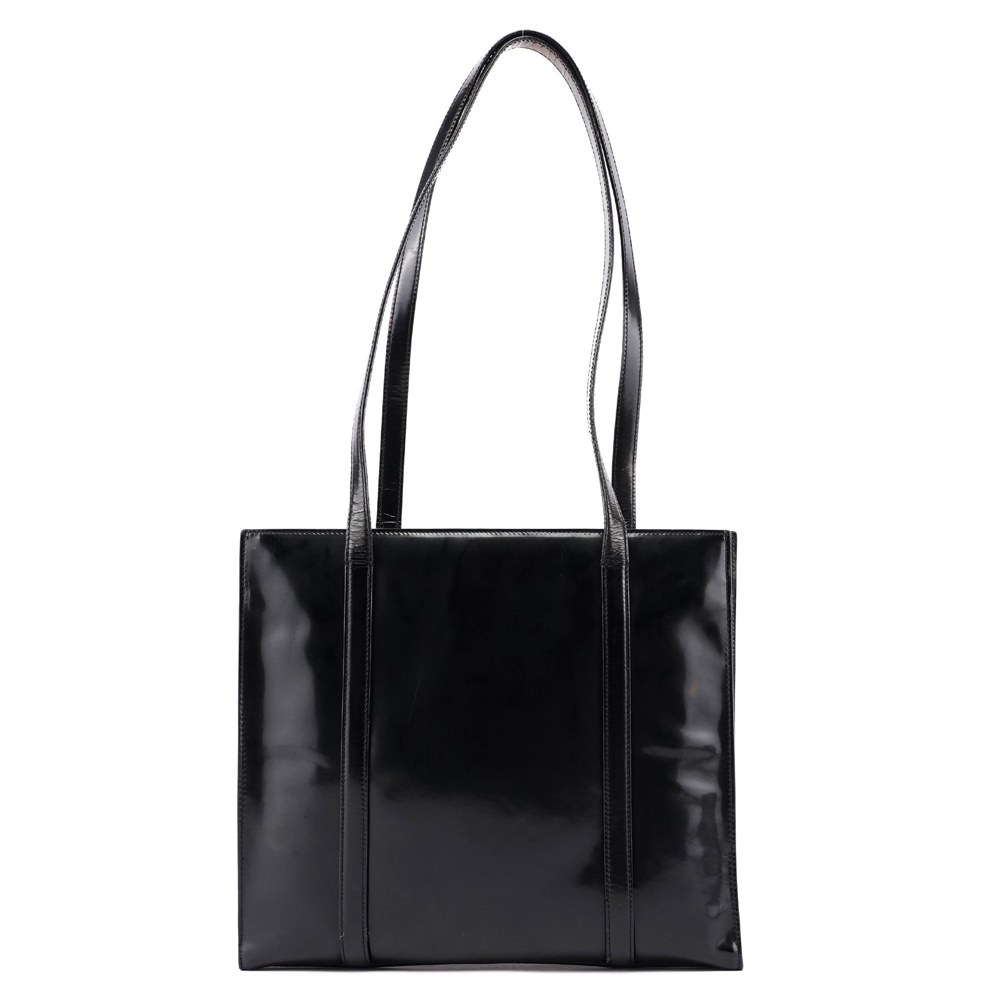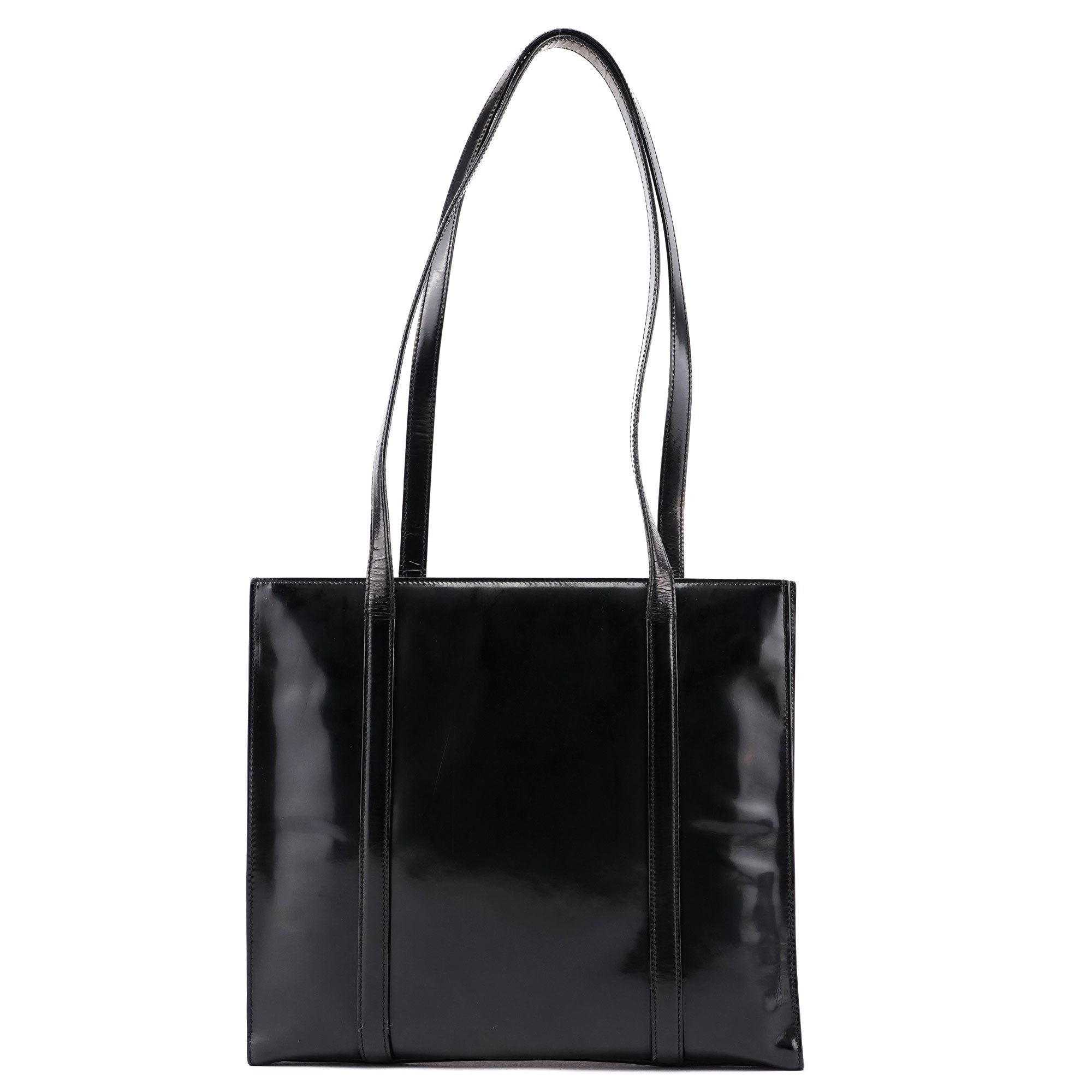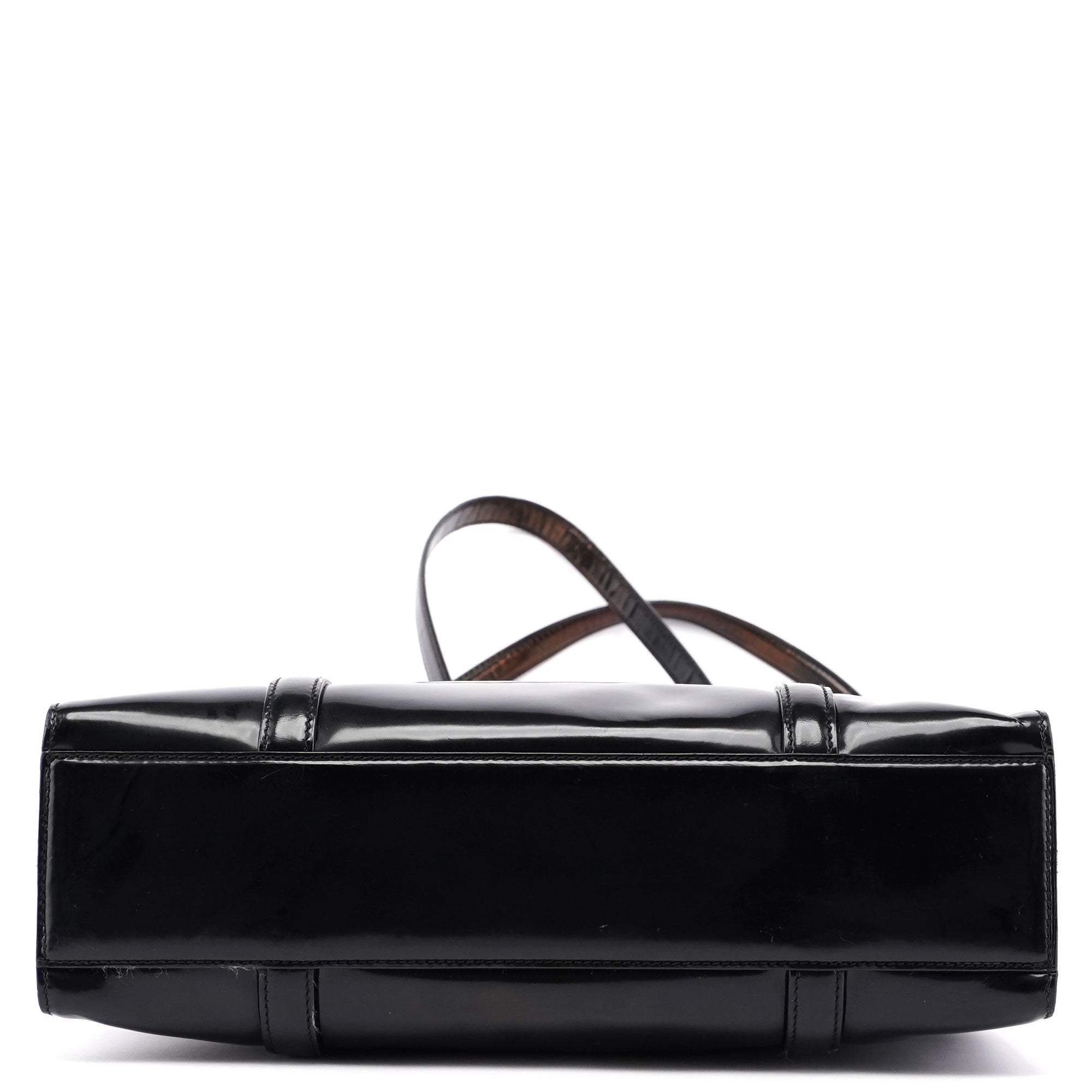 Designed by Miuccia Prada in 1995 and recently re-editioned, this original Prada Spazzolato tote bag is made from black patent leather with silver-tone hardware. It features three satin-lined interior compartments, including a zipper pocket, and the Prada logo embossed on the front, blending classic elegance with practicality.