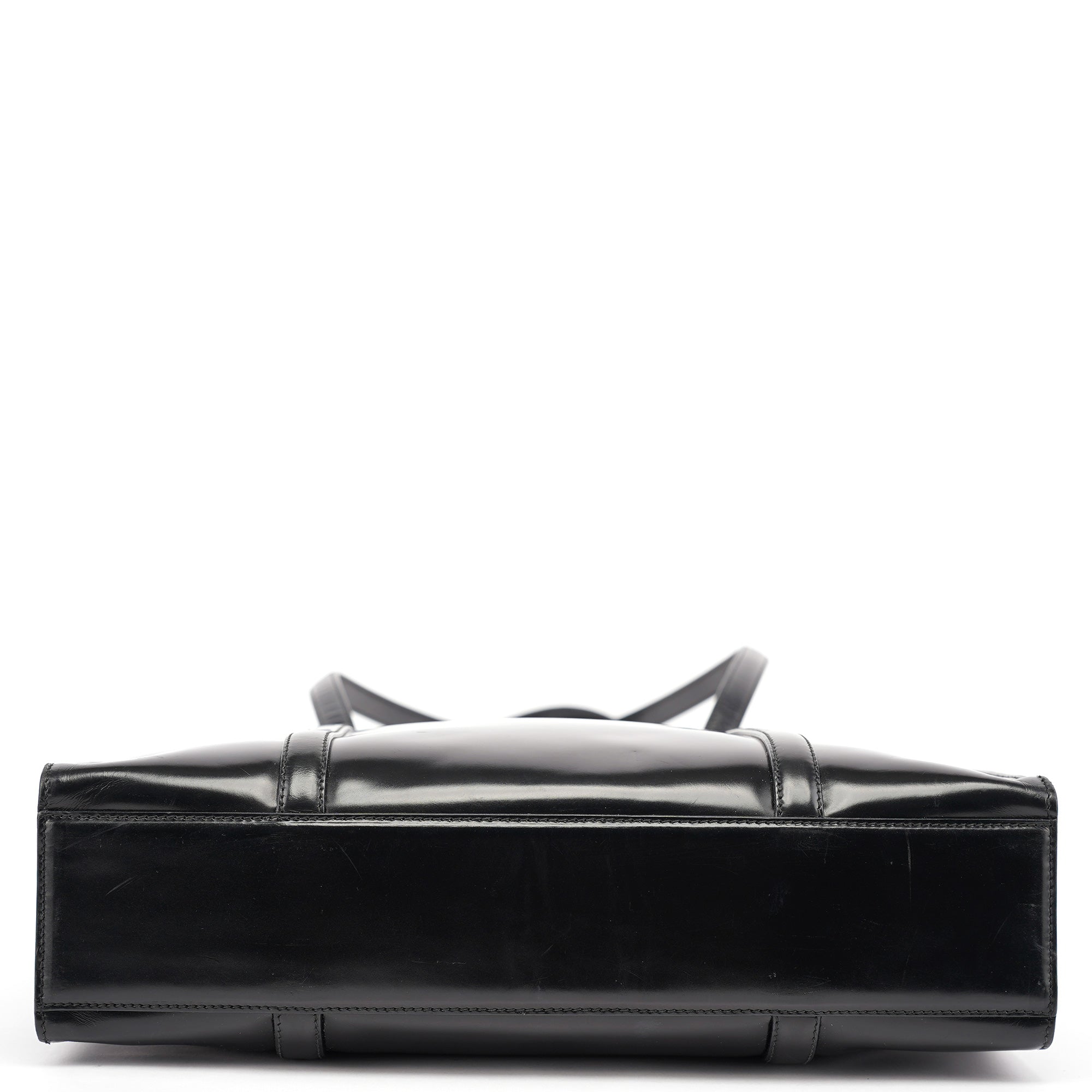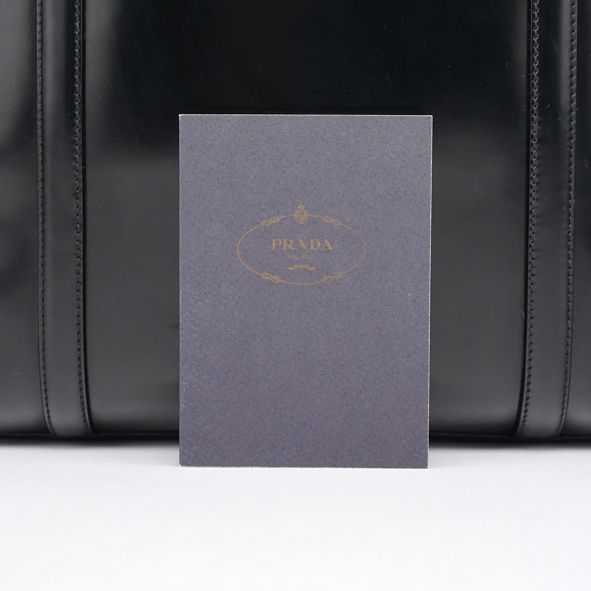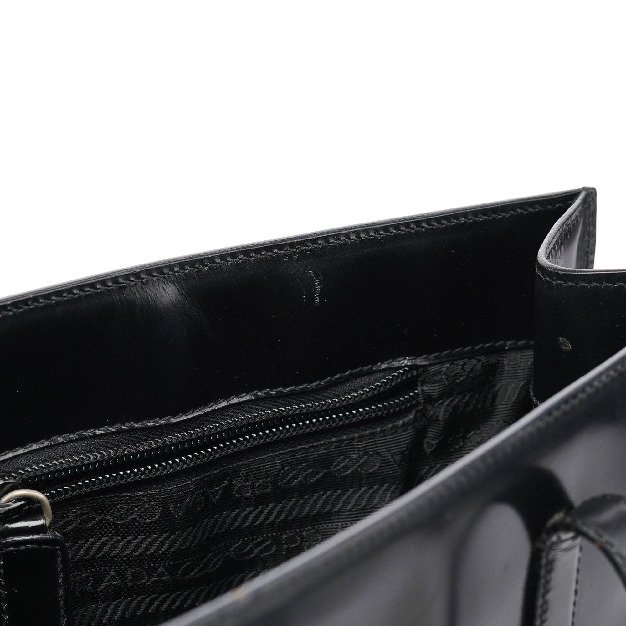 Designed in 1995 by Miuccia Prada, this Spazzolato Prada tote bag is crafted in glossy black Spazzolato patent leather with a structured silhouette and dual rolled handles. It features a secure top-zip closure and opens to a logo-jacquard–lined interior—complete with two zip pockets. Finished with the Prada logo debossed on the front.
