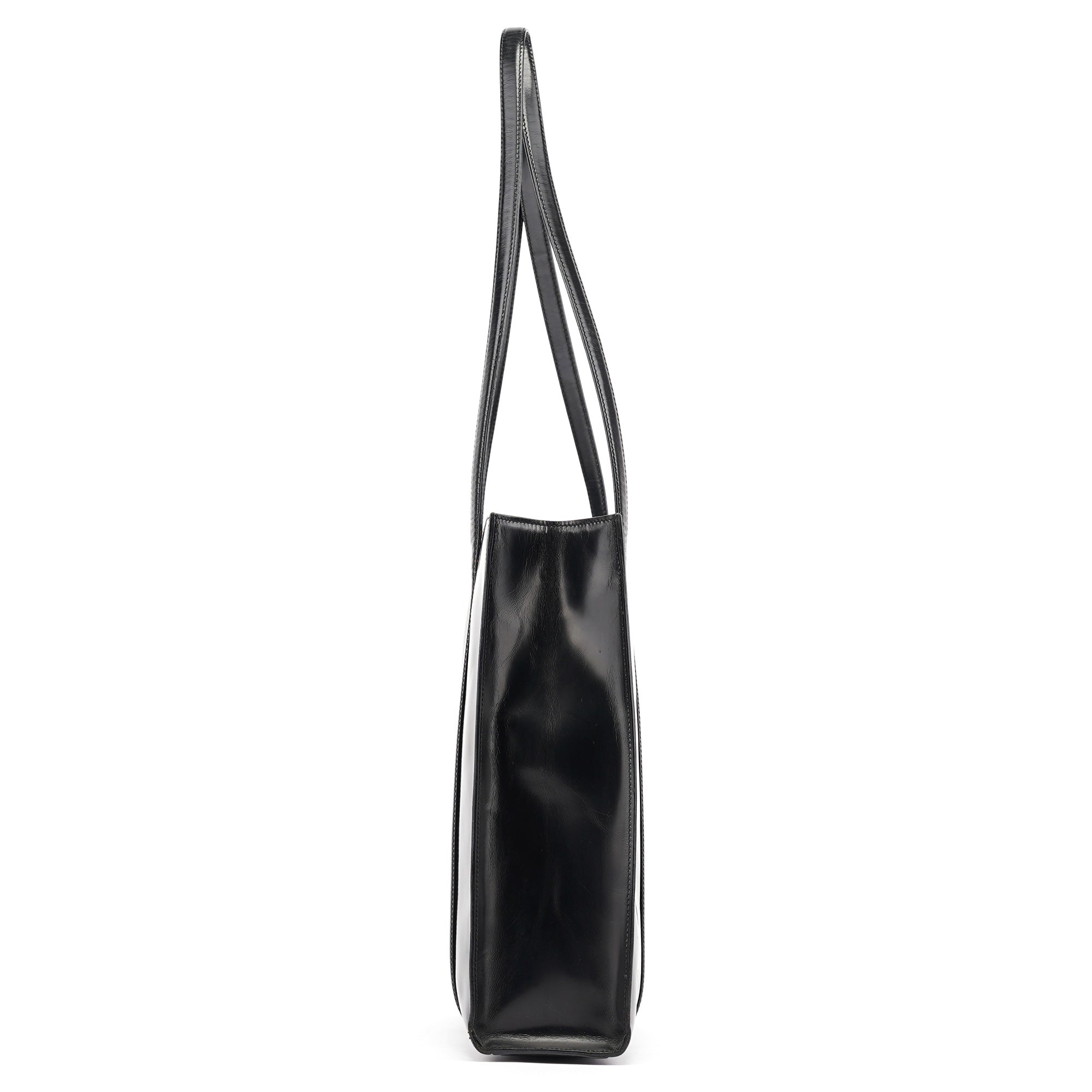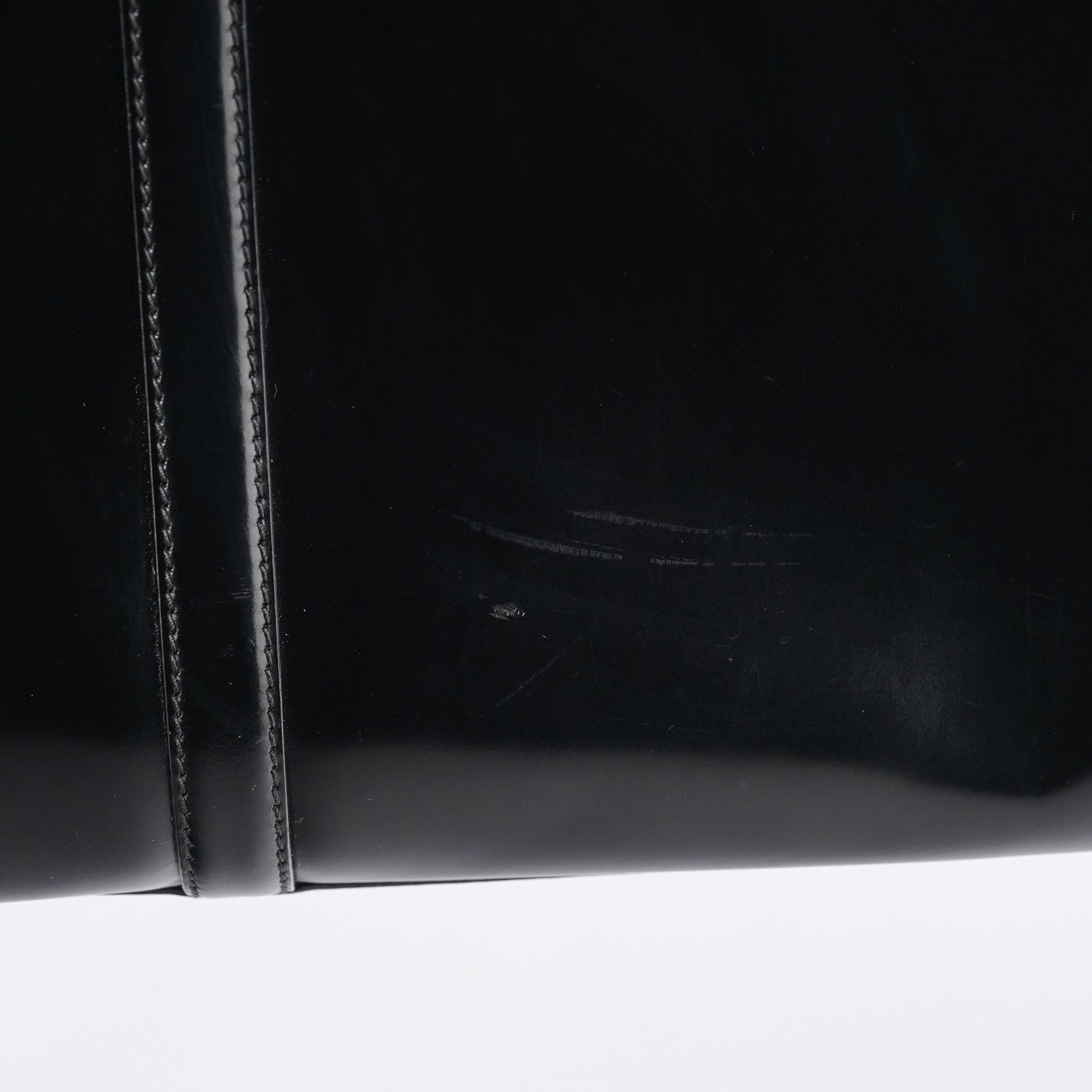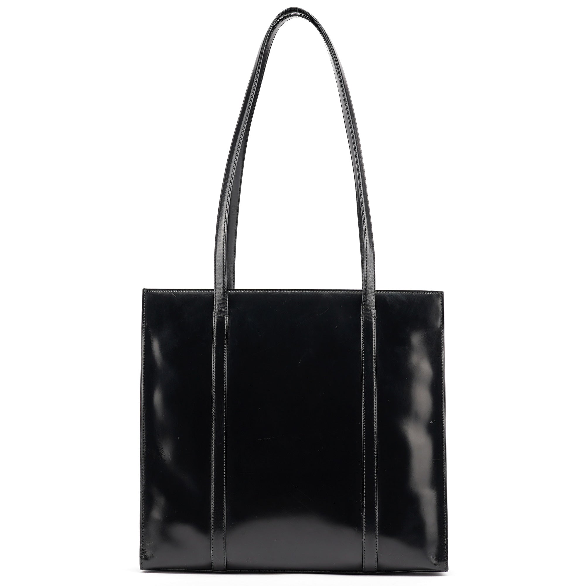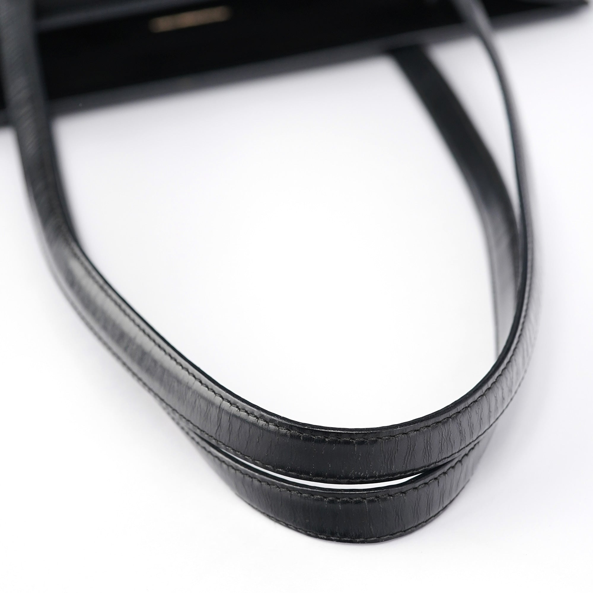 Designed in 1995 by Miuccia Prada, this Spazzolato Prada tote bag is crafted in glossy black Spazzolato patent leather with a structured silhouette and dual rolled handles. It features a secure top-zip closure and opens to a logo-jacquard–lined interior—complete with two zip pockets. Finished with the Prada logo debossed on the front.