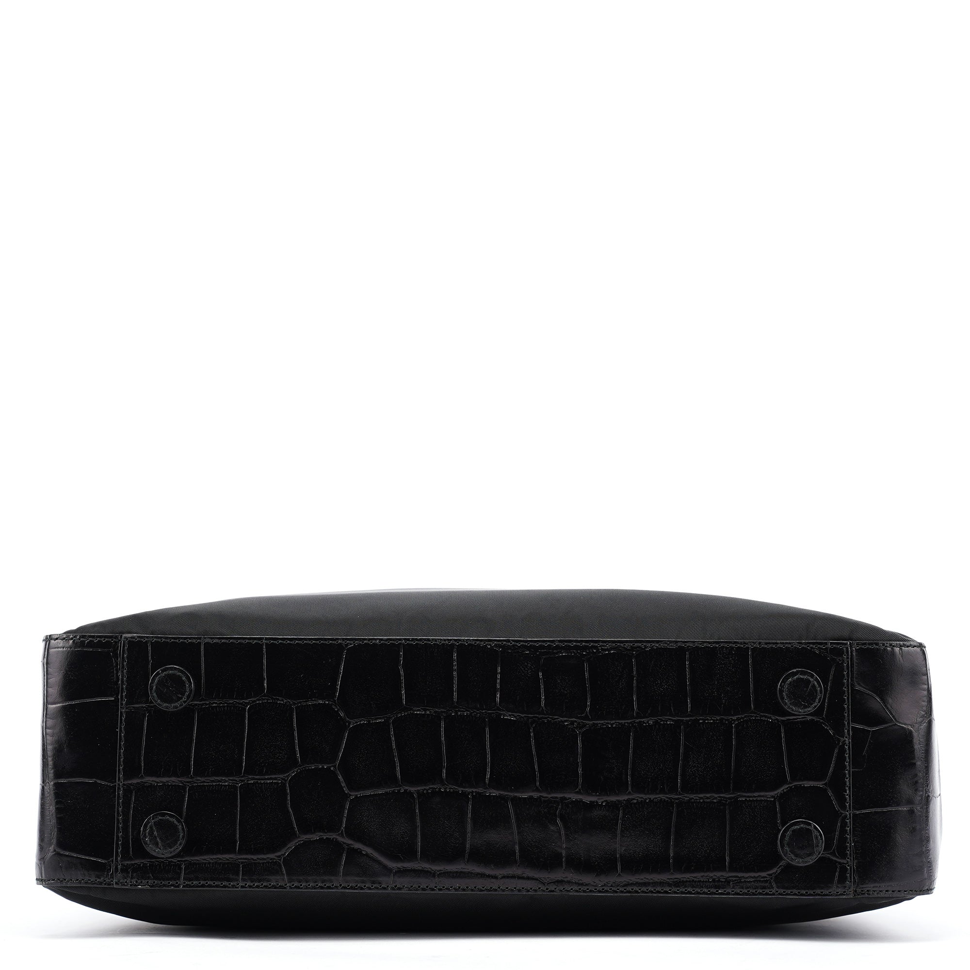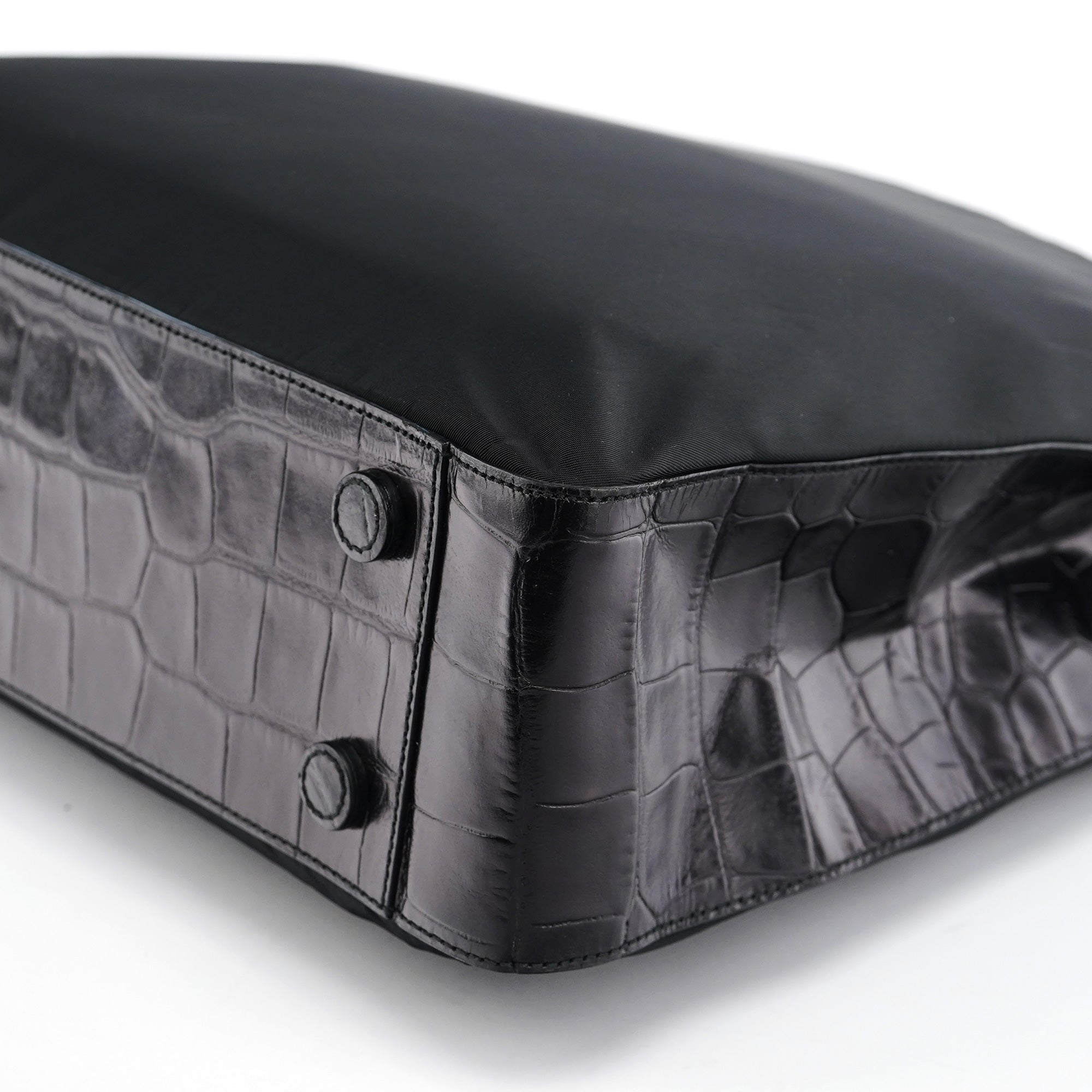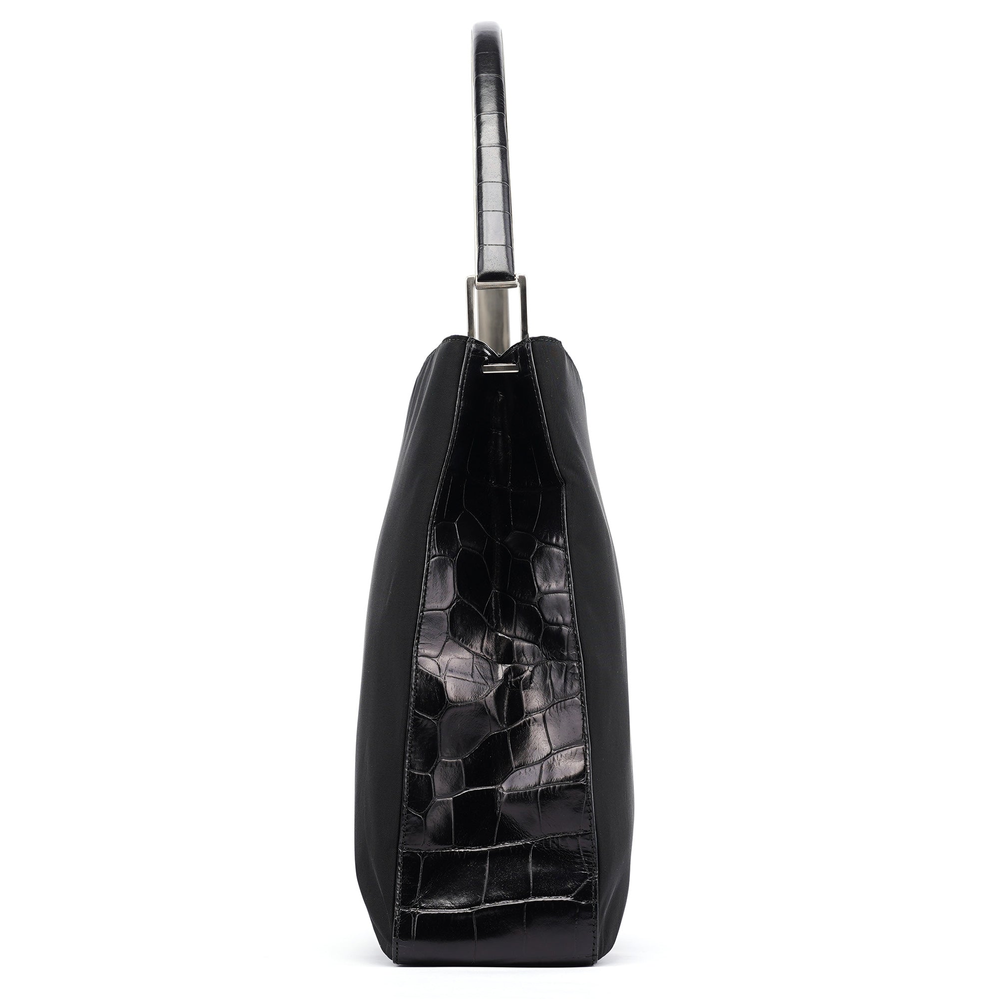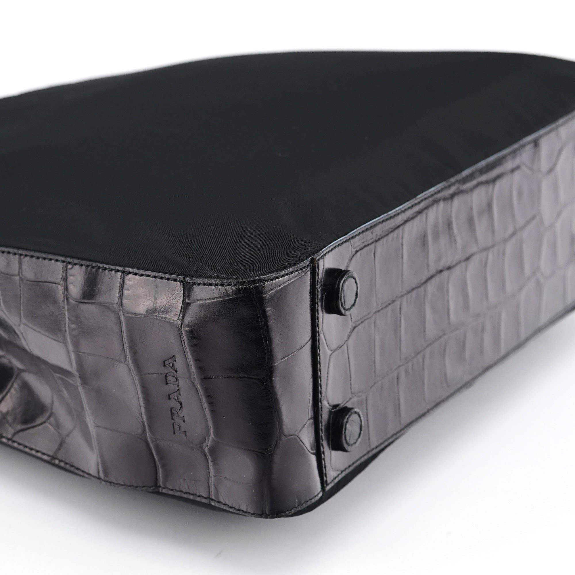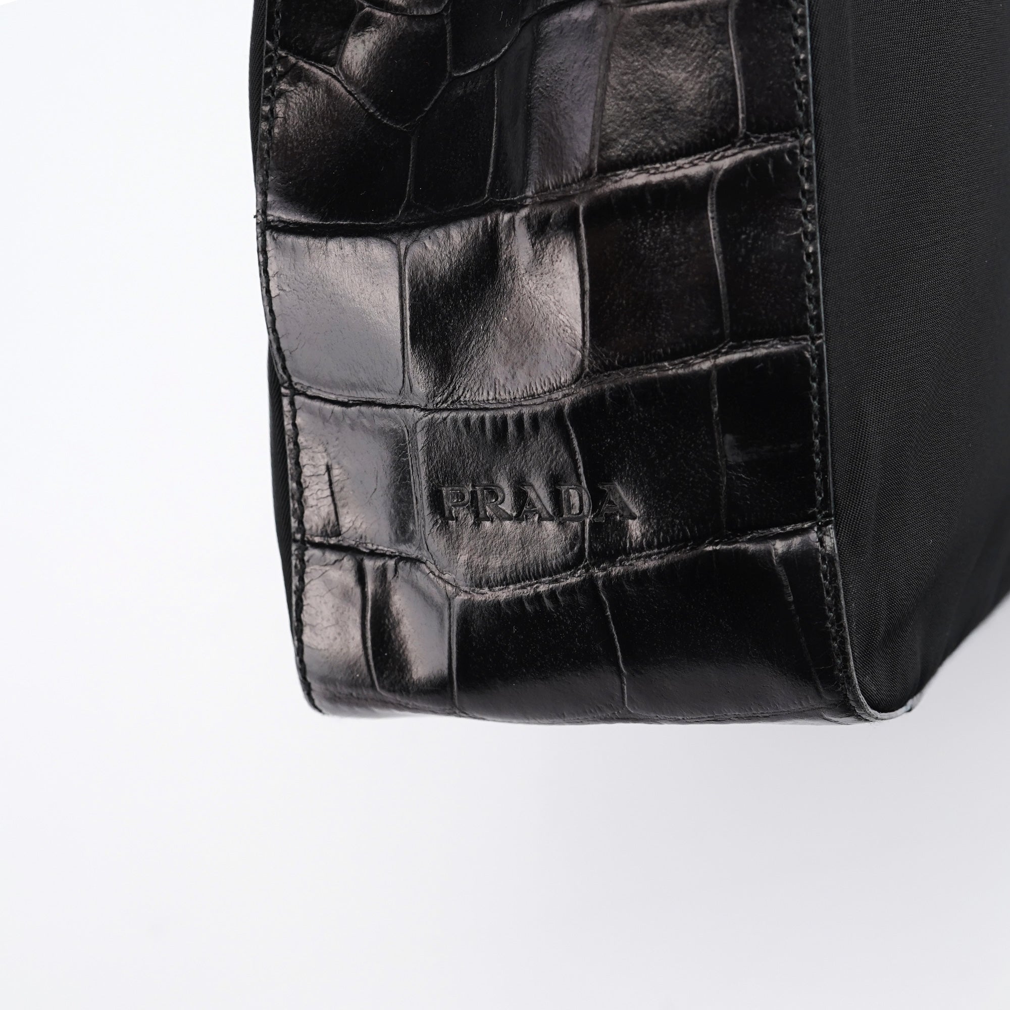 Designed in 1998 by Miuccia Prada, this vintage Prada Tessuto Coco tote bag features black Tessuto nylon with a crocodile-embossed leather trim. The structured silhouette includes a metal handle in a silver tone and three spacious interior compartments lined with matching Tessuto fabric. The bag is finished with the signature Prada logo debossed on the side.