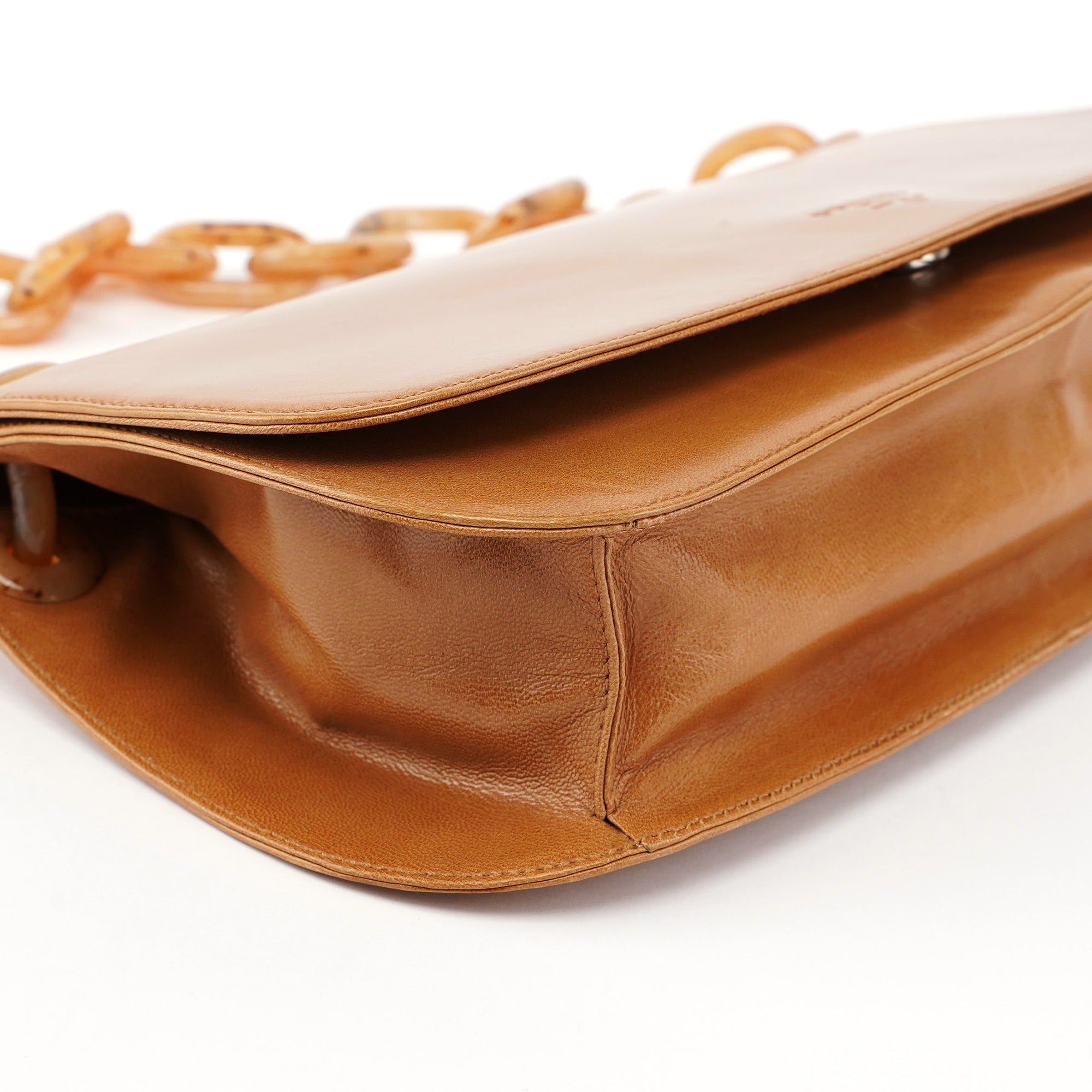 This Prada Madras Swing bag, designed by Miuccia Prada in the mid-1990s, is handcrafted in beige calfskin leather. It features a unique light tortoise plastic chain with Prada logo engraving and a secure magnetic flap closure. The interior, lined with satin, includes an zipper pocket. An embossed Prada logo at the front subtly brands this elegant accessory.