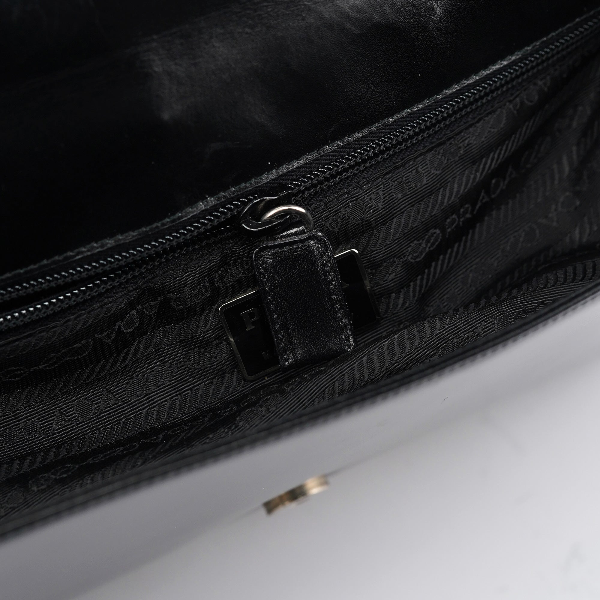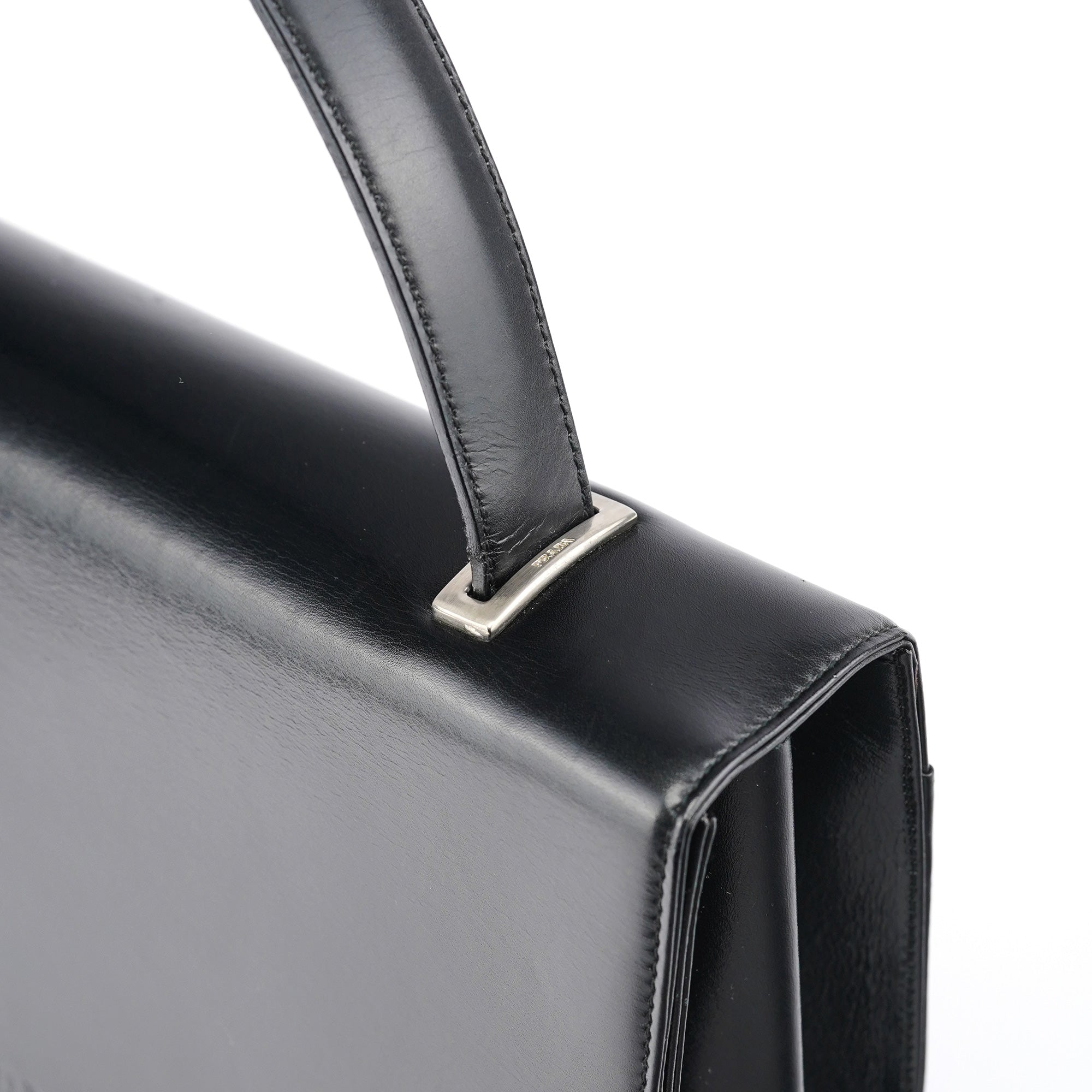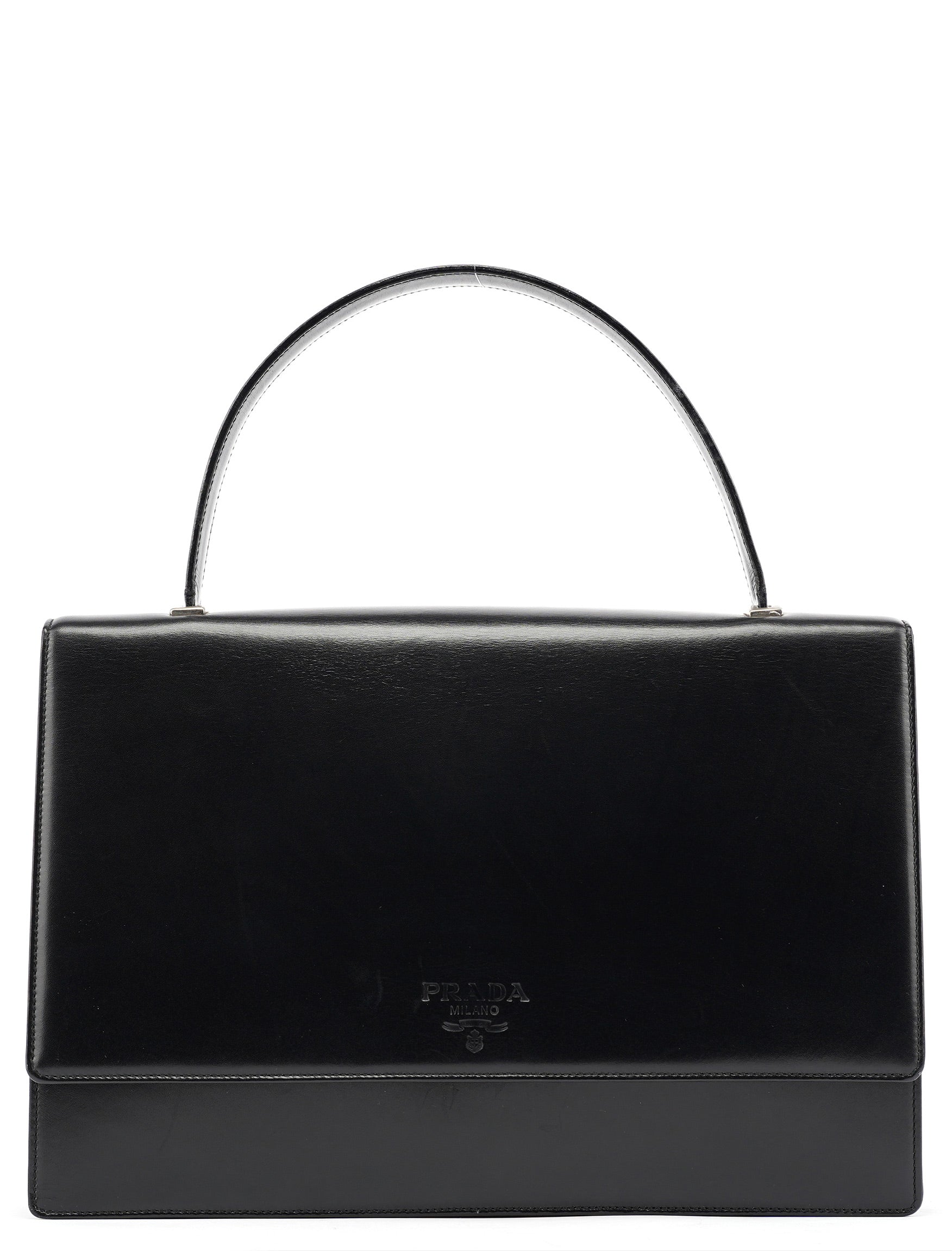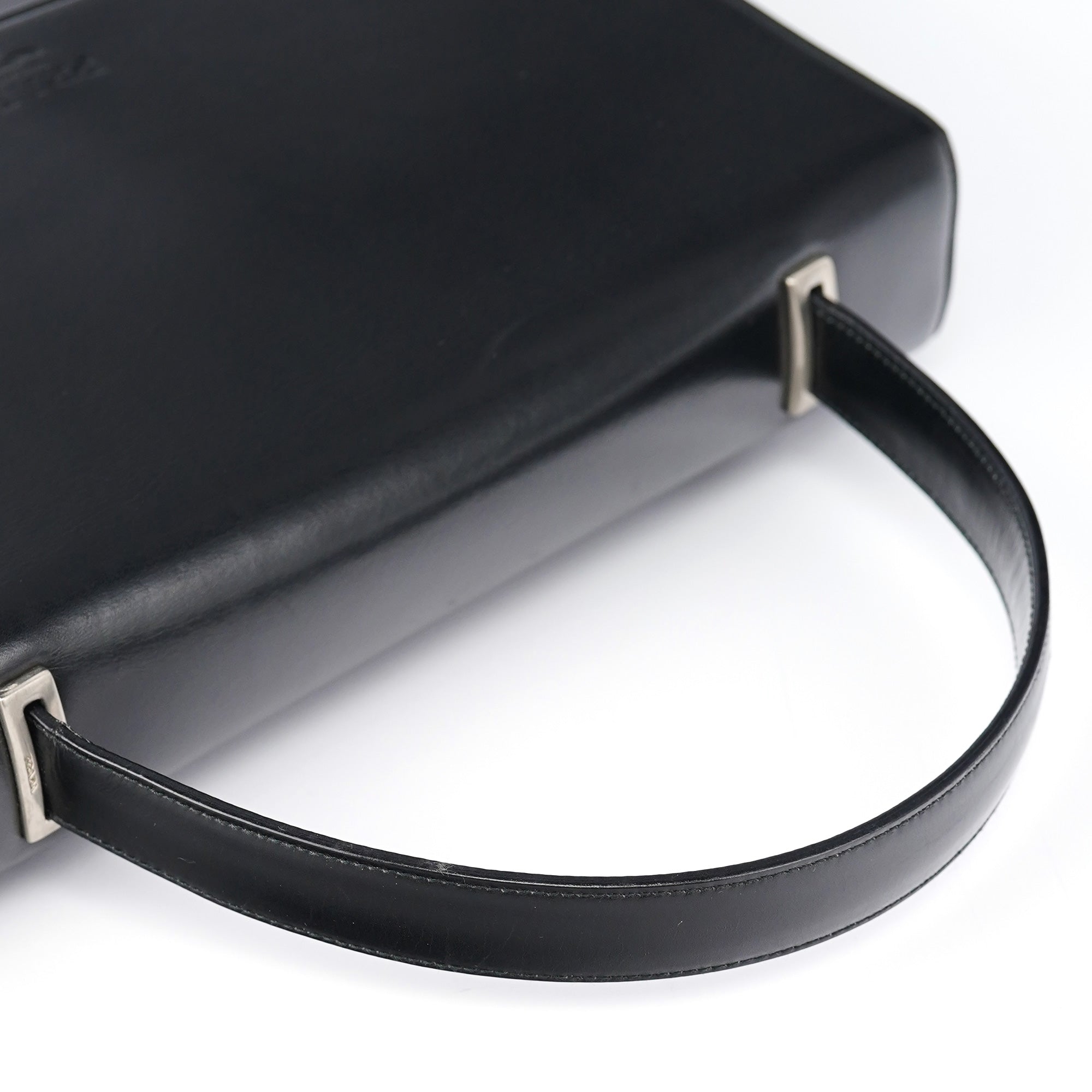 Designed in the late 1990s by Miuccia Prada, this vintage Prada Vitello top handle bag is crafted from black calfskin leather with minimalist construction. The structured silhouette features clean lines, a single top handle, and subtle logo embossing, representing Prada's understated luxury aesthetic and refined Italian craftsmanship. The interior is lined in satin and includes an interior zipper pocket.