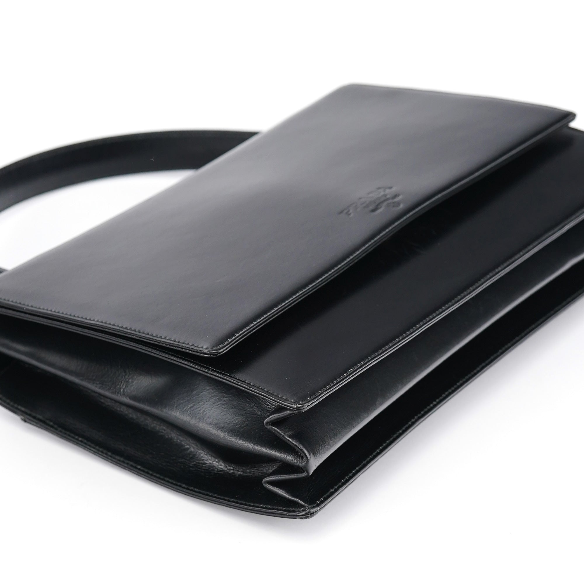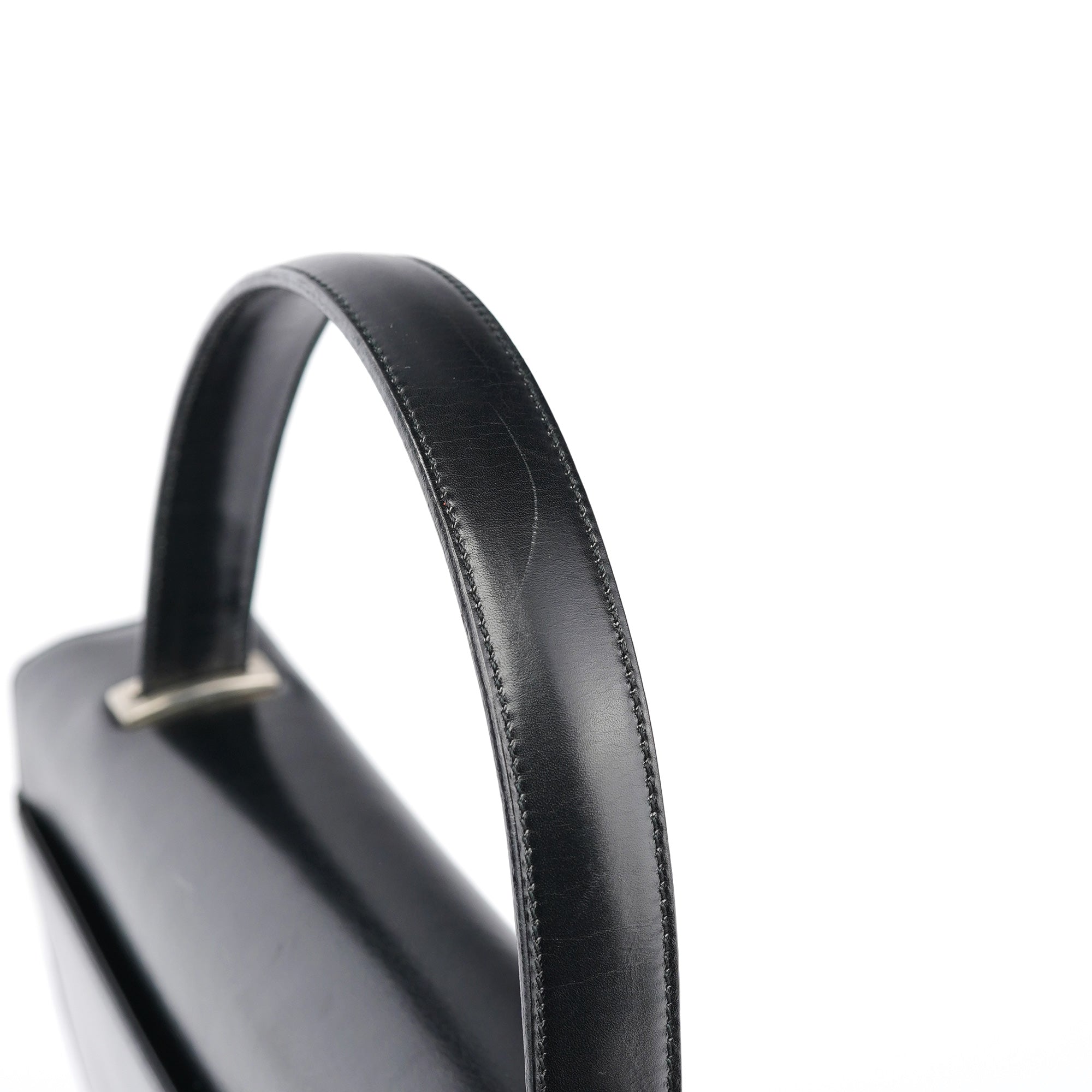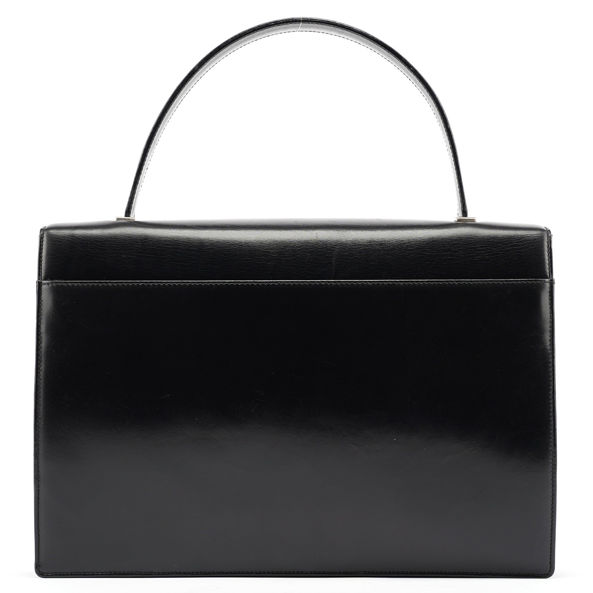 Designed in the late 1990s by Miuccia Prada, this vintage Prada Vitello top handle bag is crafted from black calfskin leather with minimalist construction. The structured silhouette features clean lines, a single top handle, and subtle logo embossing, representing Prada's understated luxury aesthetic and refined Italian craftsmanship. The interior is lined in satin and includes an interior zipper pocket.