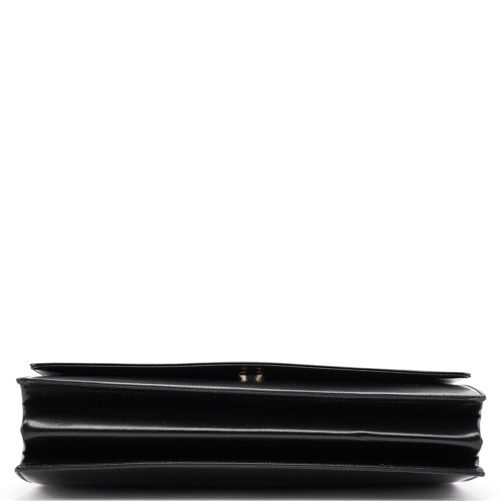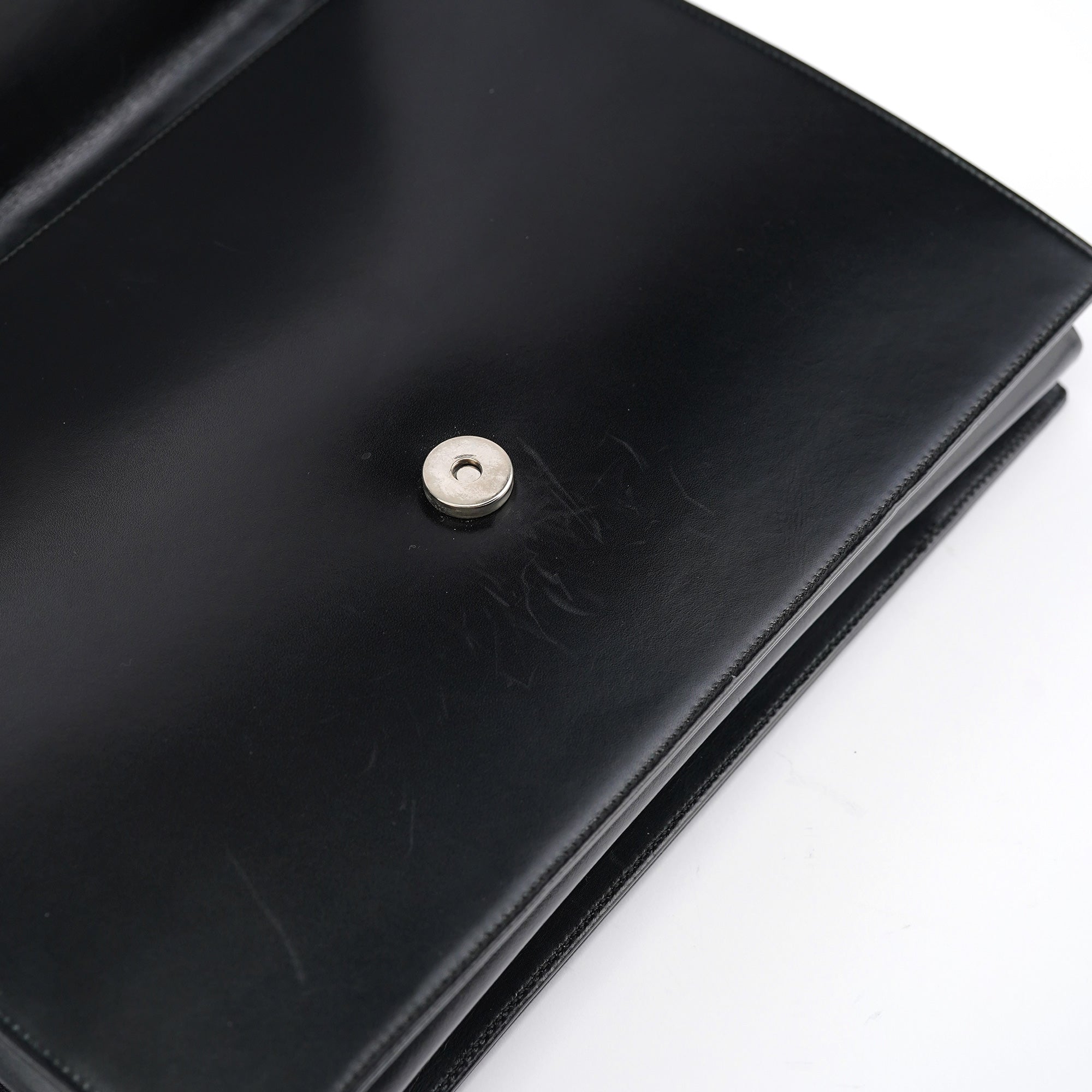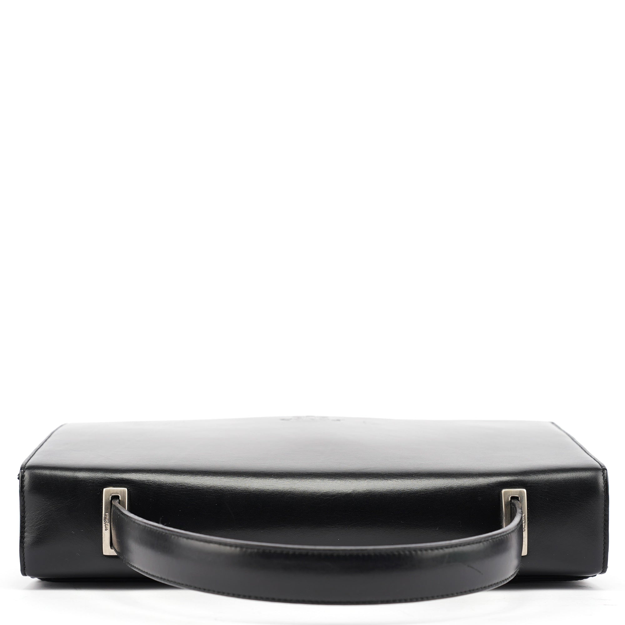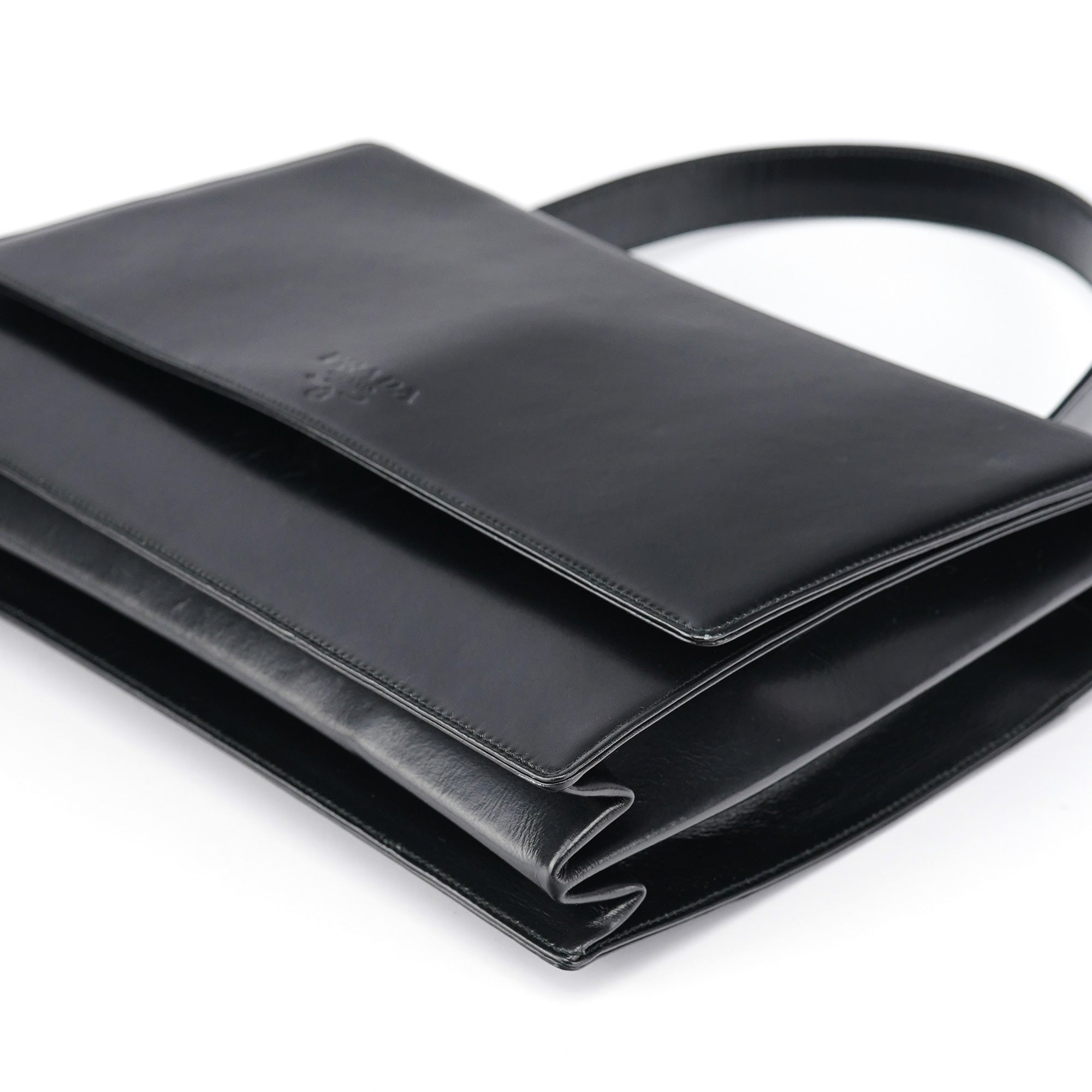 Designed in the late 1990s by Miuccia Prada, this vintage Prada Vitello top handle bag is crafted from black calfskin leather with minimalist construction. The structured silhouette features clean lines, a single top handle, and subtle logo embossing, representing Prada's understated luxury aesthetic and refined Italian craftsmanship. The interior is lined in satin and includes an interior zipper pocket.