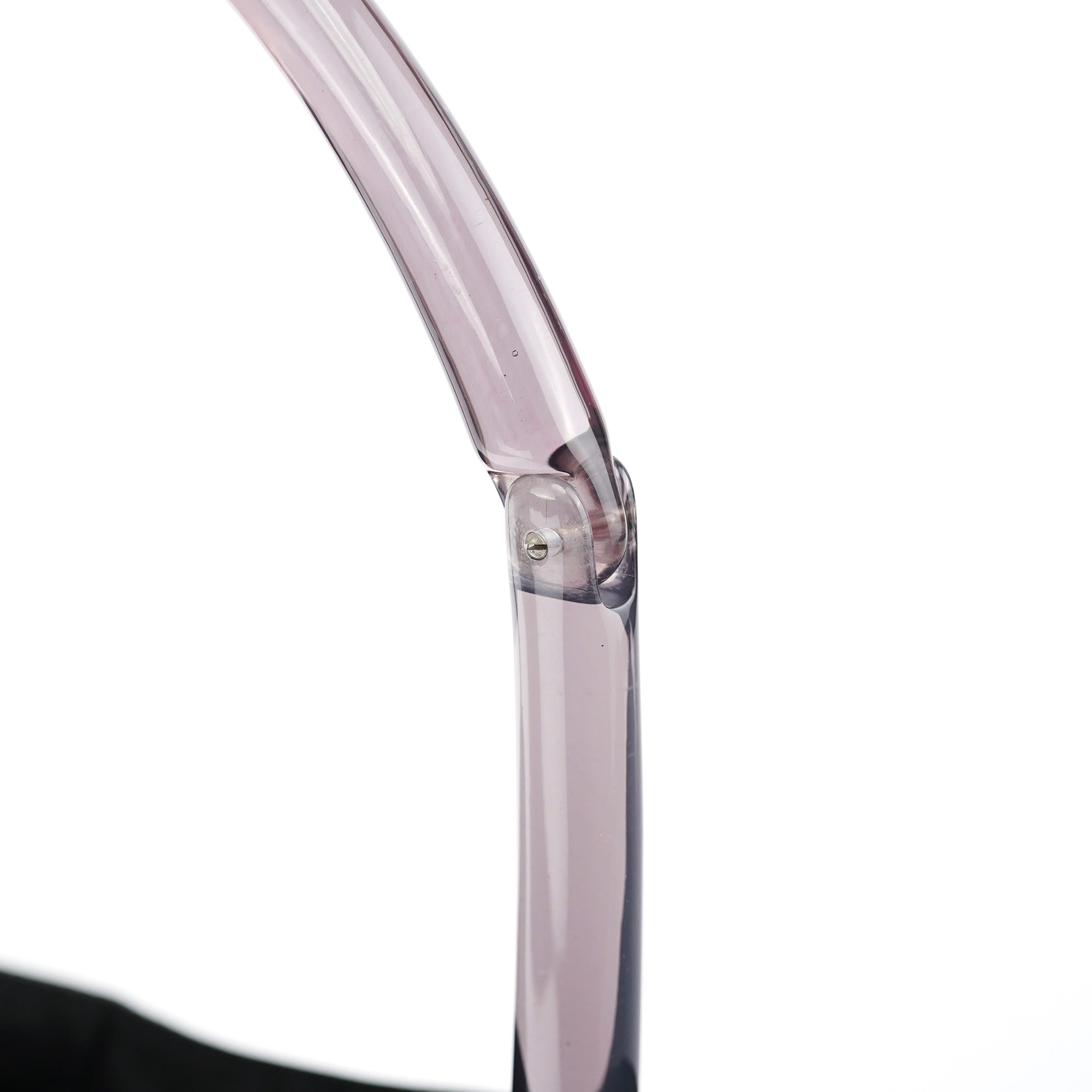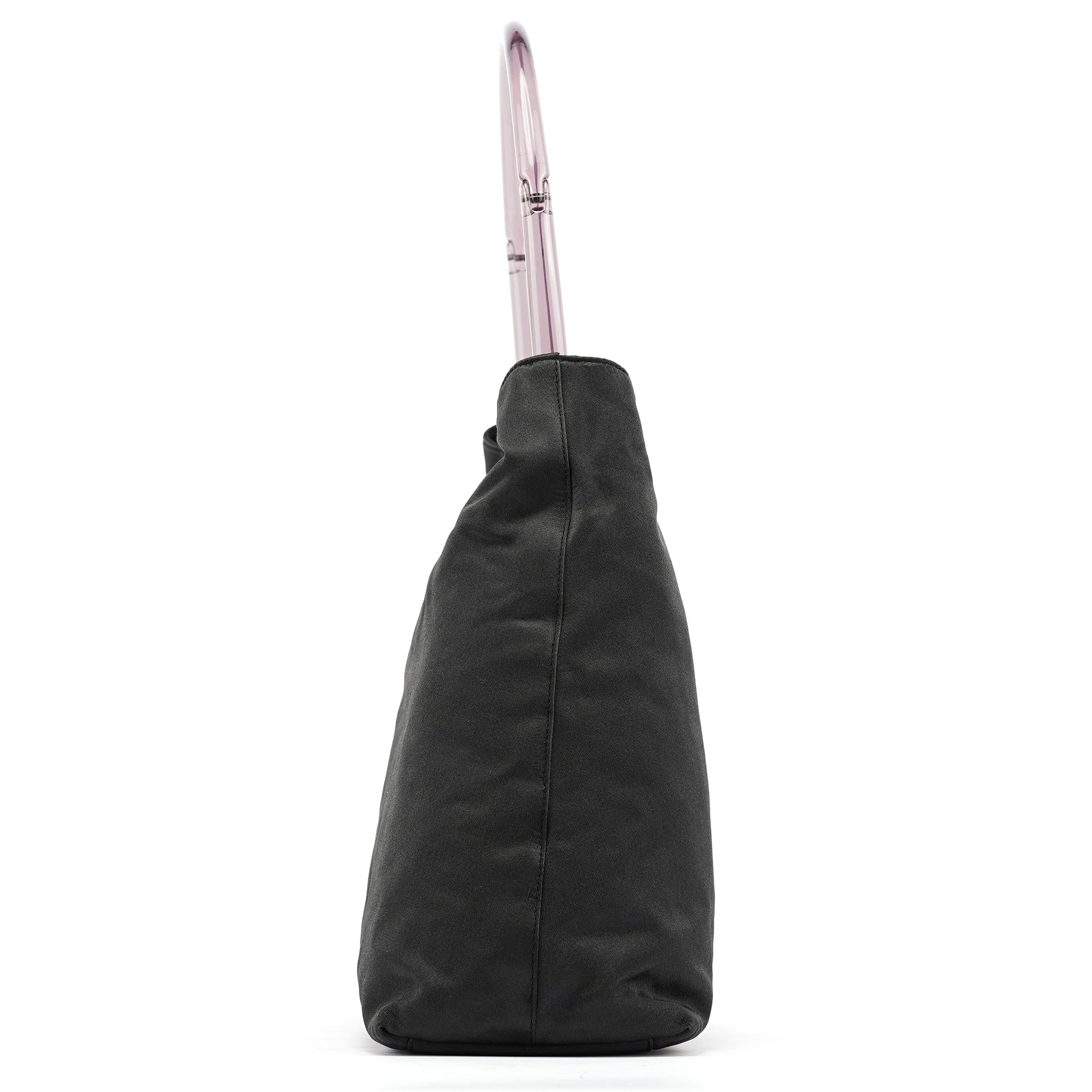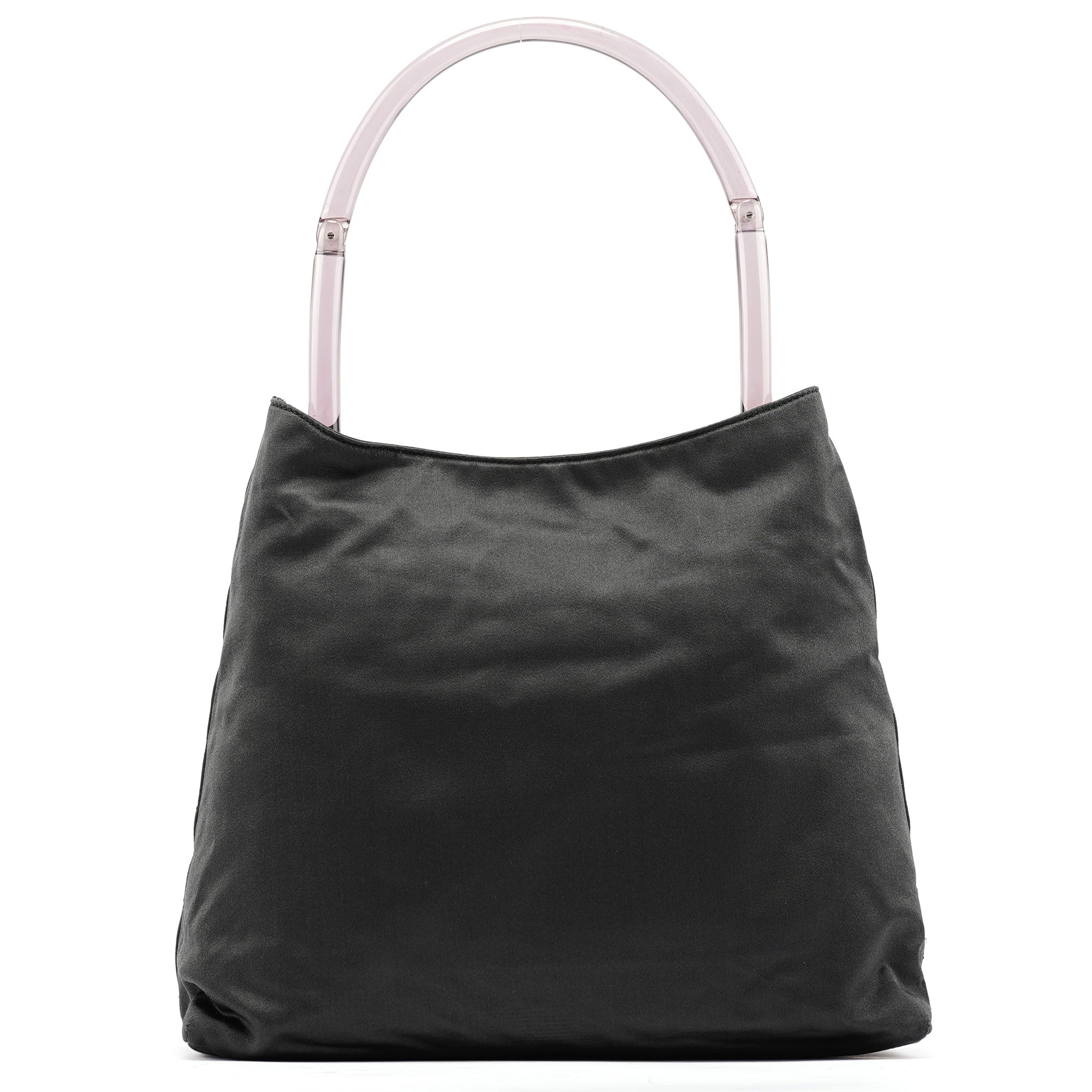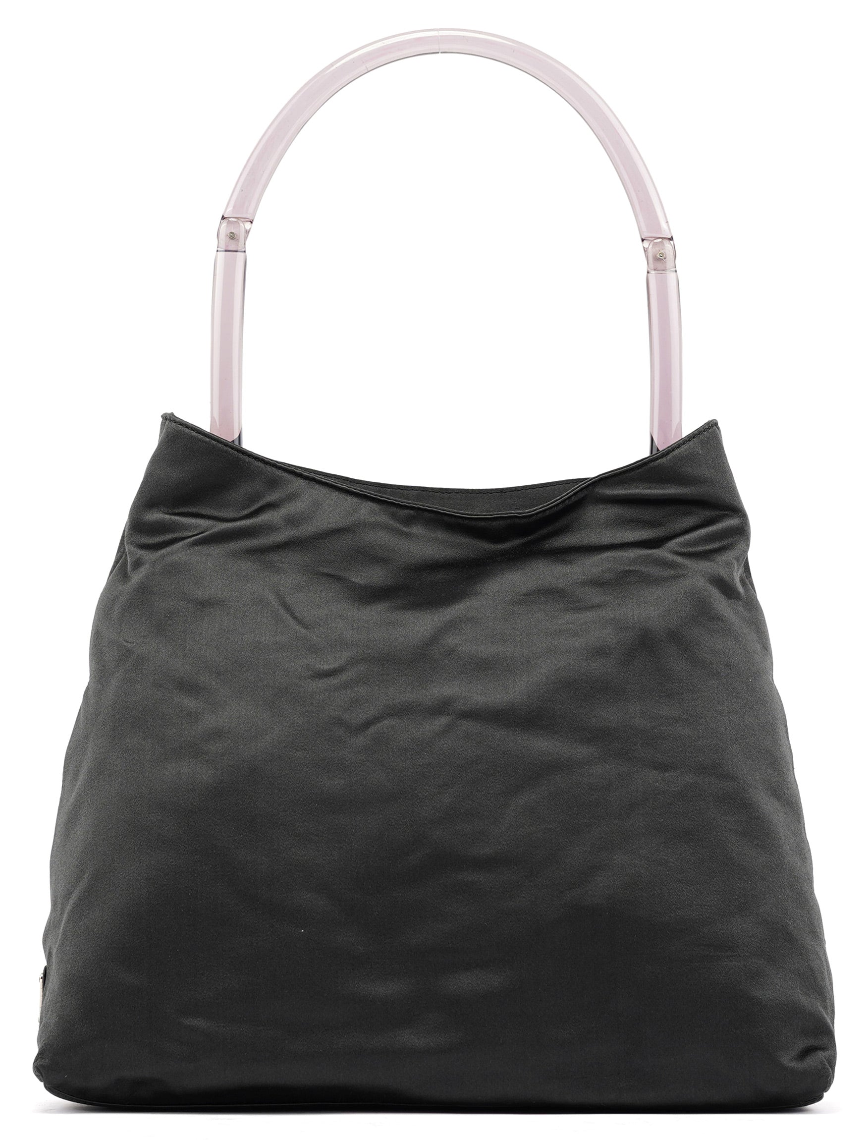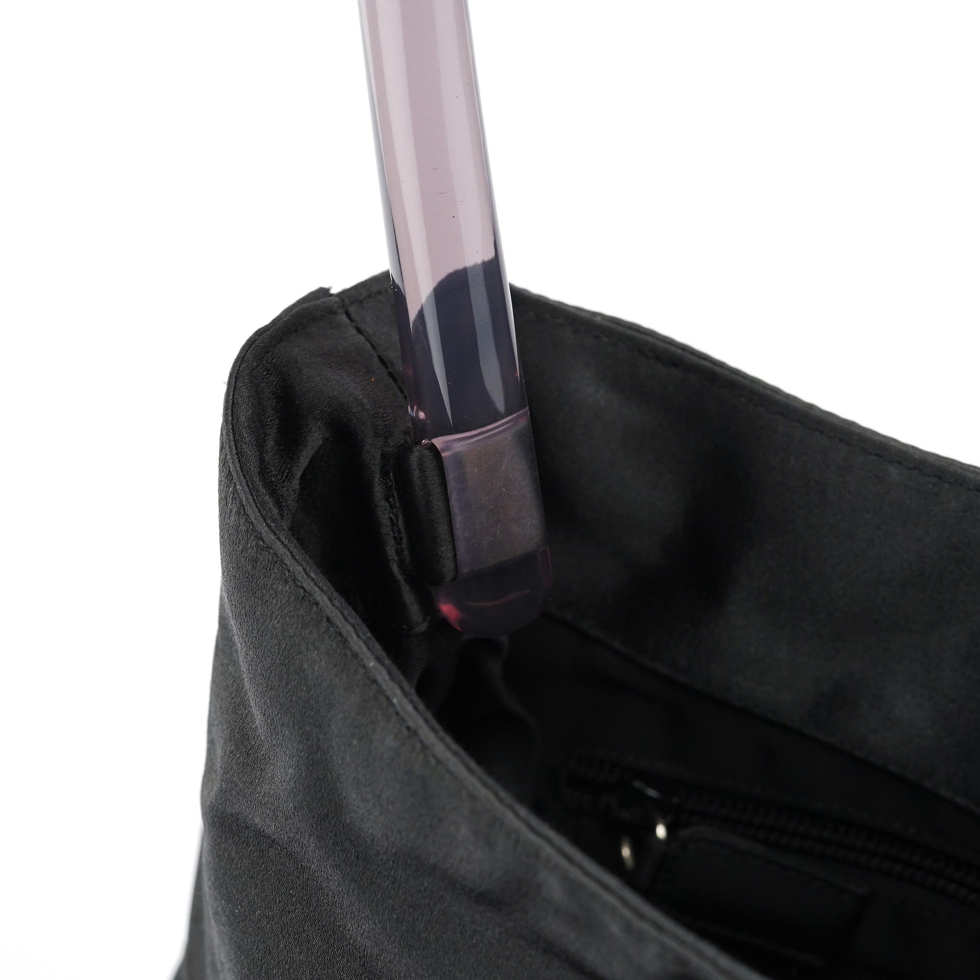 Designed in 1998 by Miuccia Prada, this vintage Prada Raso Plastic shoulder bag is handcrafted in dark grey satin with a distinctive lilac plexiglass handle. It features the iconic enameled triangle logo on the side and a spacious fabric-lined interior with a zip pocket and logo plaque.