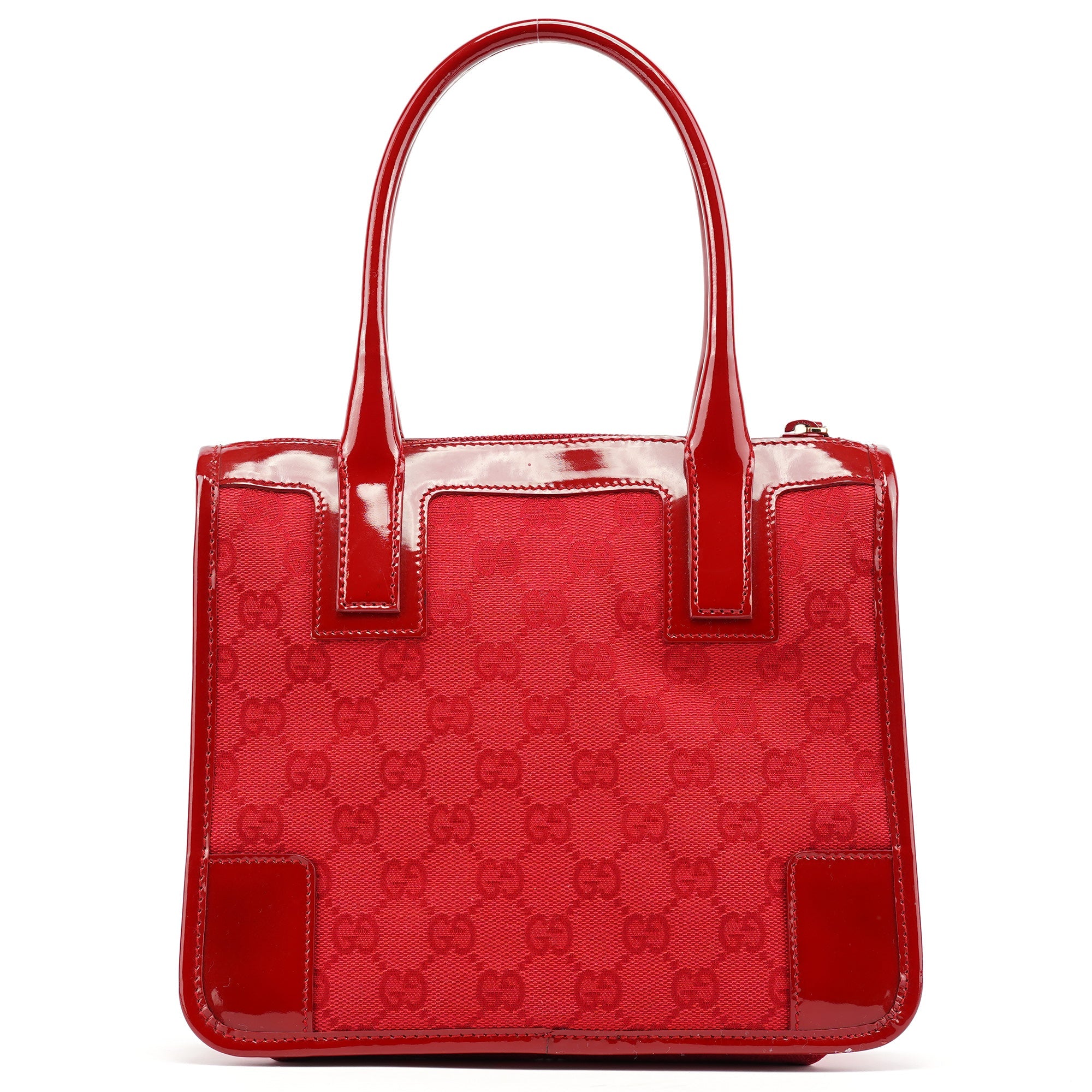 Designed in the late 1990s by Tom Ford, this Gucci tote bag showcases the iconic GG monogram in vibrant red canvas with matching red patent leather trim. During Ford's revolutionary tenure, he transformed Gucci's classic codes with bold colors and high-gloss finishes that defined luxury for a new generation. This compact tote features dual top handles, a structured silhouette, and the striking tonal red-on-red monogram that became a signature of Ford's maximalist glamour. The interior is lined in fabric with compartments for organization.