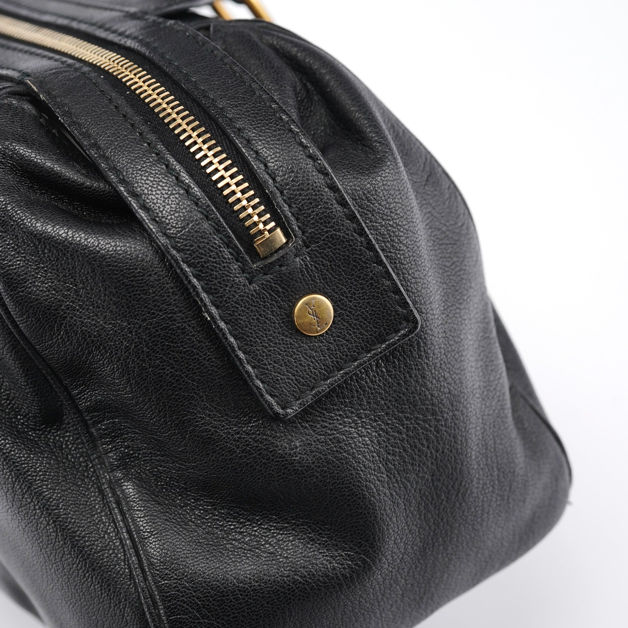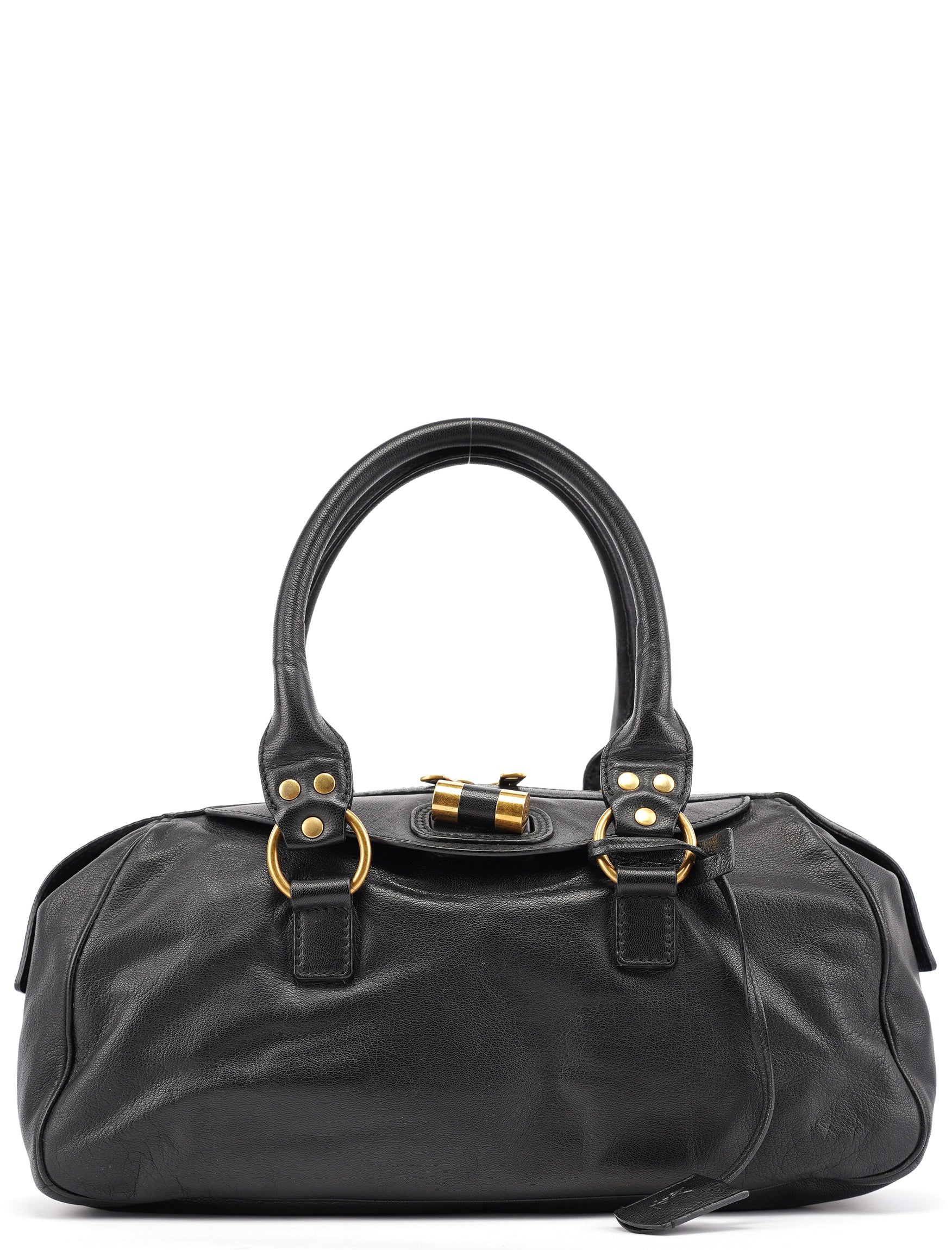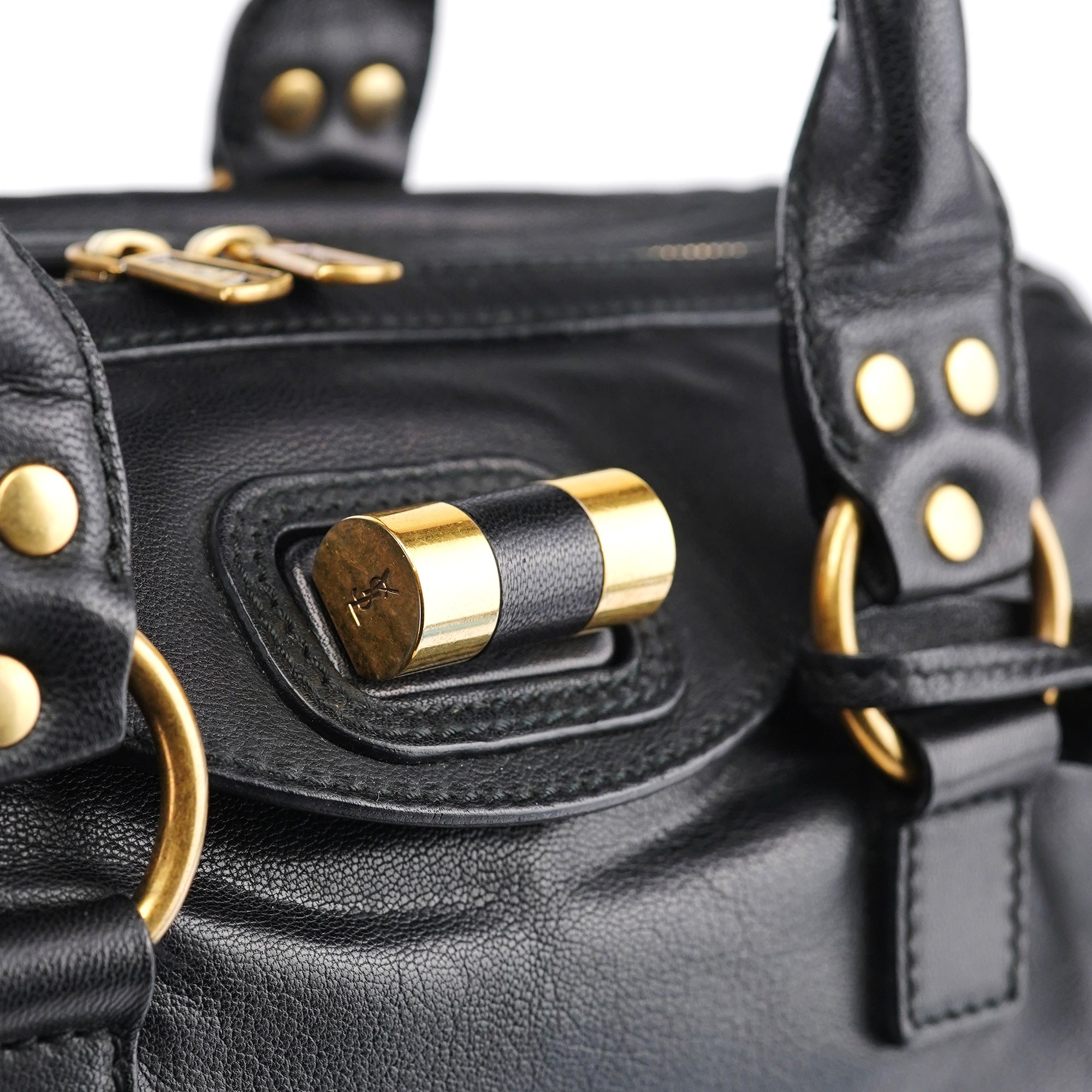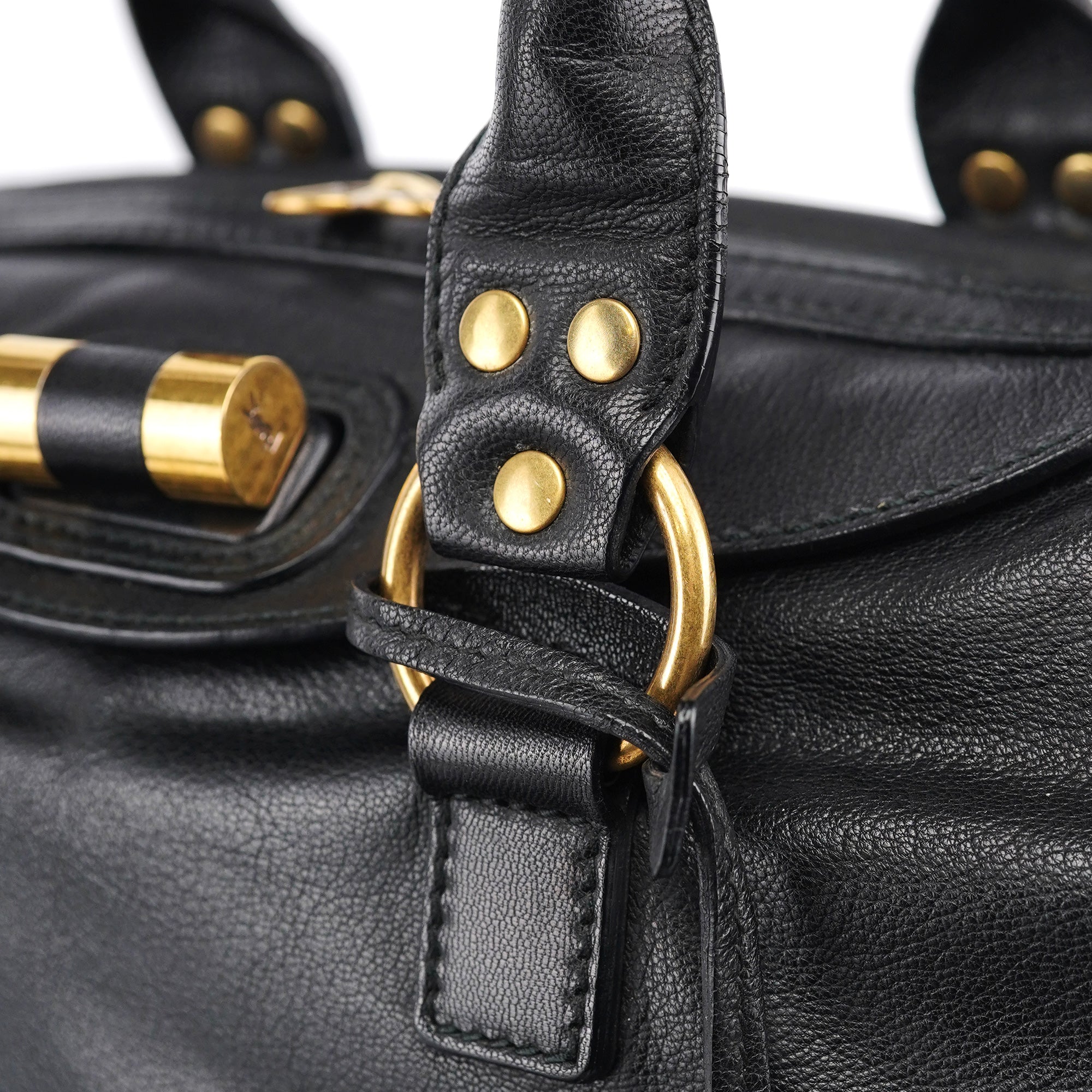 Designed in the mid-2000s by Stefano Pilati, this vintage Yves Saint Laurent Muse handbag is crafted from luxurious black calfskin leather with gold-tone hardware. The structured rectangular silhouette features the signature turn-lock closure on the front flap and dual rolled handles, exemplifying Pilati's architectural approach to luxury handbag design.