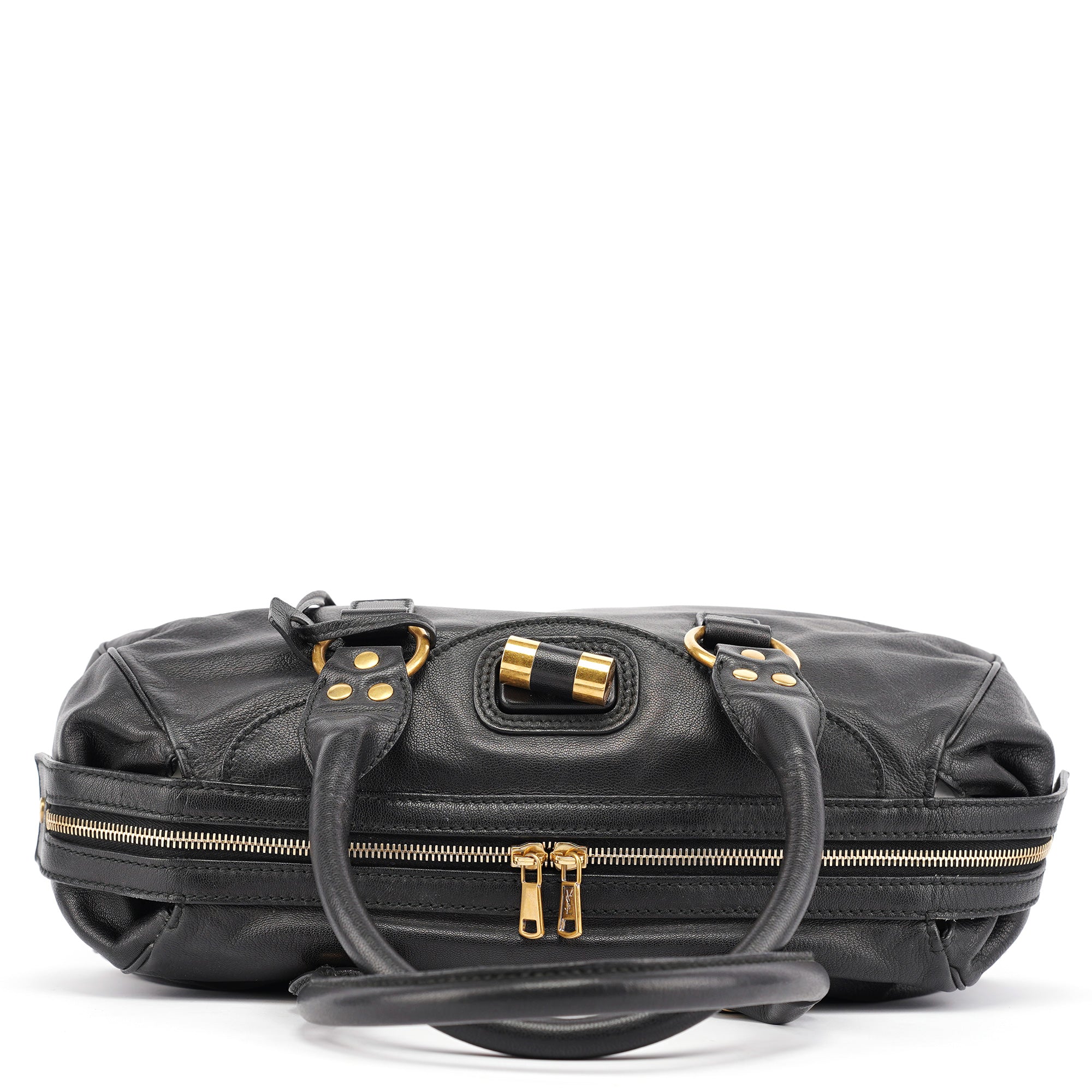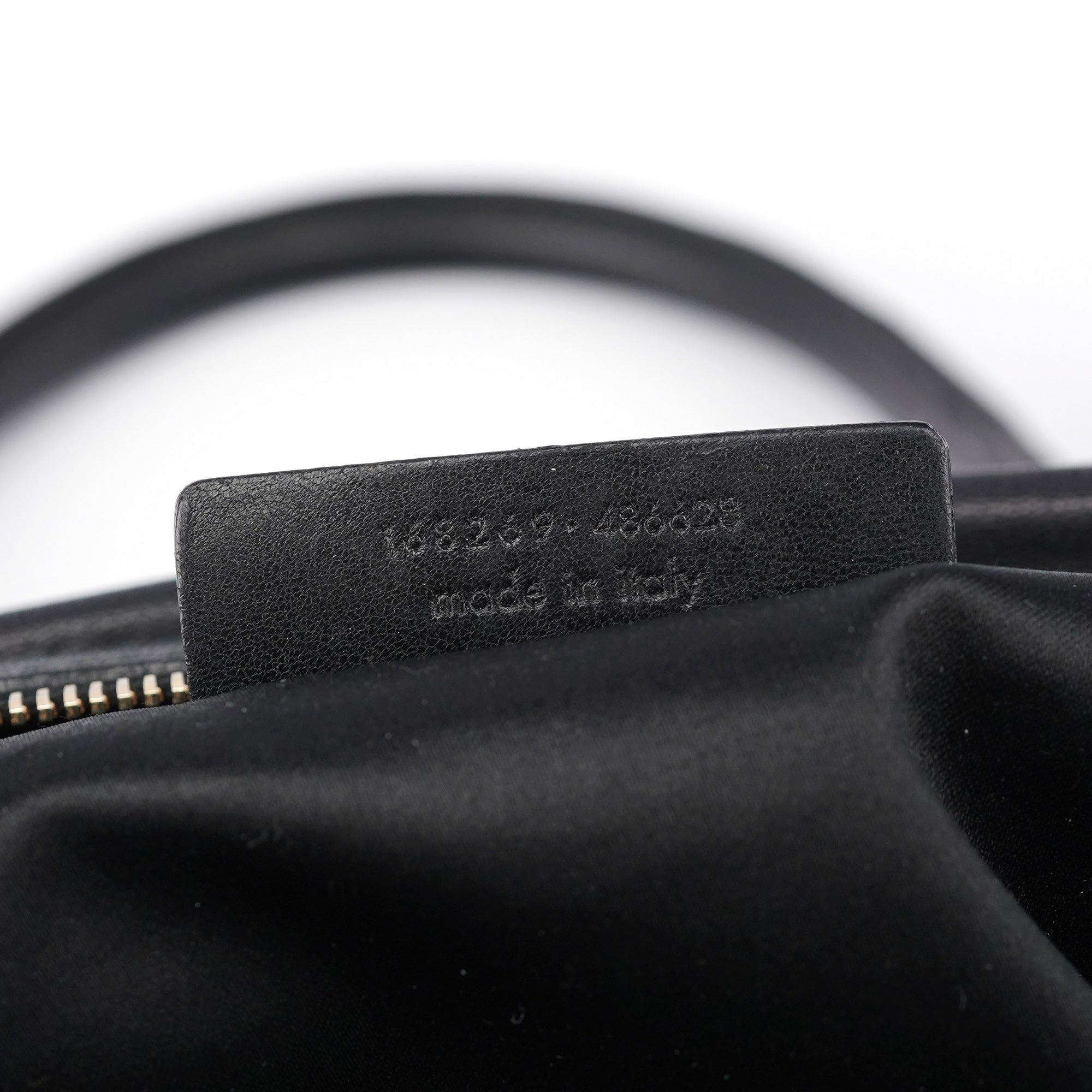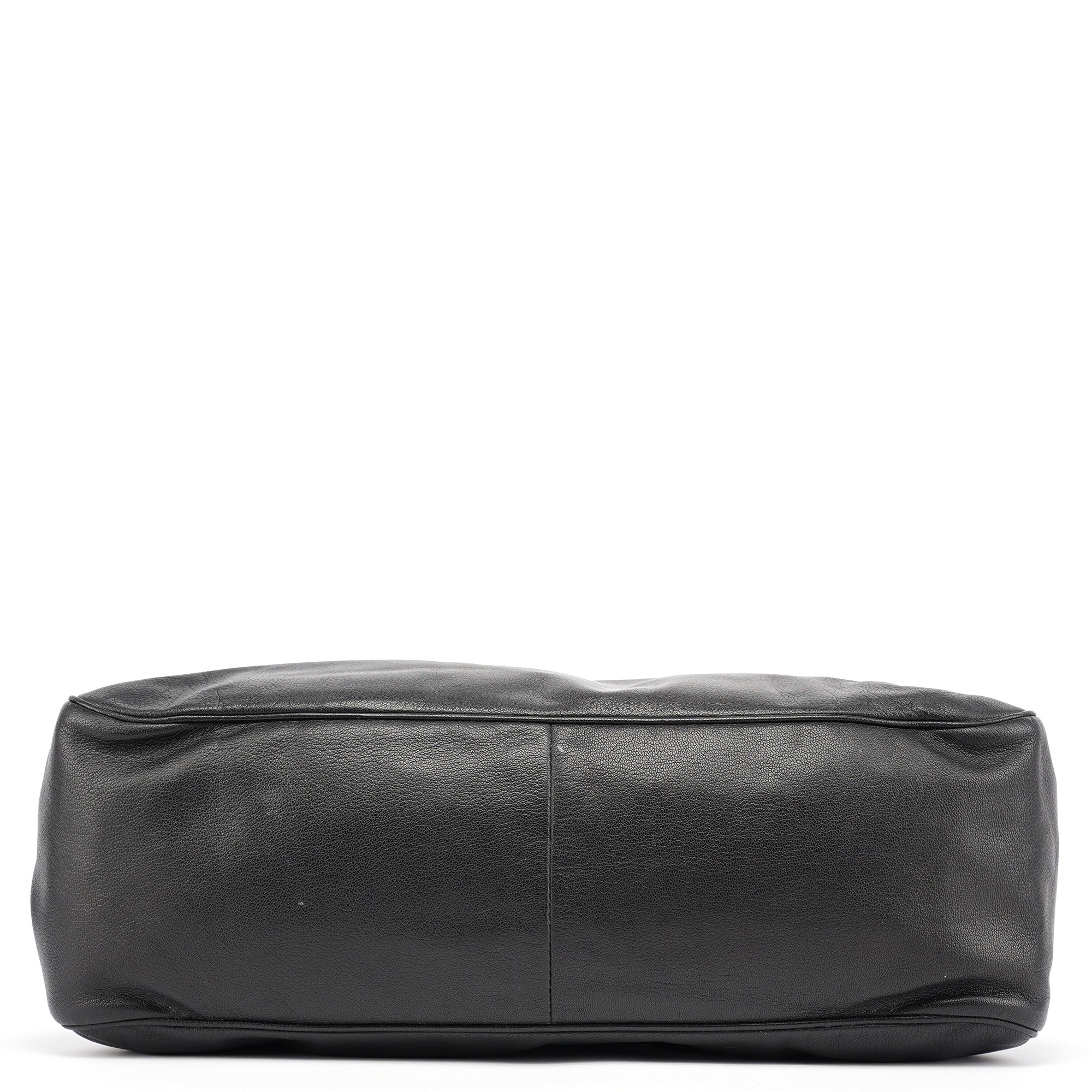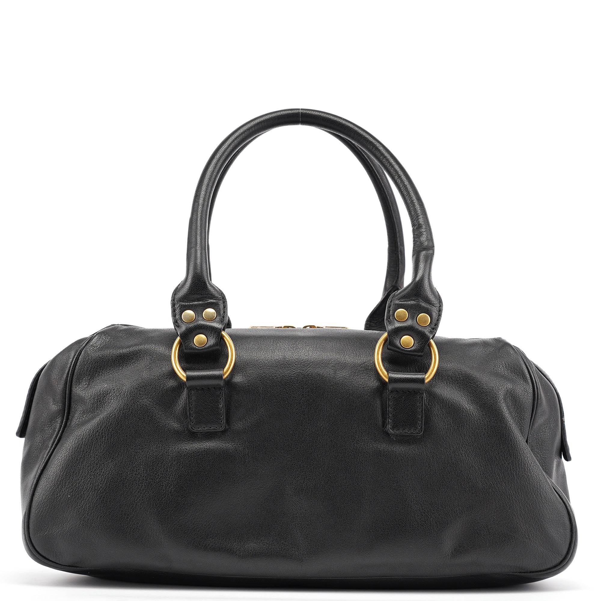 Designed in the mid-2000s by Stefano Pilati, this vintage Yves Saint Laurent Muse handbag is crafted from luxurious black calfskin leather with gold-tone hardware. The structured rectangular silhouette features the signature turn-lock closure on the front flap and dual rolled handles, exemplifying Pilati's architectural approach to luxury handbag design.