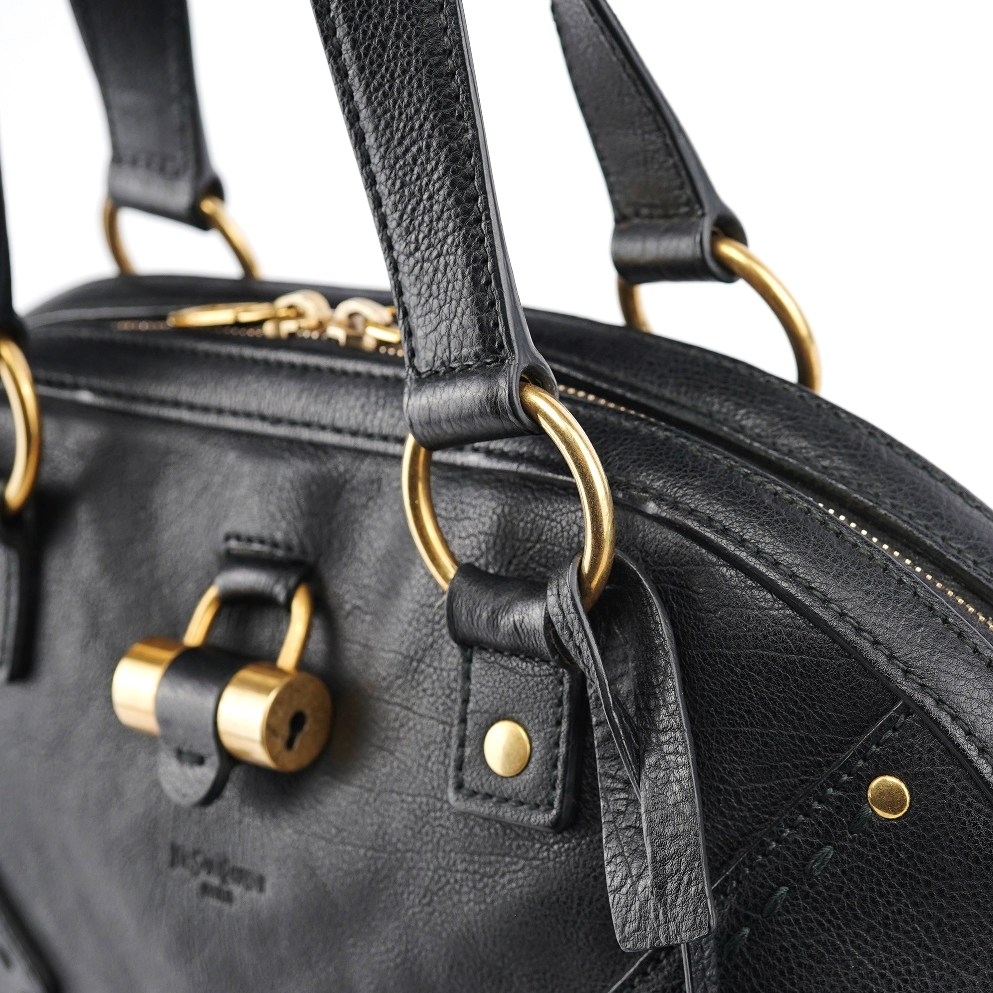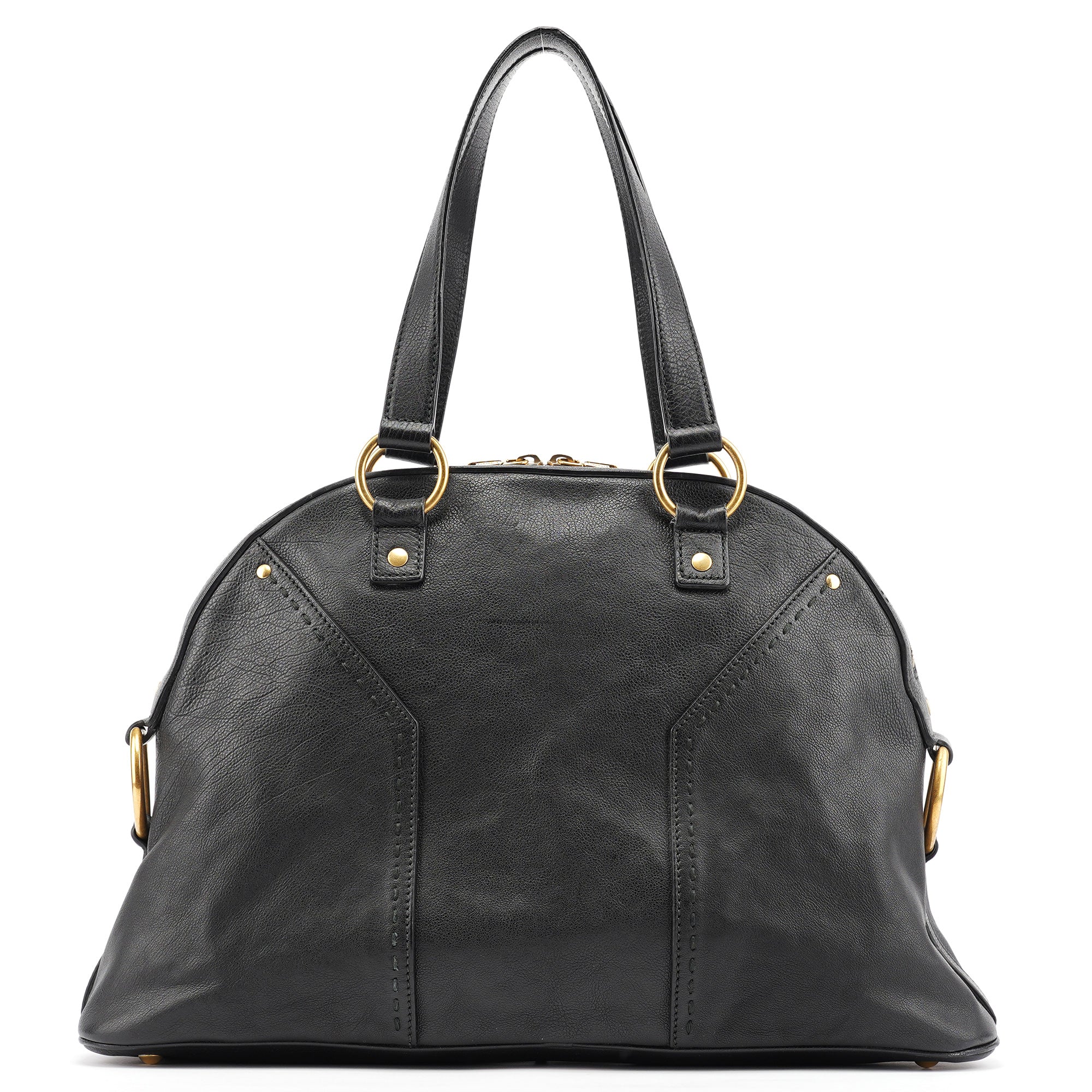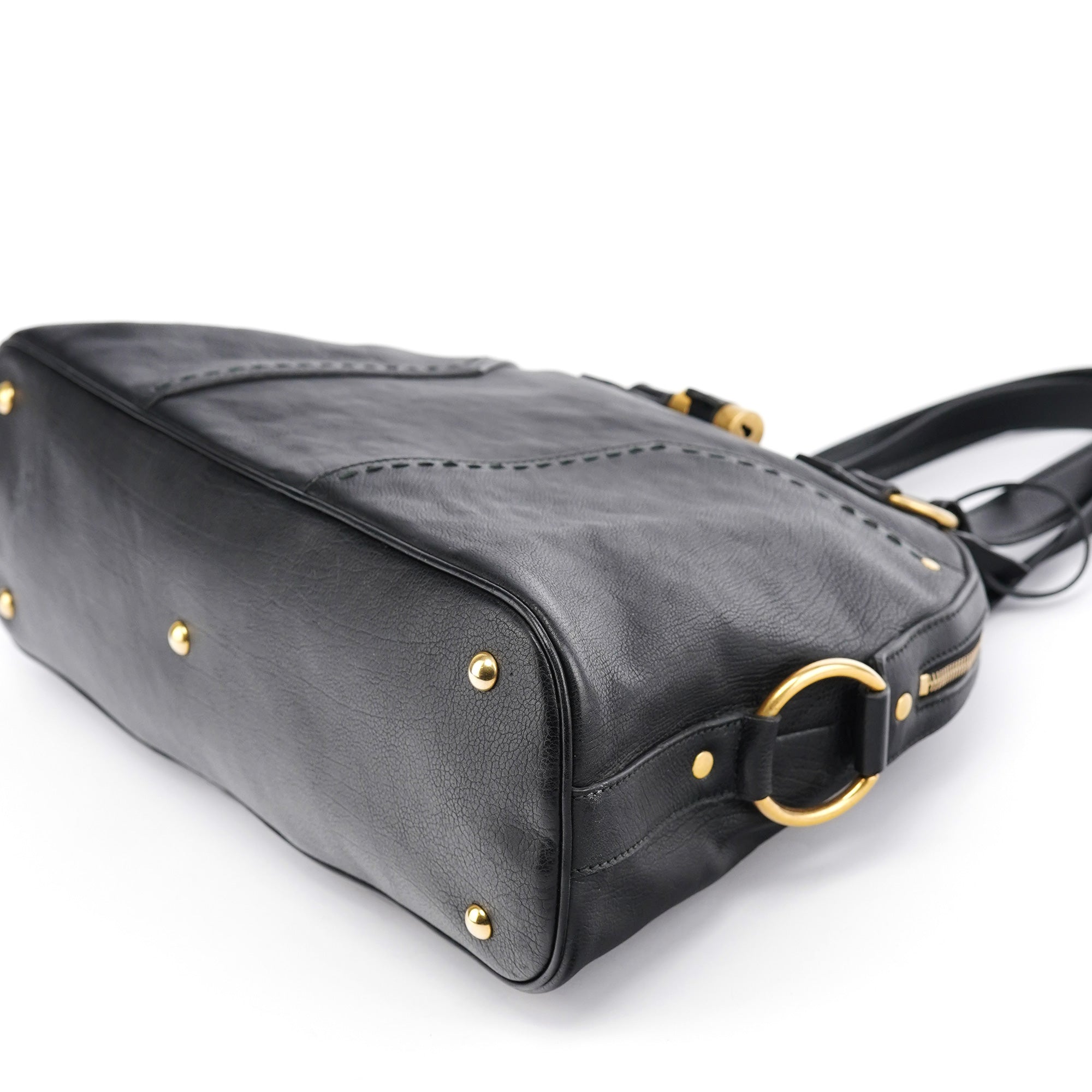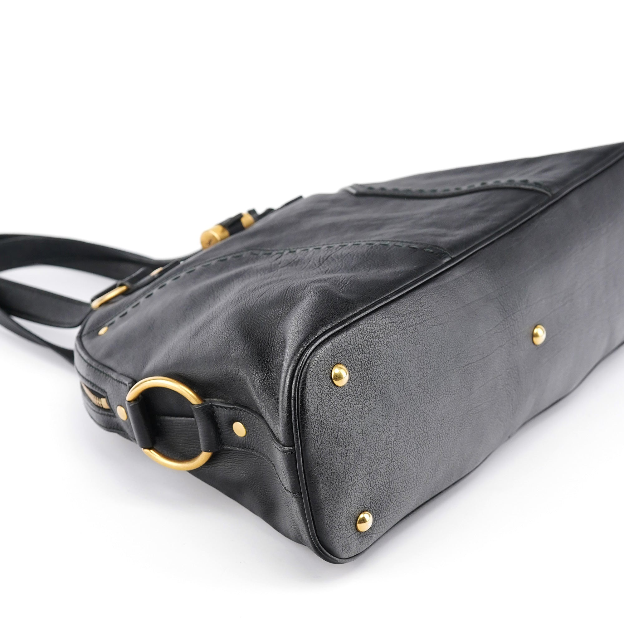 Designed in the late 2000s, this vintage Yves Saint Laurent Muse tote exemplifies the model's architectural elegance in supple black calfskin leather. The structured dome silhouette features the signature oversized gold-tone hardware, including the distinctive turn-lock closure and studded corners that made this design an instant classic. The spacious interior includes a zip pocket, while dual handles allow for comfortable carrying.