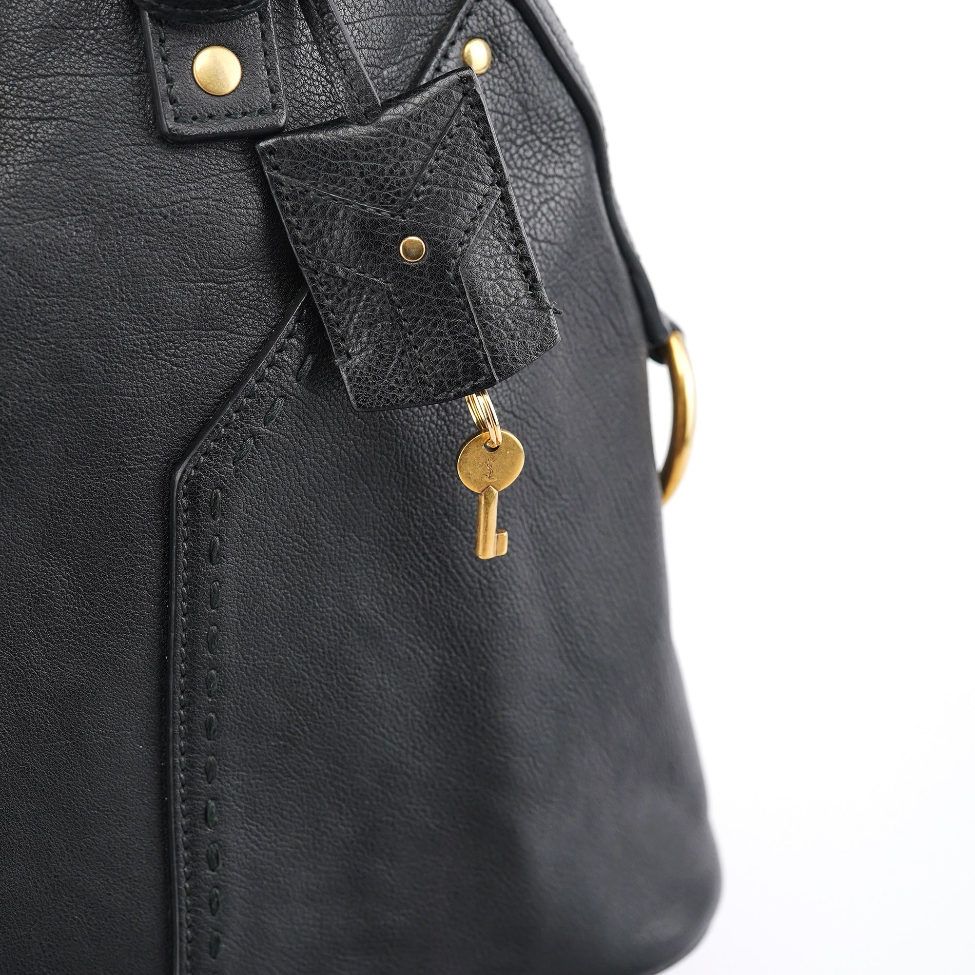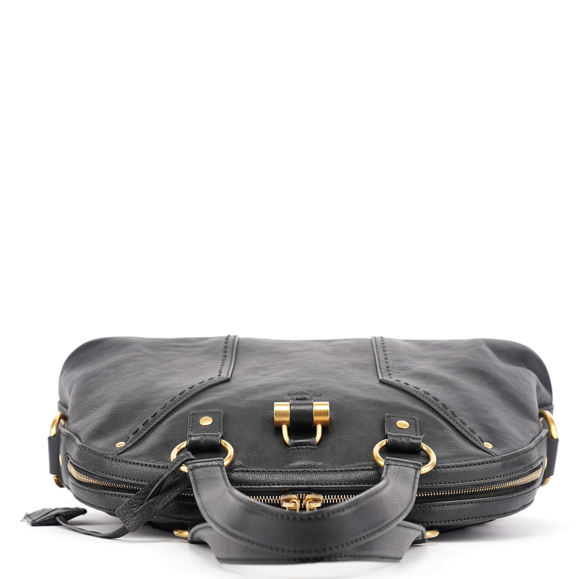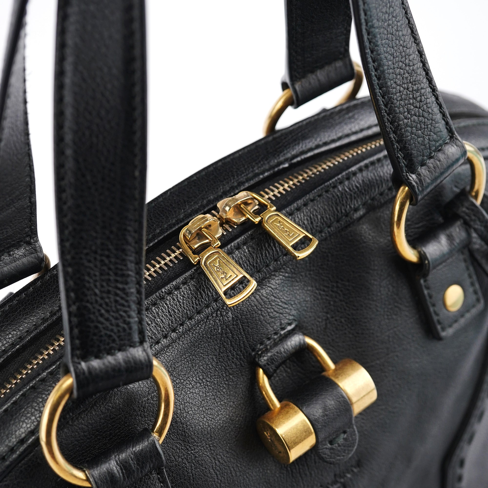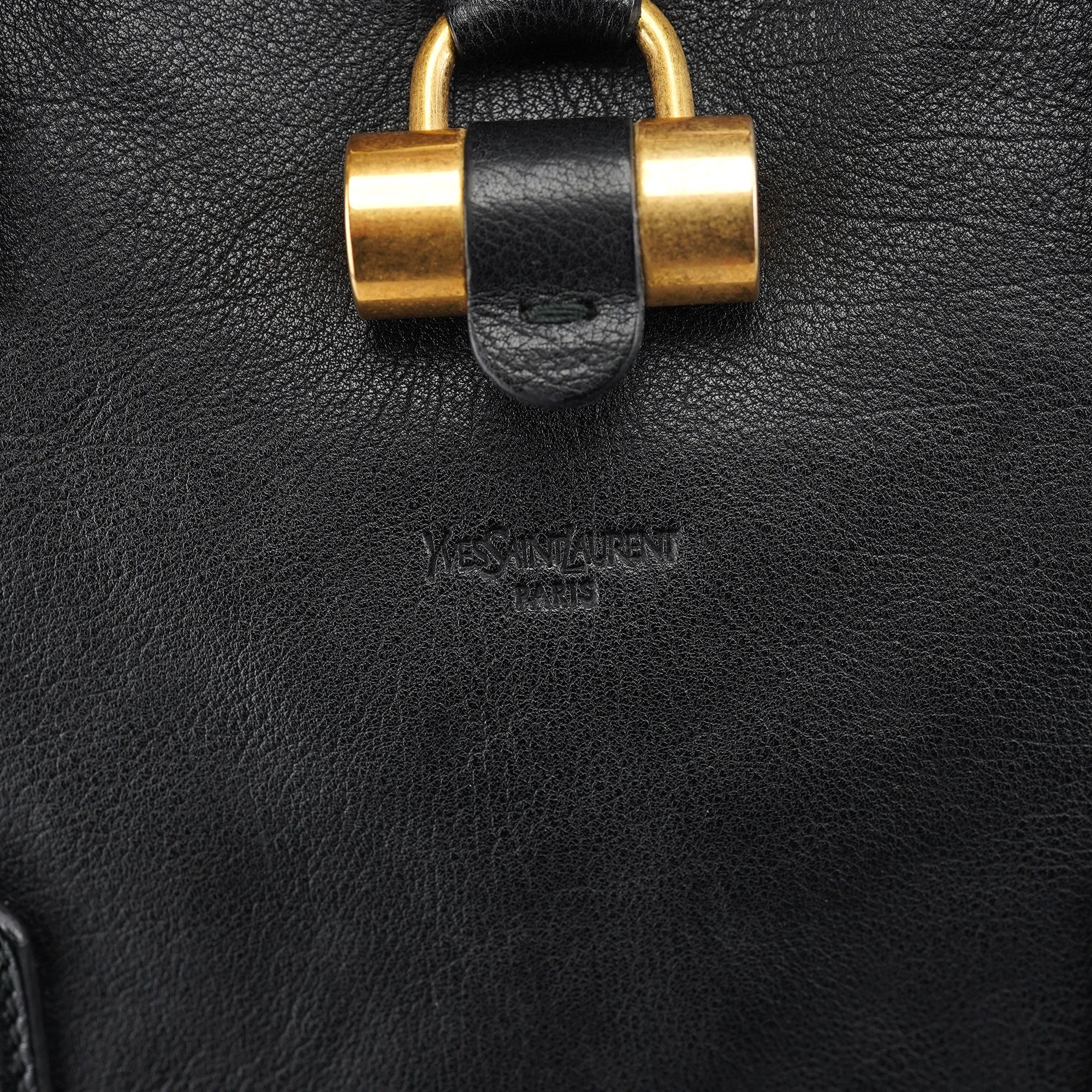 Designed in the late 2000s, this vintage Yves Saint Laurent Muse tote exemplifies the model's architectural elegance in supple black calfskin leather. The structured dome silhouette features the signature oversized gold-tone hardware, including the distinctive turn-lock closure and studded corners that made this design an instant classic. The spacious interior includes a zip pocket, while dual handles allow for comfortable carrying.