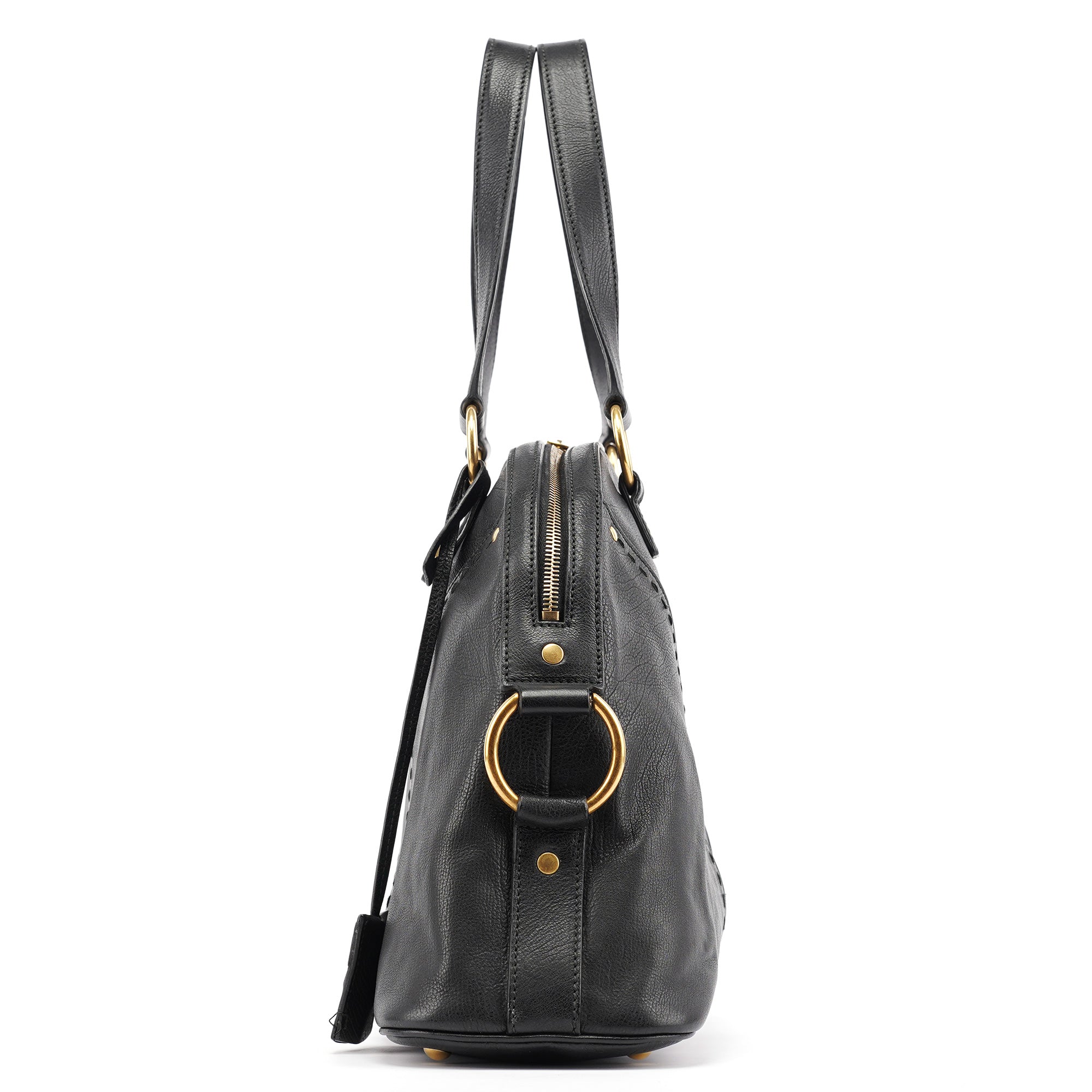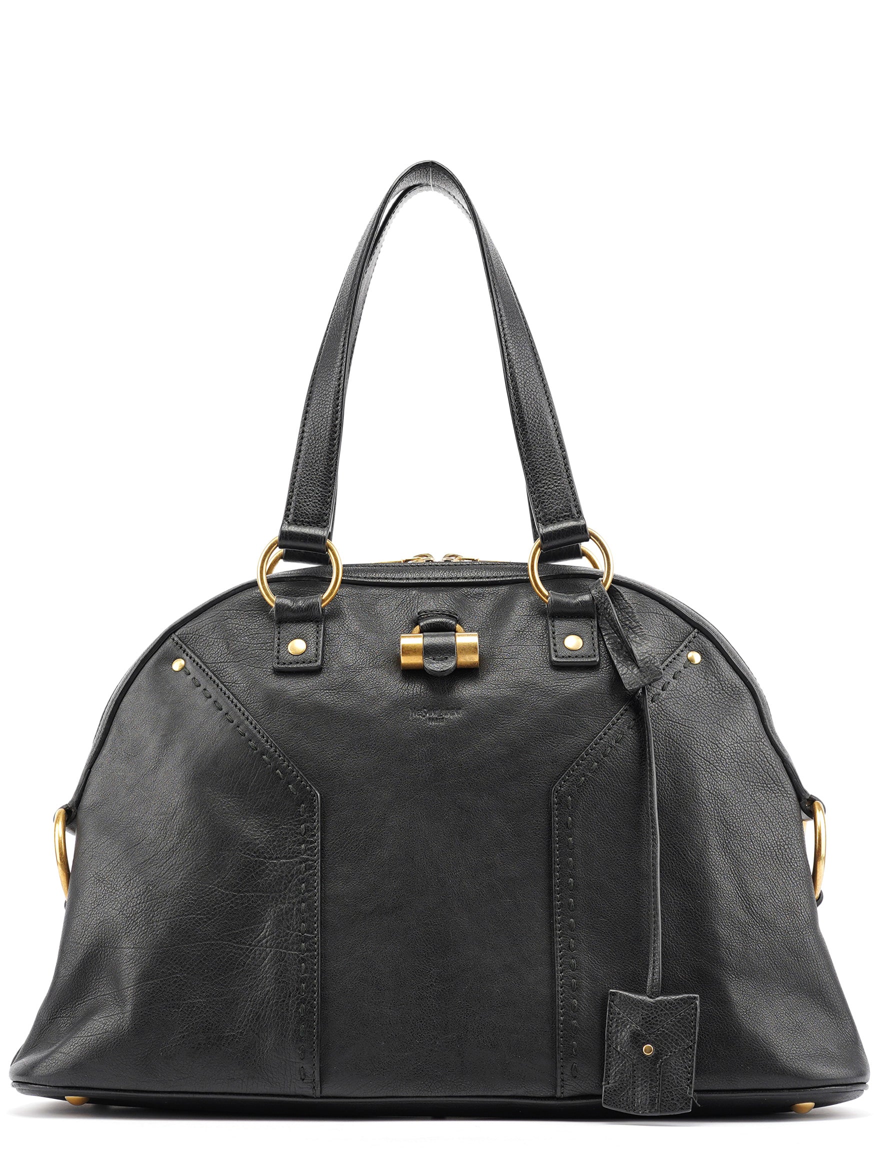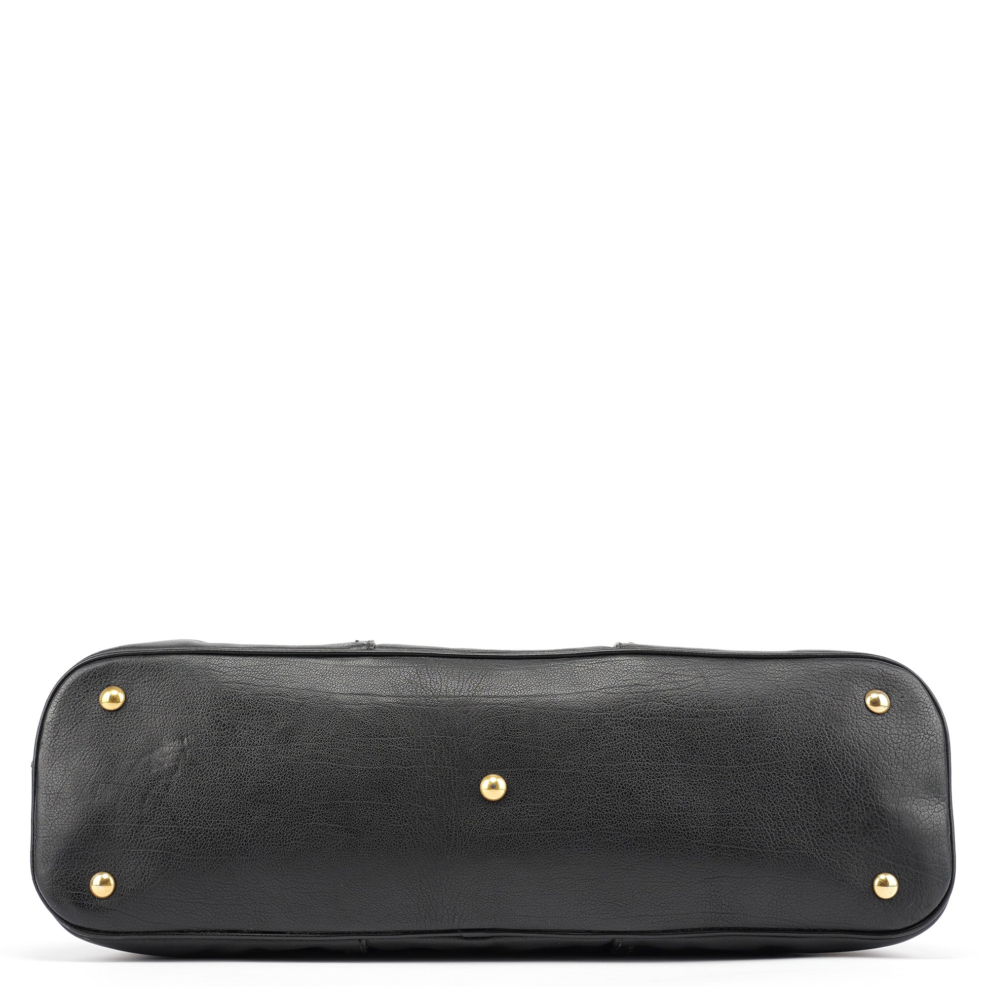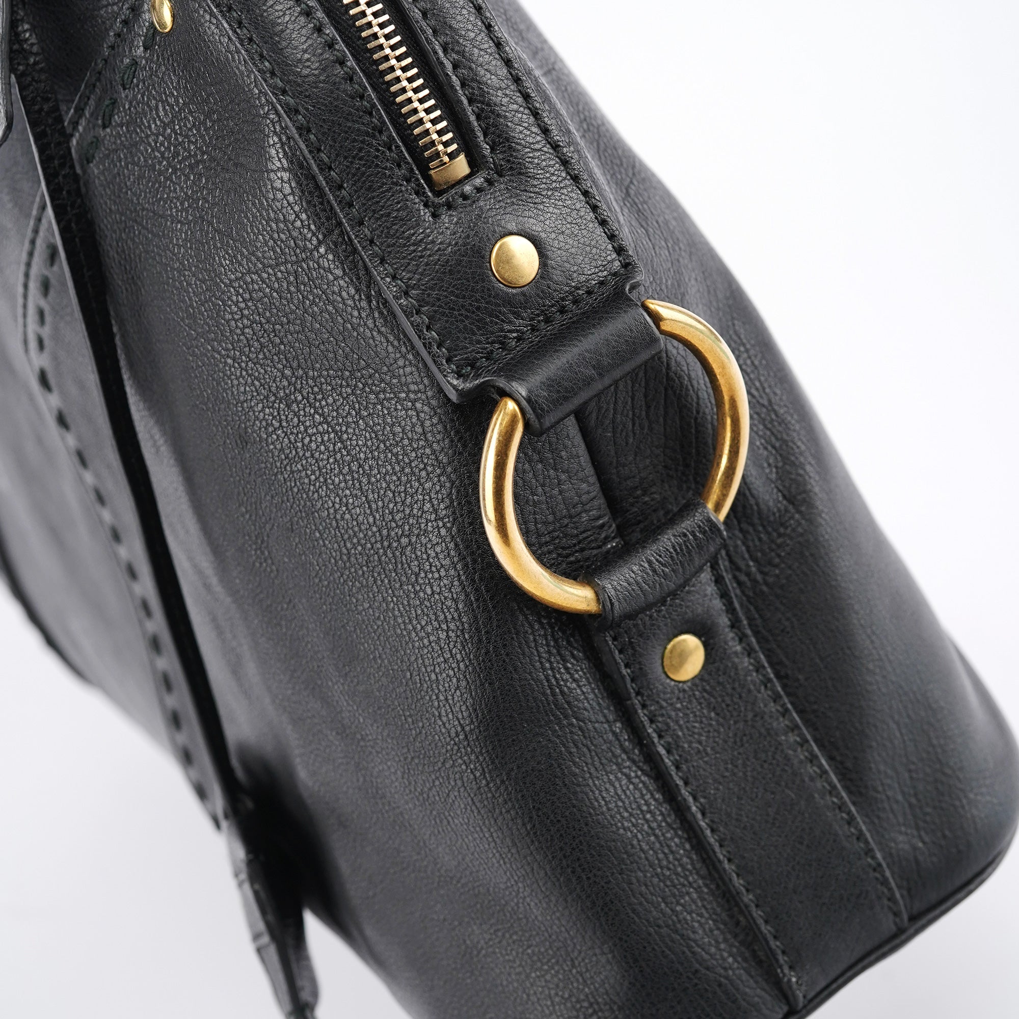 Designed in the late 2000s, this vintage Yves Saint Laurent Muse tote exemplifies the model's architectural elegance in supple black calfskin leather. The structured dome silhouette features the signature oversized gold-tone hardware, including the distinctive turn-lock closure and studded corners that made this design an instant classic. The spacious interior includes a zip pocket, while dual handles allow for comfortable carrying.