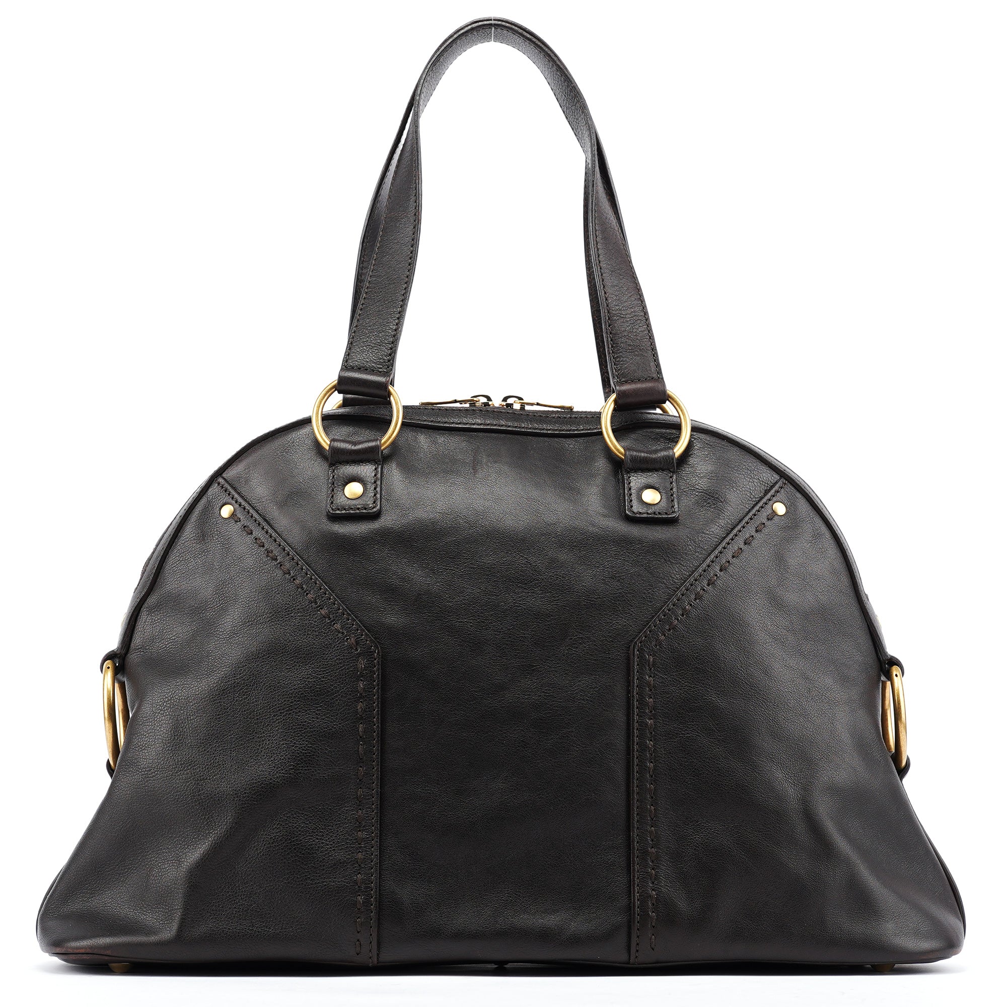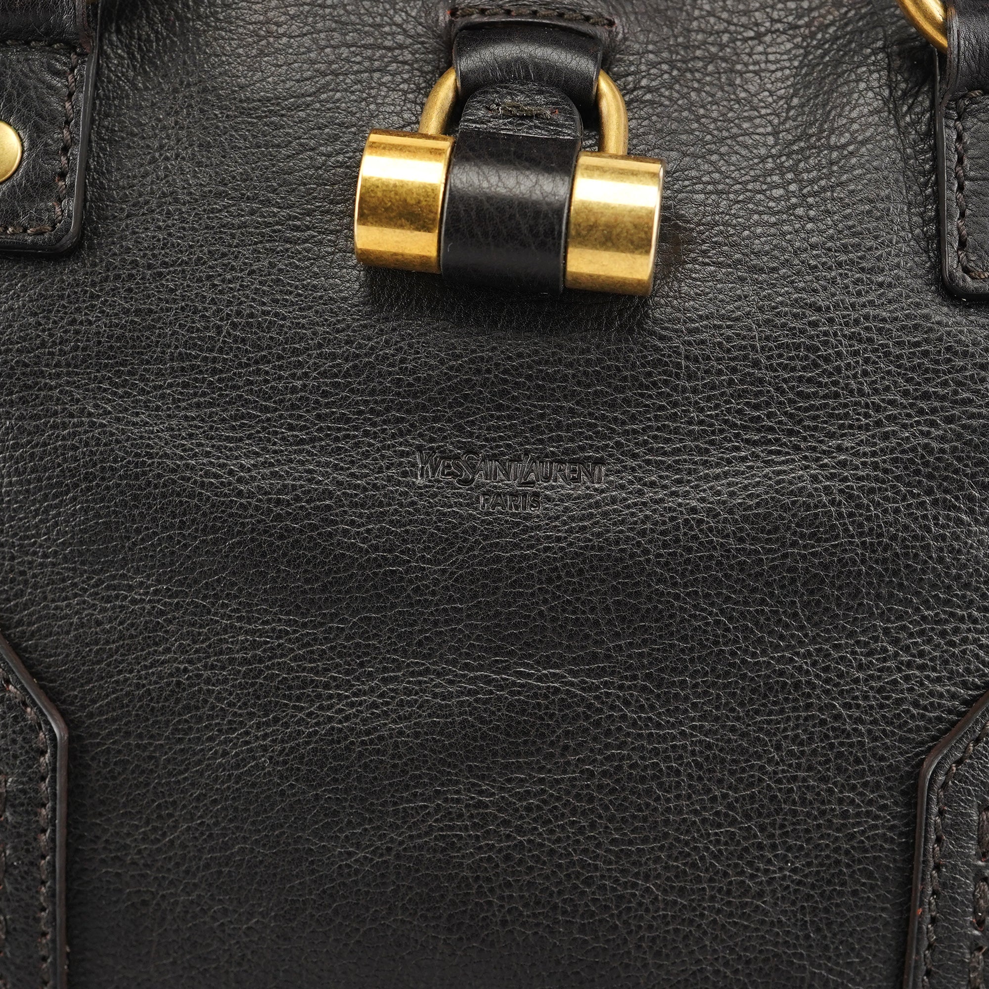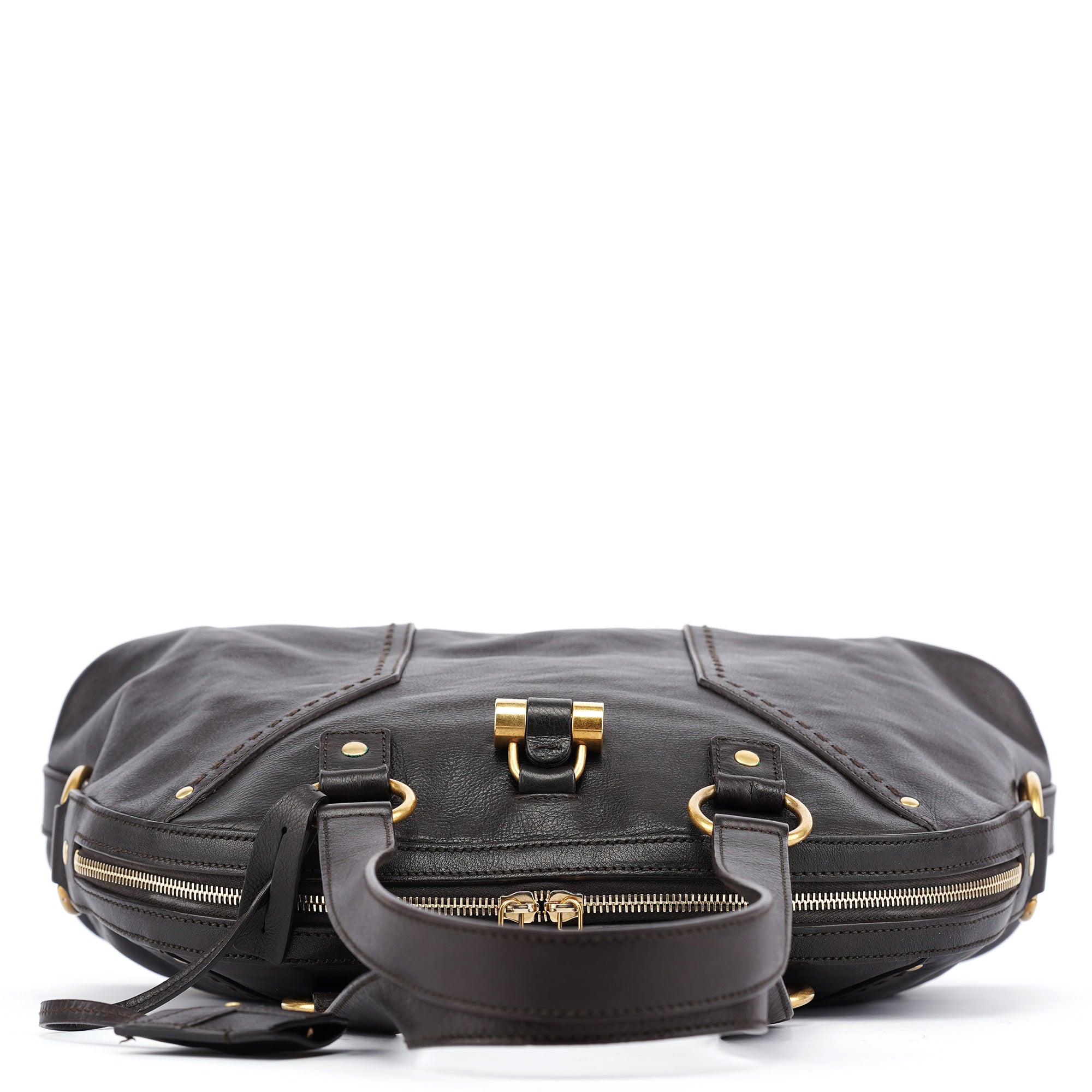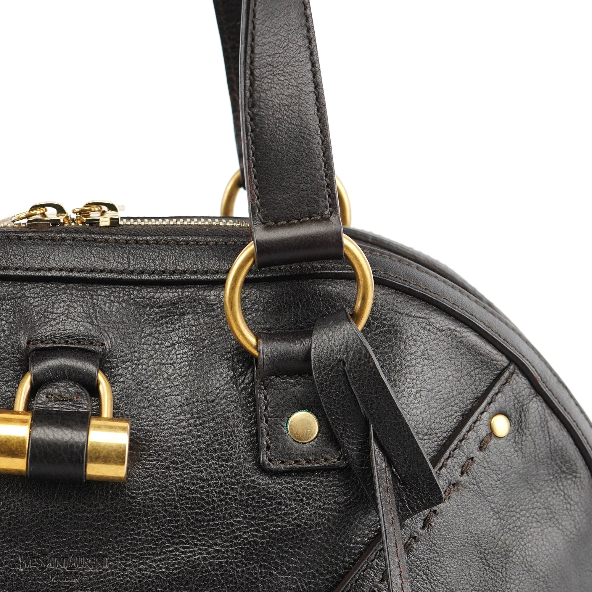 Designed in the late 2000s, this large vintage Yves Saint Laurent Muse handbag is crafted from dark brown calfskin leather with dual top handles. The structured silhouette features gold-tone hardware and a top zip closure with a padlock accent. The interior is lined in black fabric with one zippered pocket and one small pocket.