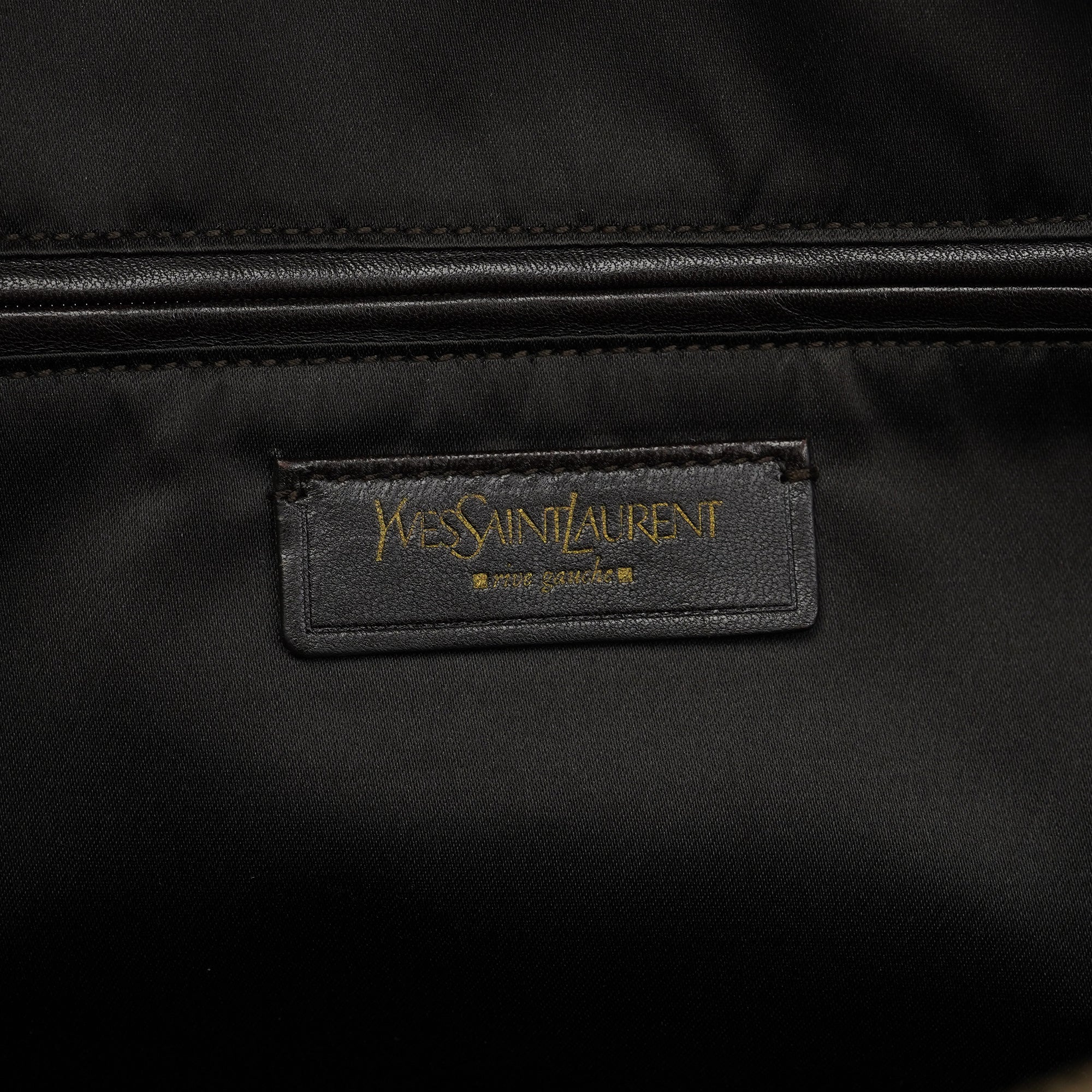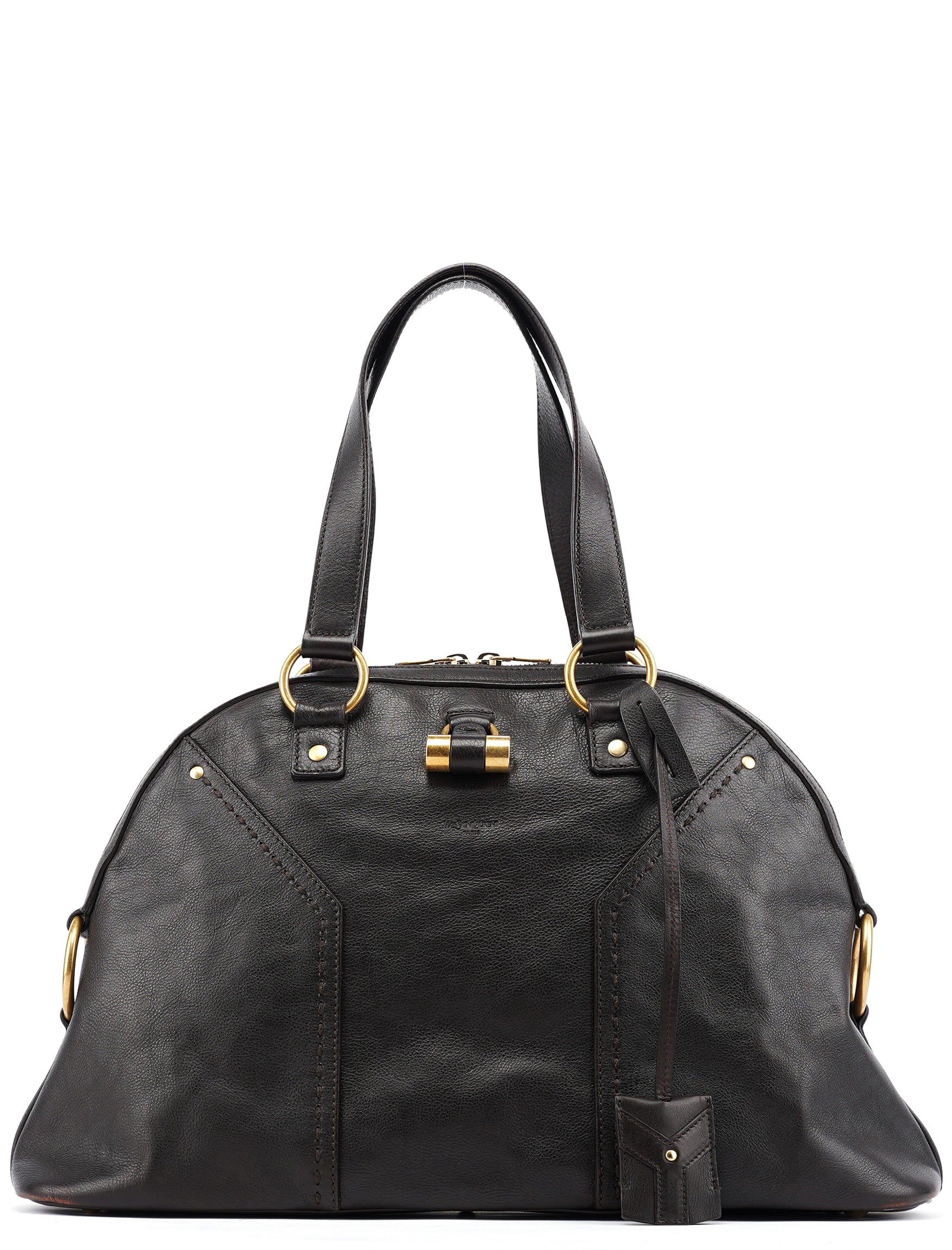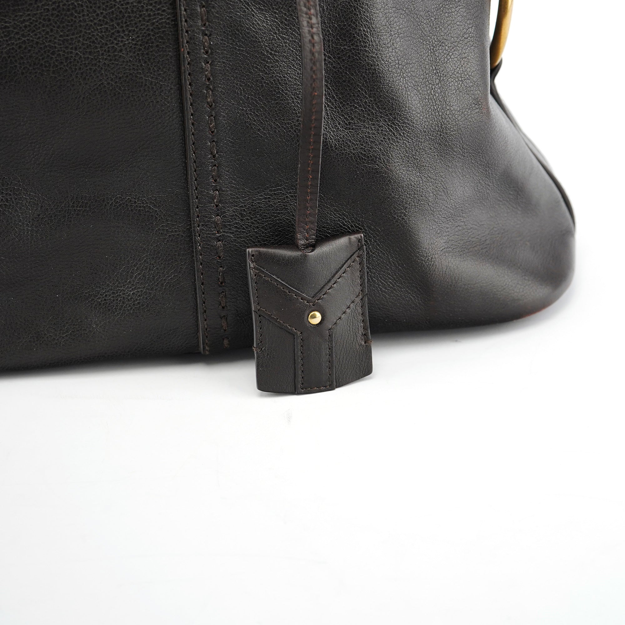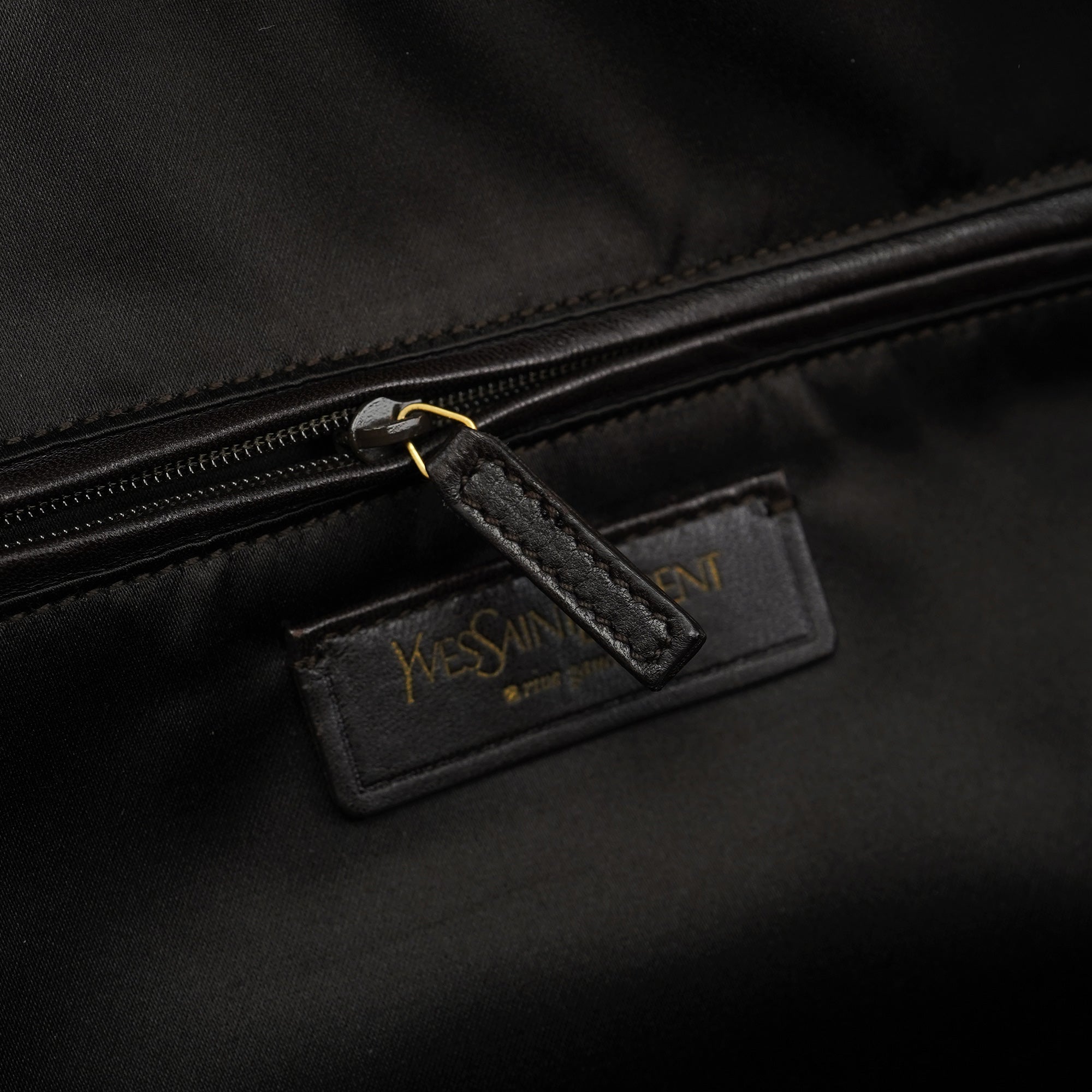 Designed in the late 2000s, this large vintage Yves Saint Laurent Muse handbag is crafted from dark brown calfskin leather with dual top handles. The structured silhouette features gold-tone hardware and a top zip closure with a padlock accent. The interior is lined in black fabric with one zippered pocket and one small pocket.