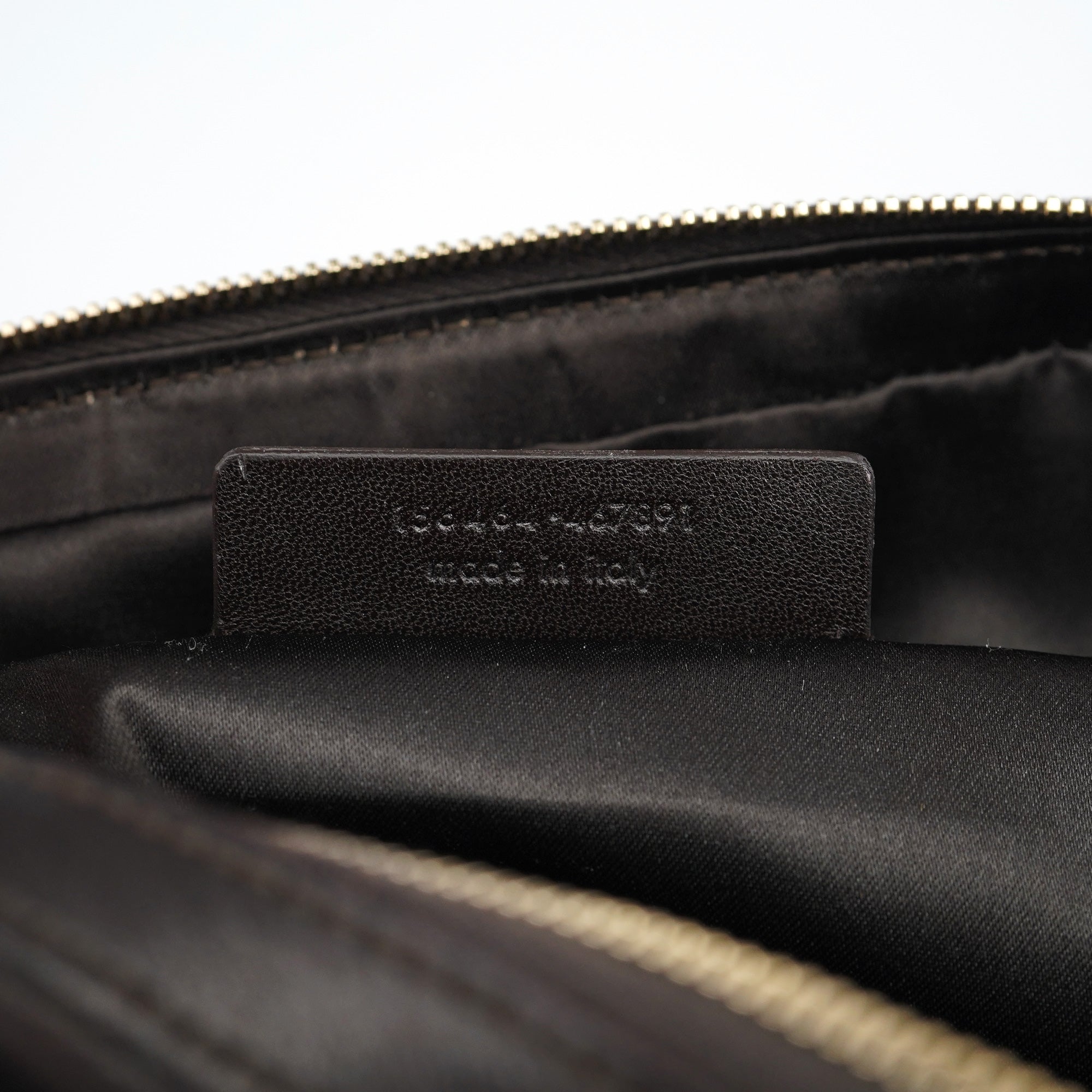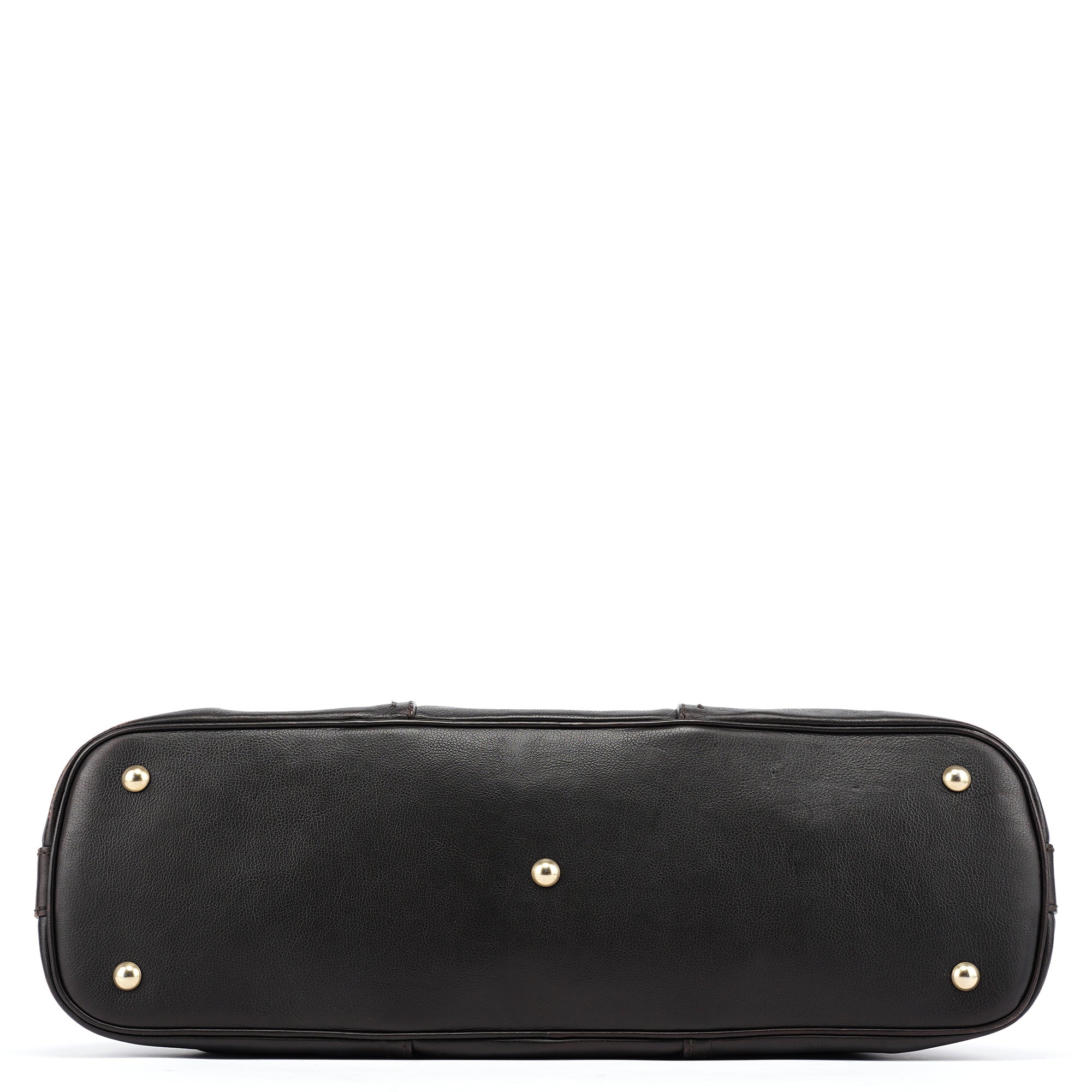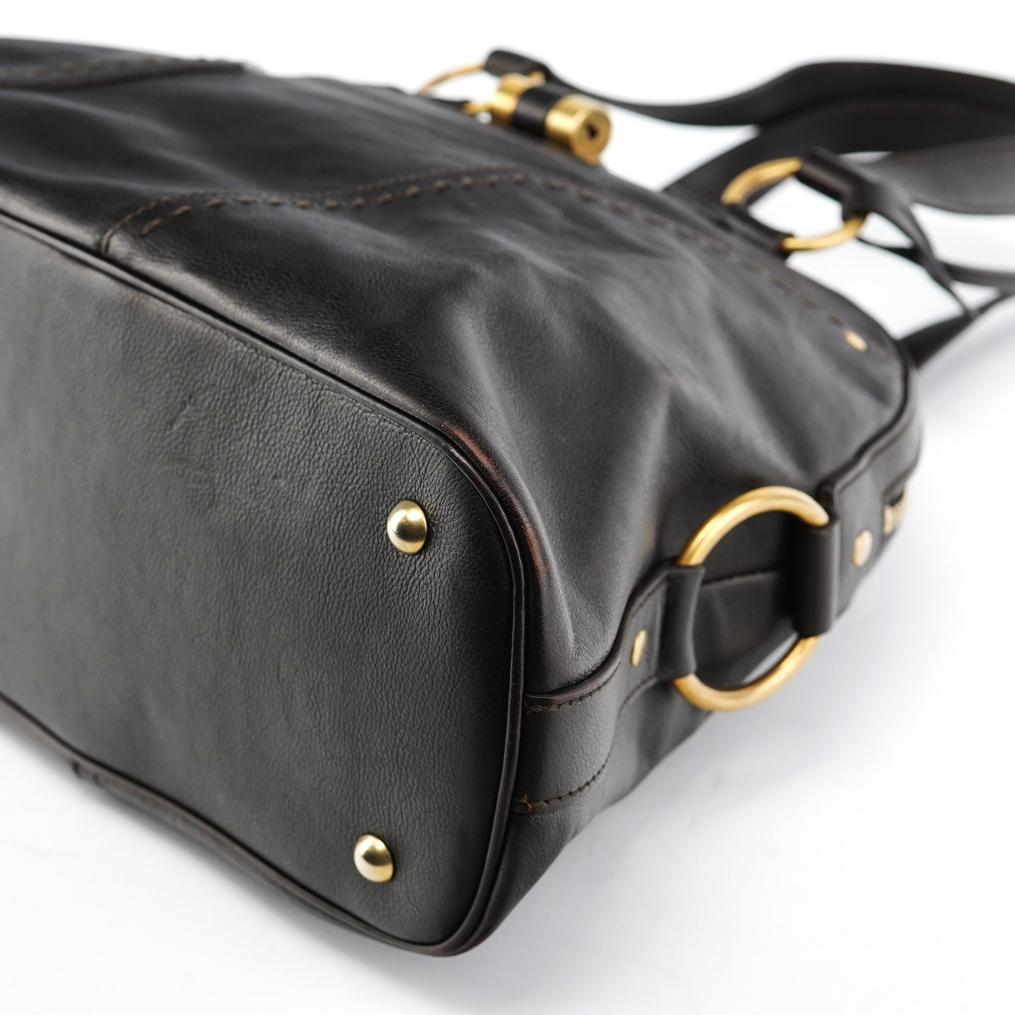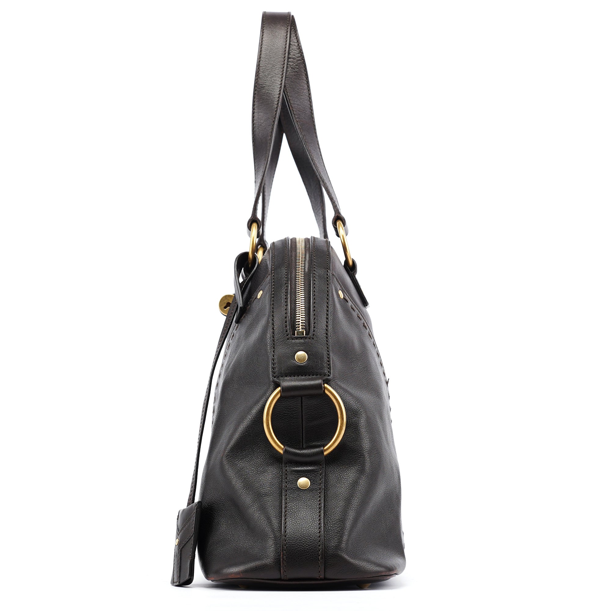 Designed in the late 2000s, this large vintage Yves Saint Laurent Muse handbag is crafted from dark brown calfskin leather with dual top handles. The structured silhouette features gold-tone hardware and a top zip closure with a padlock accent. The interior is lined in black fabric with one zippered pocket and one small pocket.