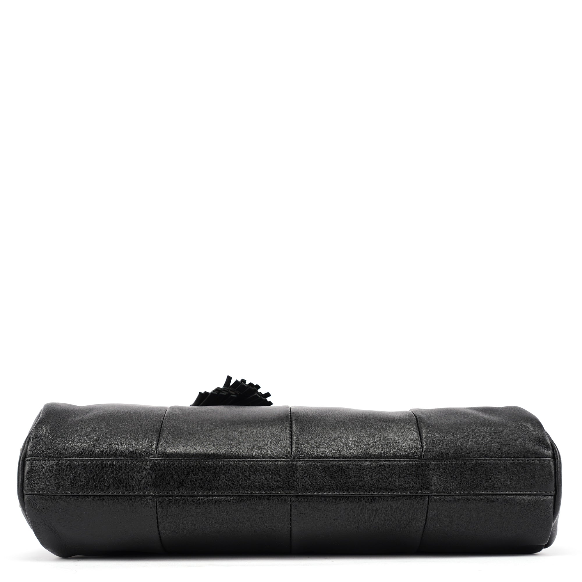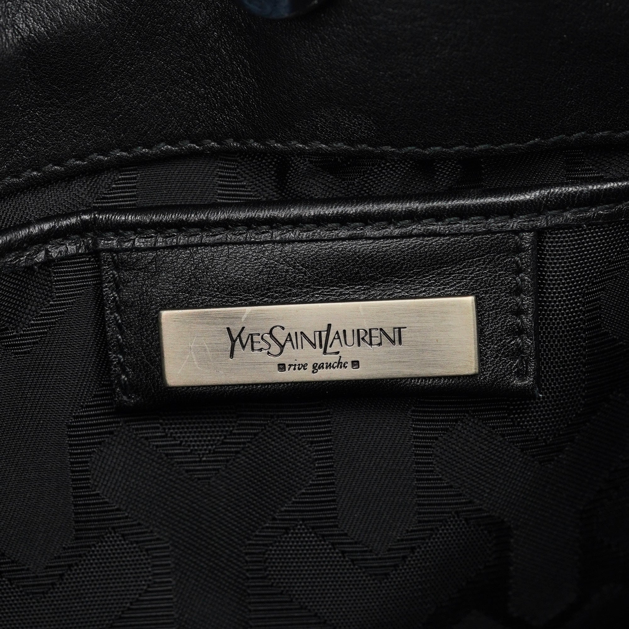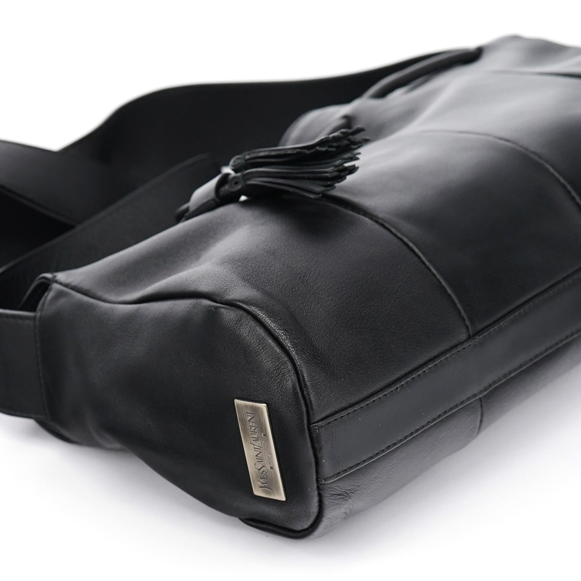 Designed in the early 2000s by Tom Ford, this vintage Yves Saint Laurent shoulder bag is crafted in black calfskin leather with a curved silhouette and drawstring tassel detailing. The side is finished with a rectangular YSL logo plaque in silver-tone metal, and the interior is lined in satin with a single zip pocket.