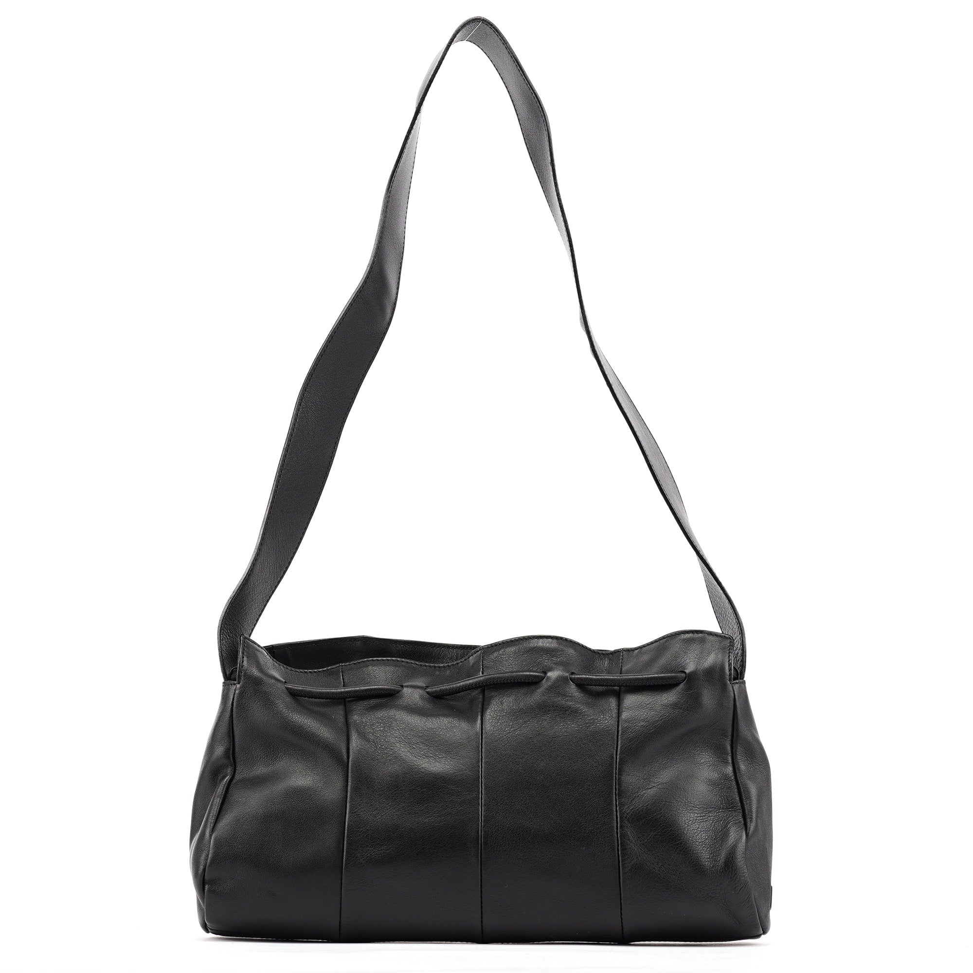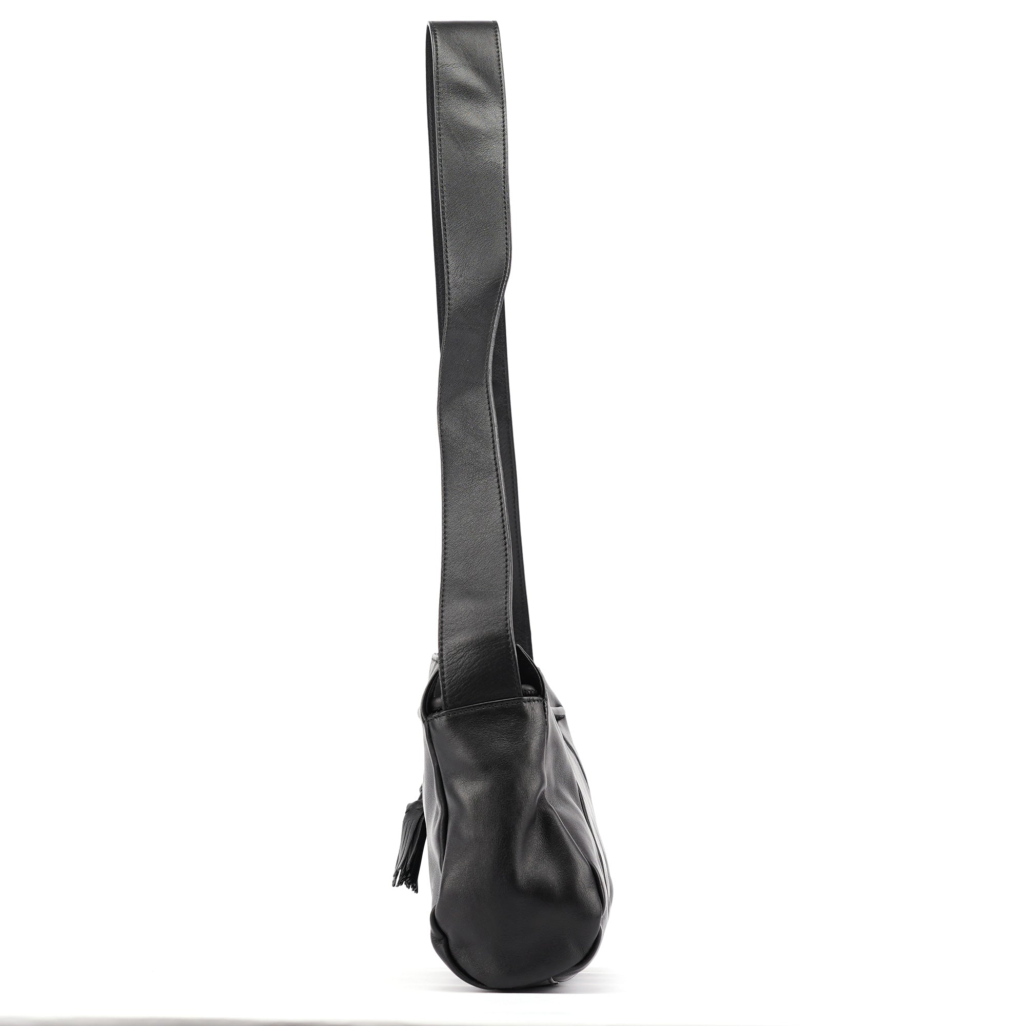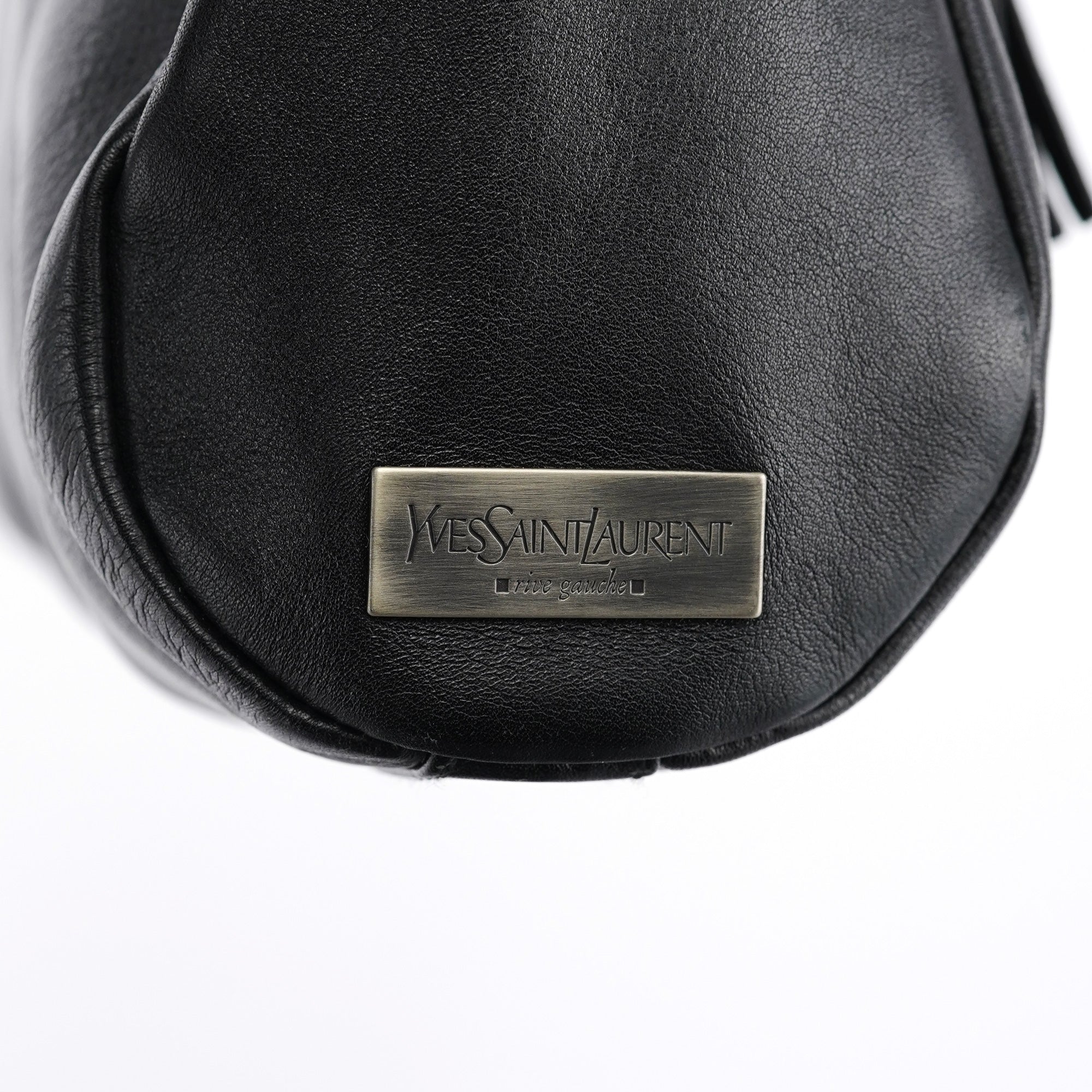 Designed in the early 2000s by Tom Ford, this vintage Yves Saint Laurent shoulder bag is crafted in black calfskin leather with a curved silhouette and drawstring tassel detailing. The side is finished with a rectangular YSL logo plaque in silver-tone metal, and the interior is lined in satin with a single zip pocket.