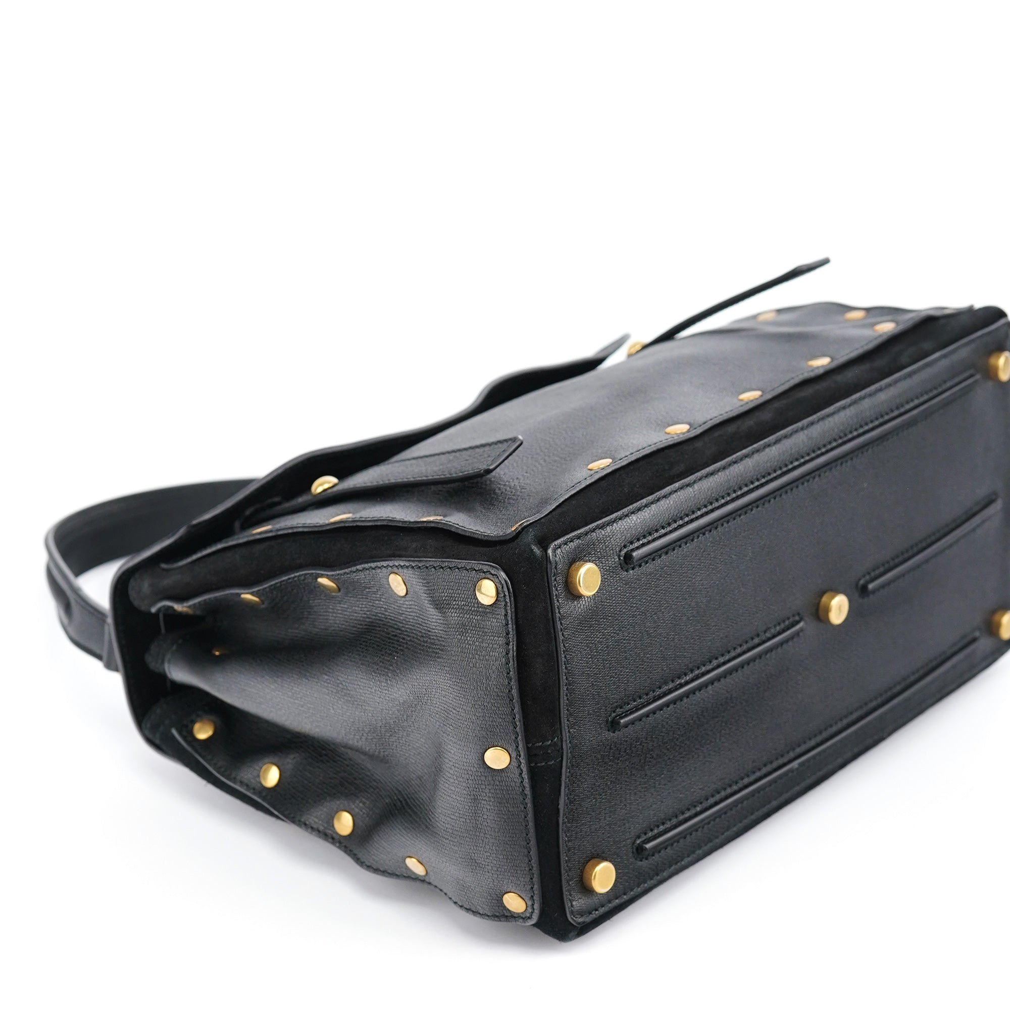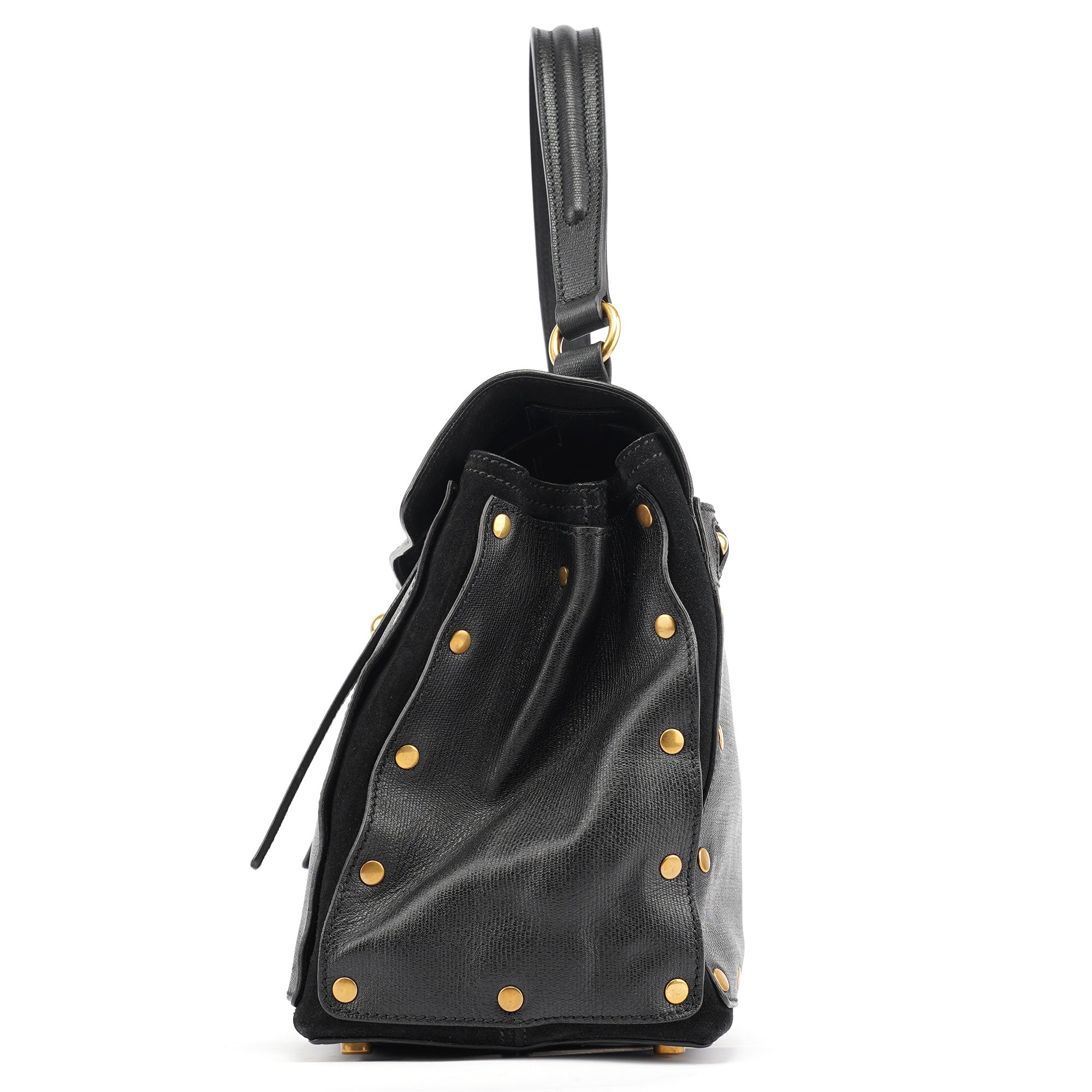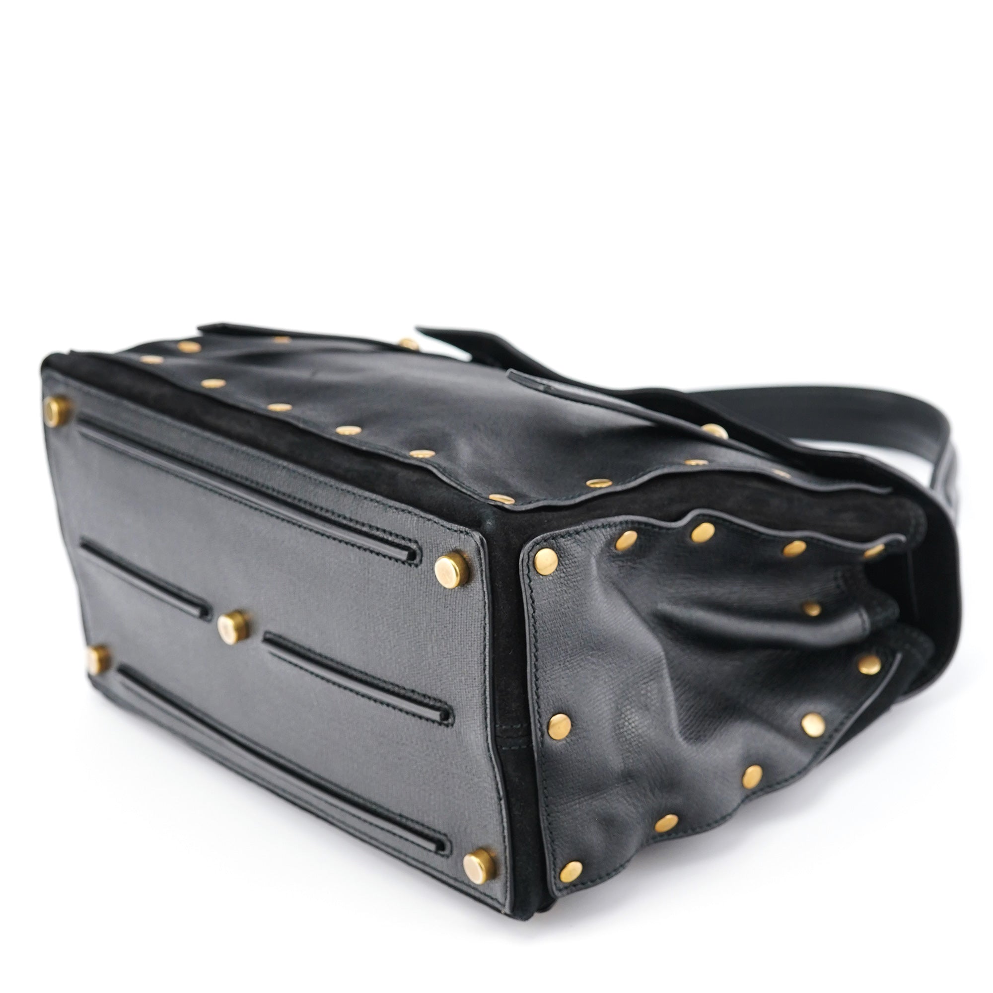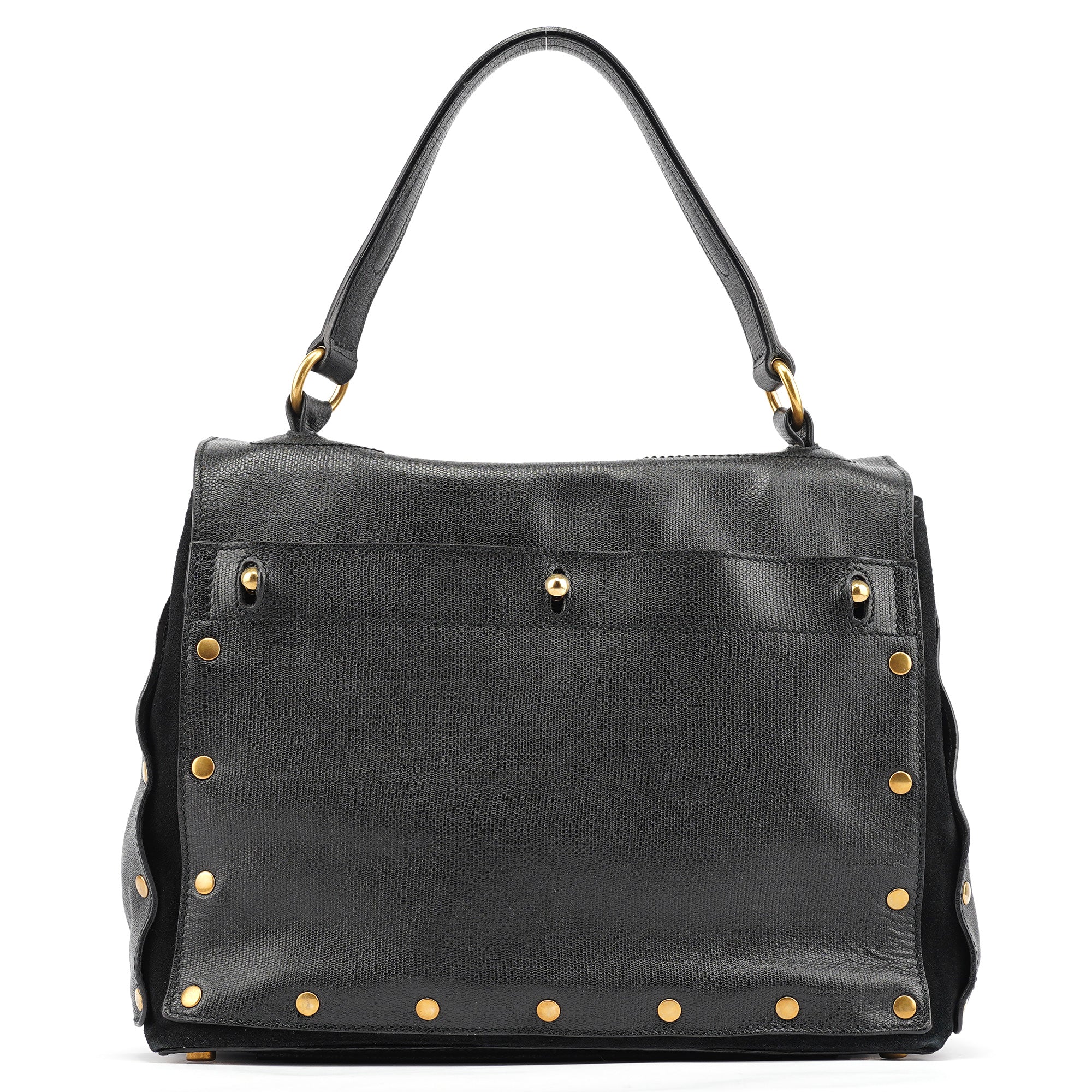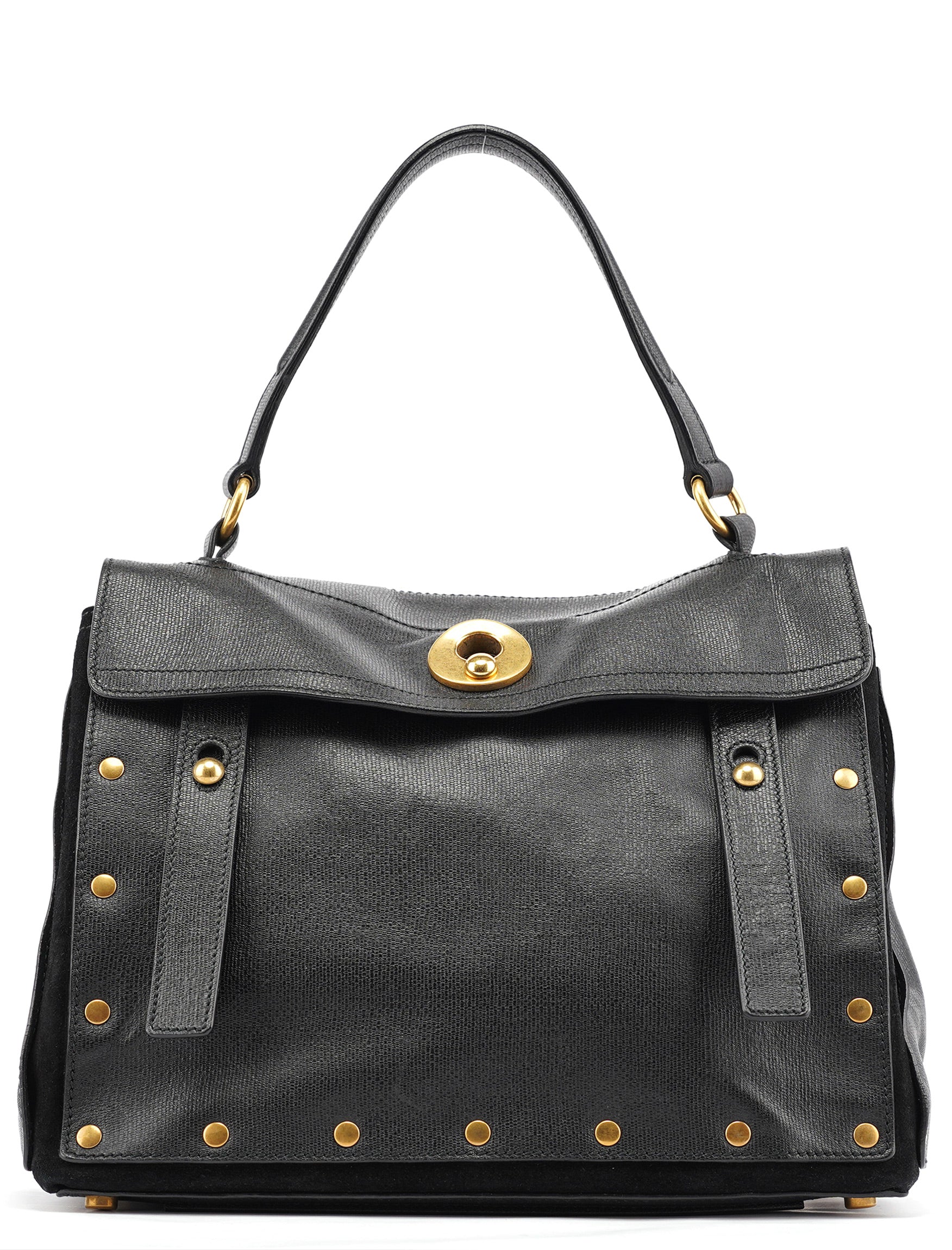 Designed in the late 2000s, this vintage Yves Saint Laurent Muse Two handbag features black textured leather contrasted with soft suede panels and distinctive gold-tone stud detailing around the edges. The structured silhouette showcases a fold-over flap with signature turn-lock closure, top handle, and a leather and suede-lined interior with zipper pocket.