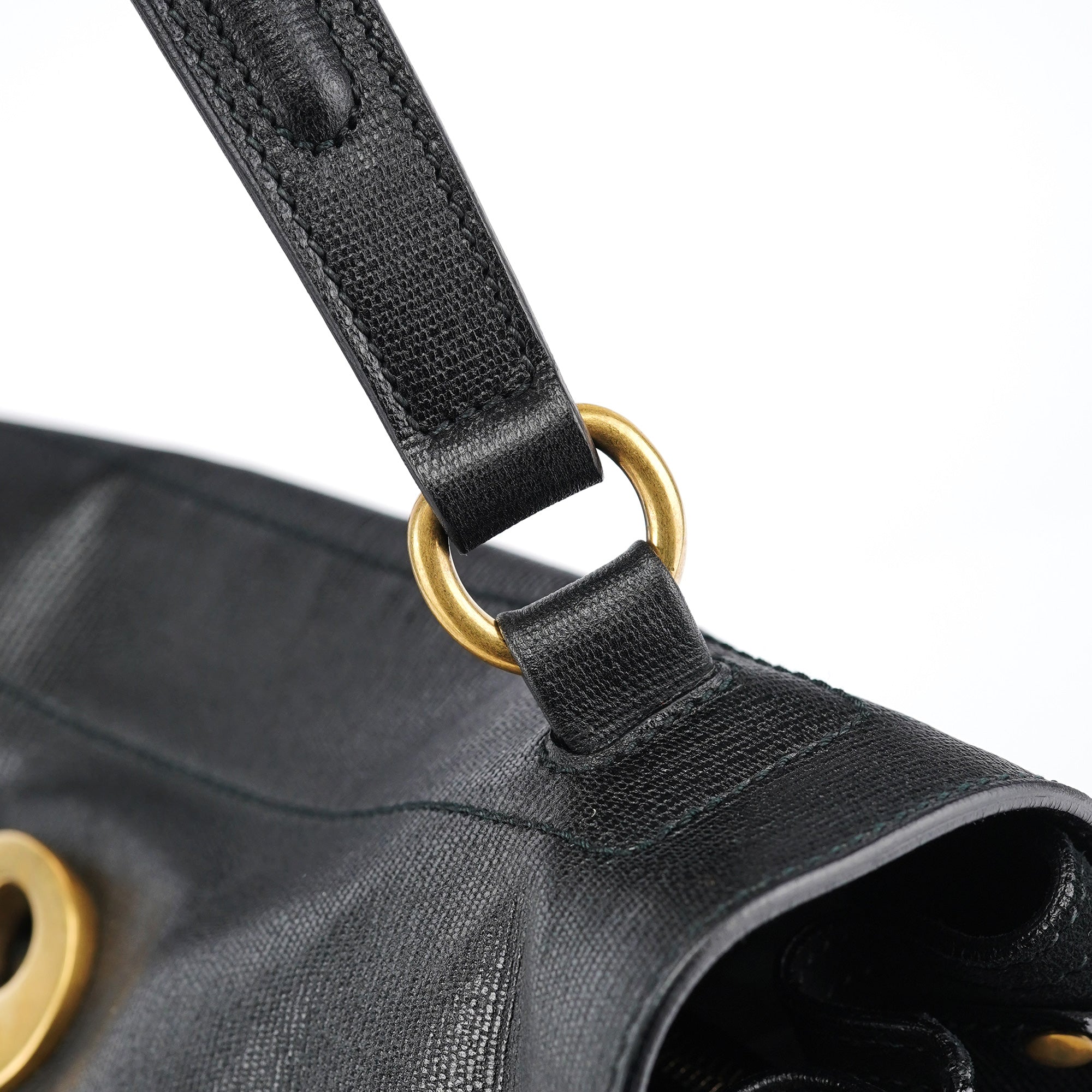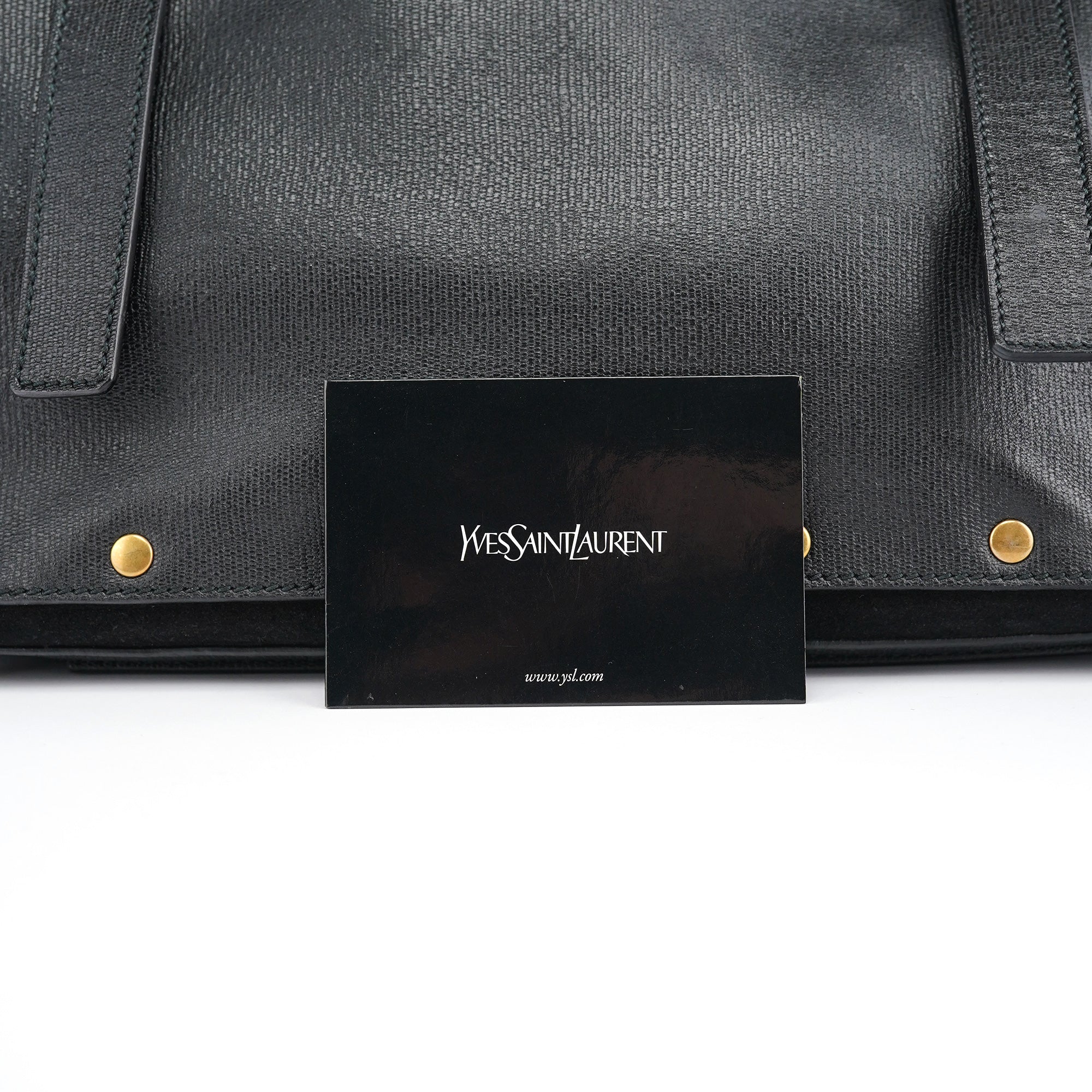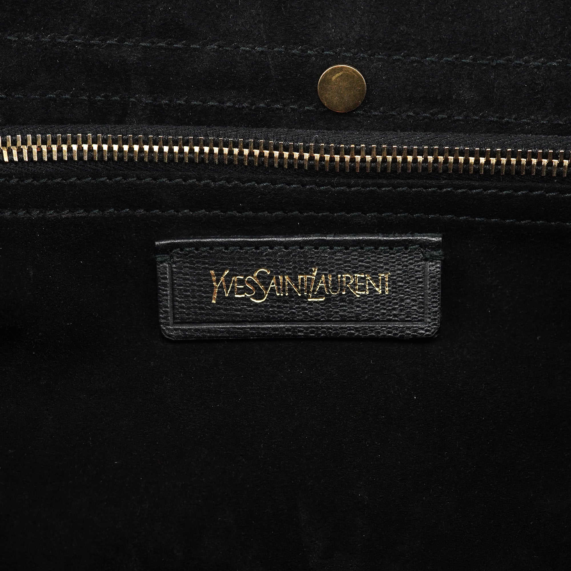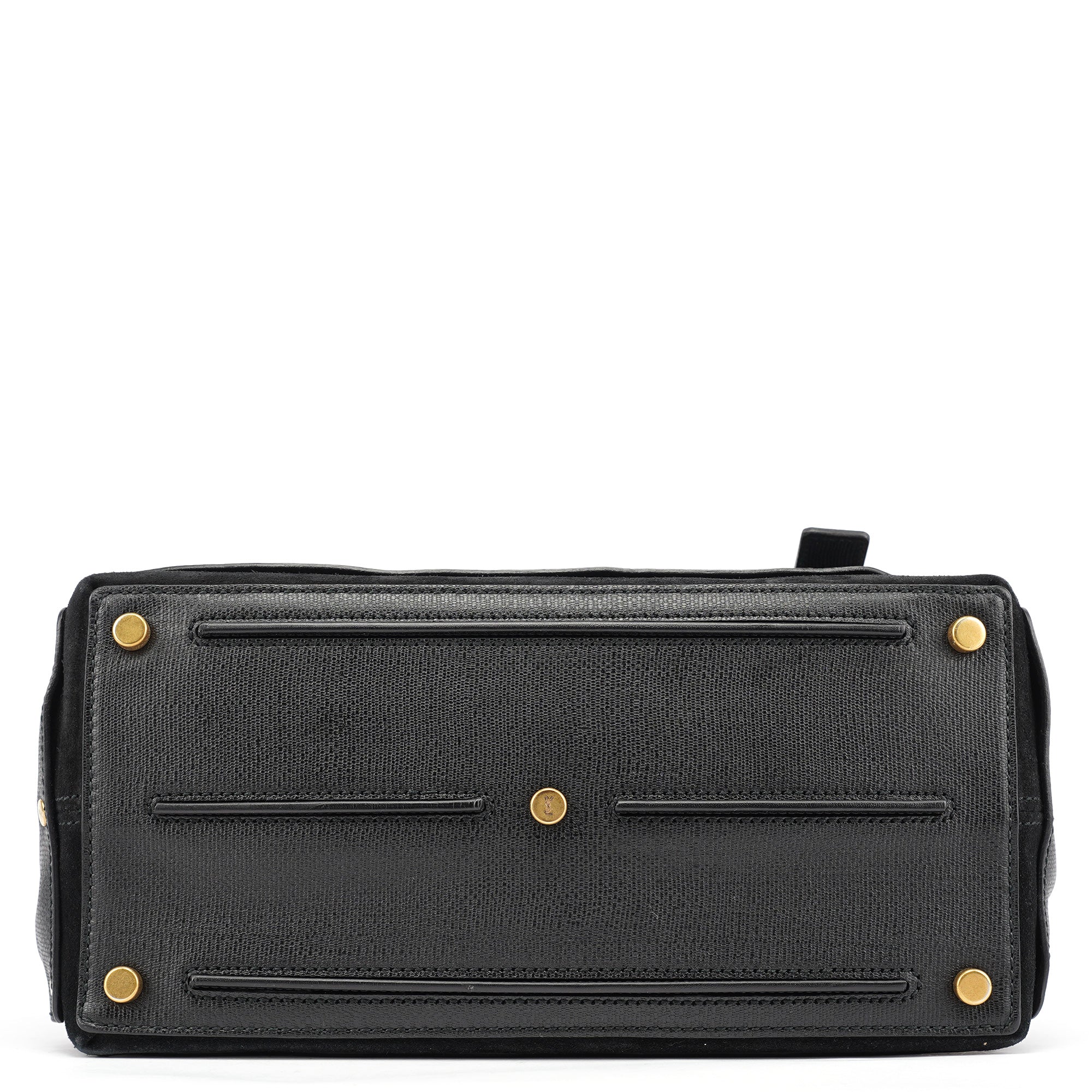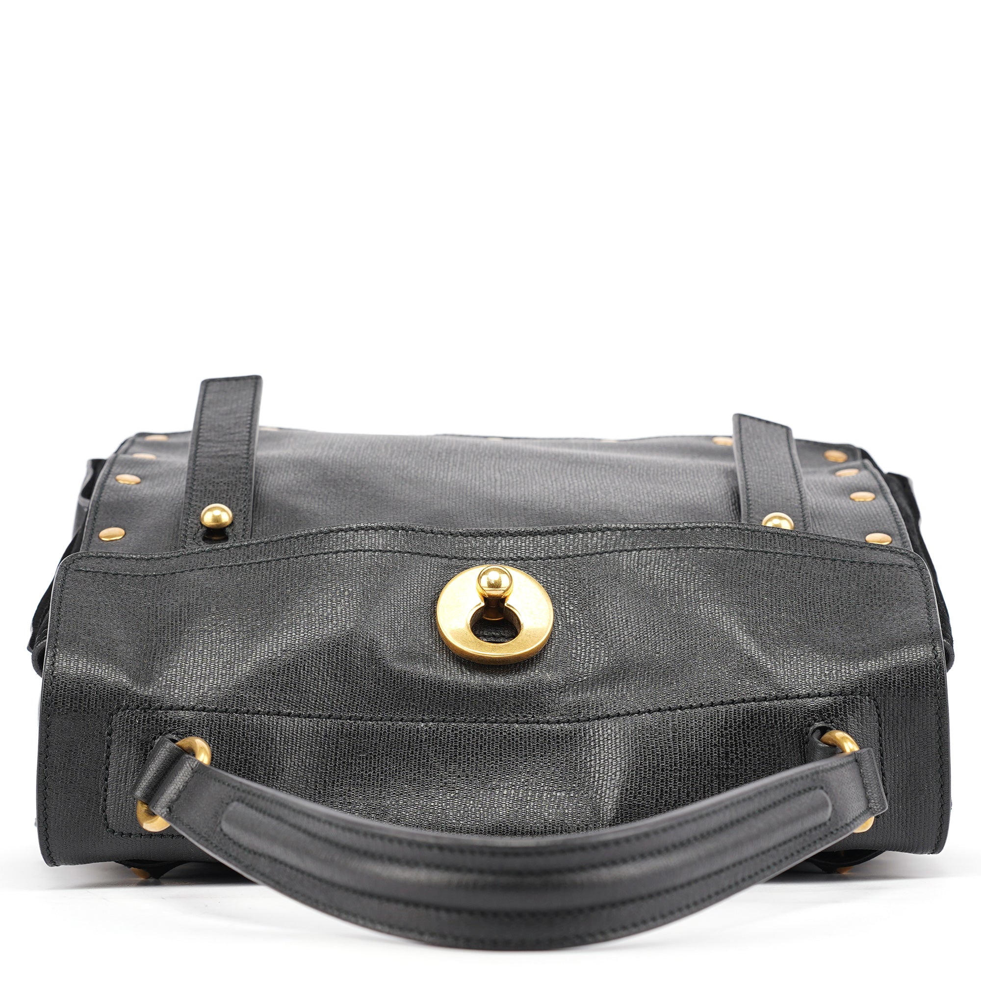 Designed in the late 2000s, this vintage Yves Saint Laurent Muse Two handbag features black textured leather contrasted with soft suede panels and distinctive gold-tone stud detailing around the edges. The structured silhouette showcases a fold-over flap with signature turn-lock closure, top handle, and a leather and suede-lined interior with zipper pocket.