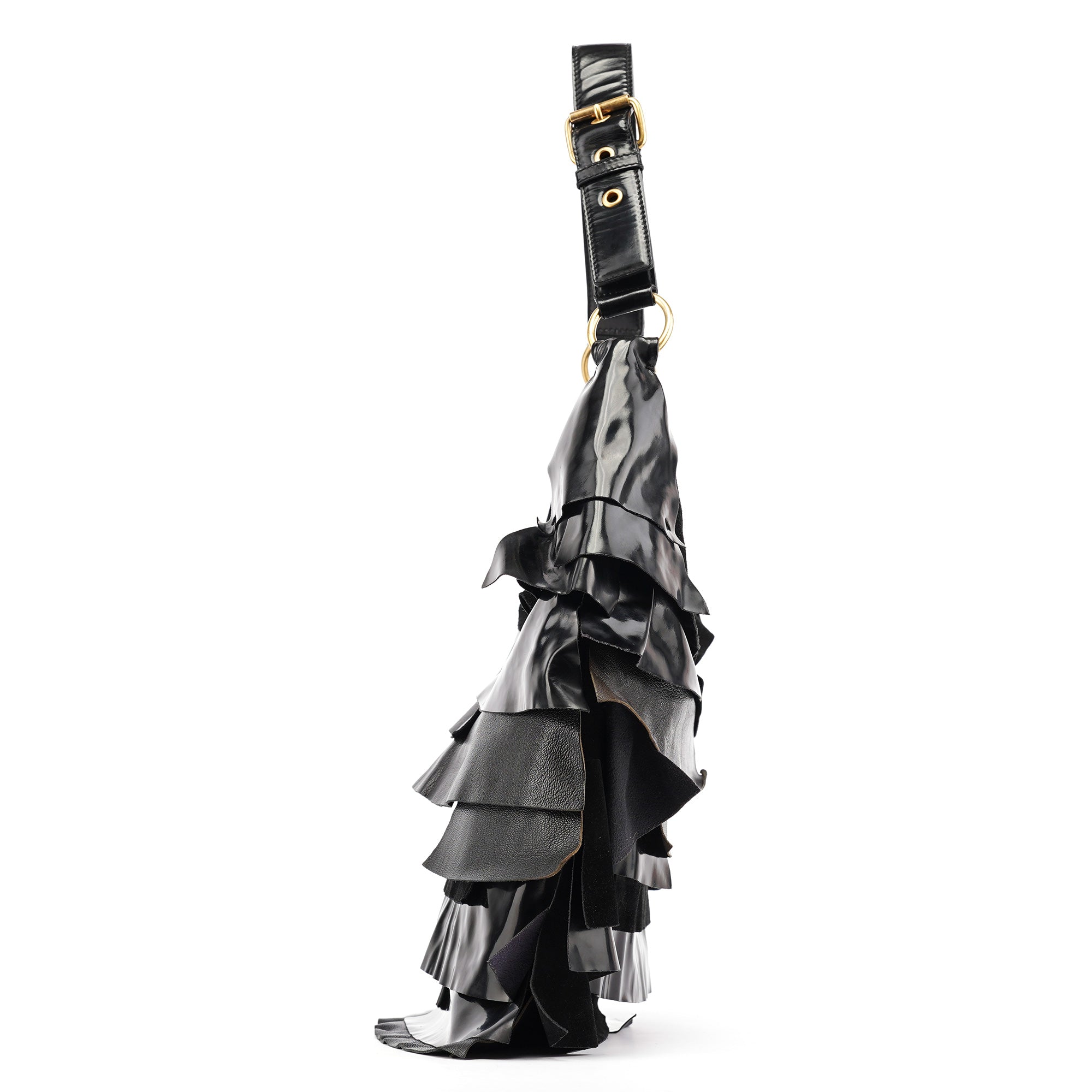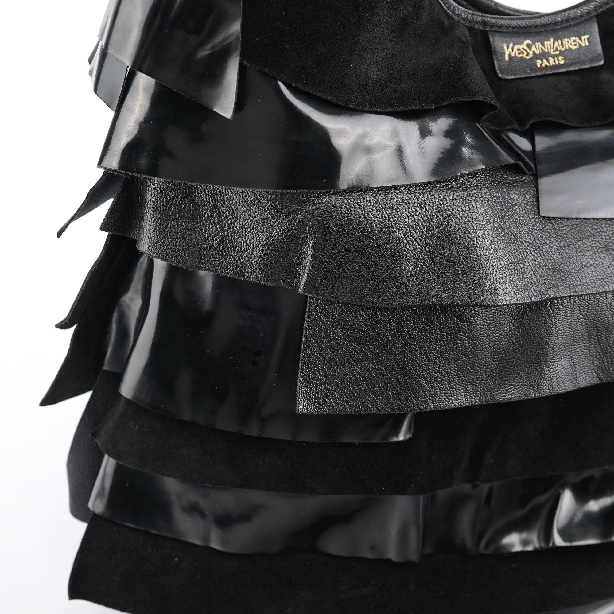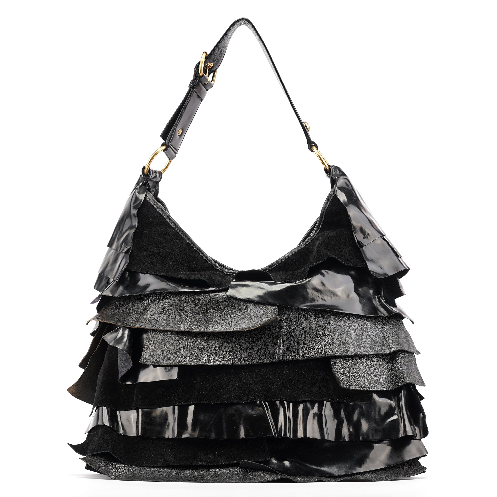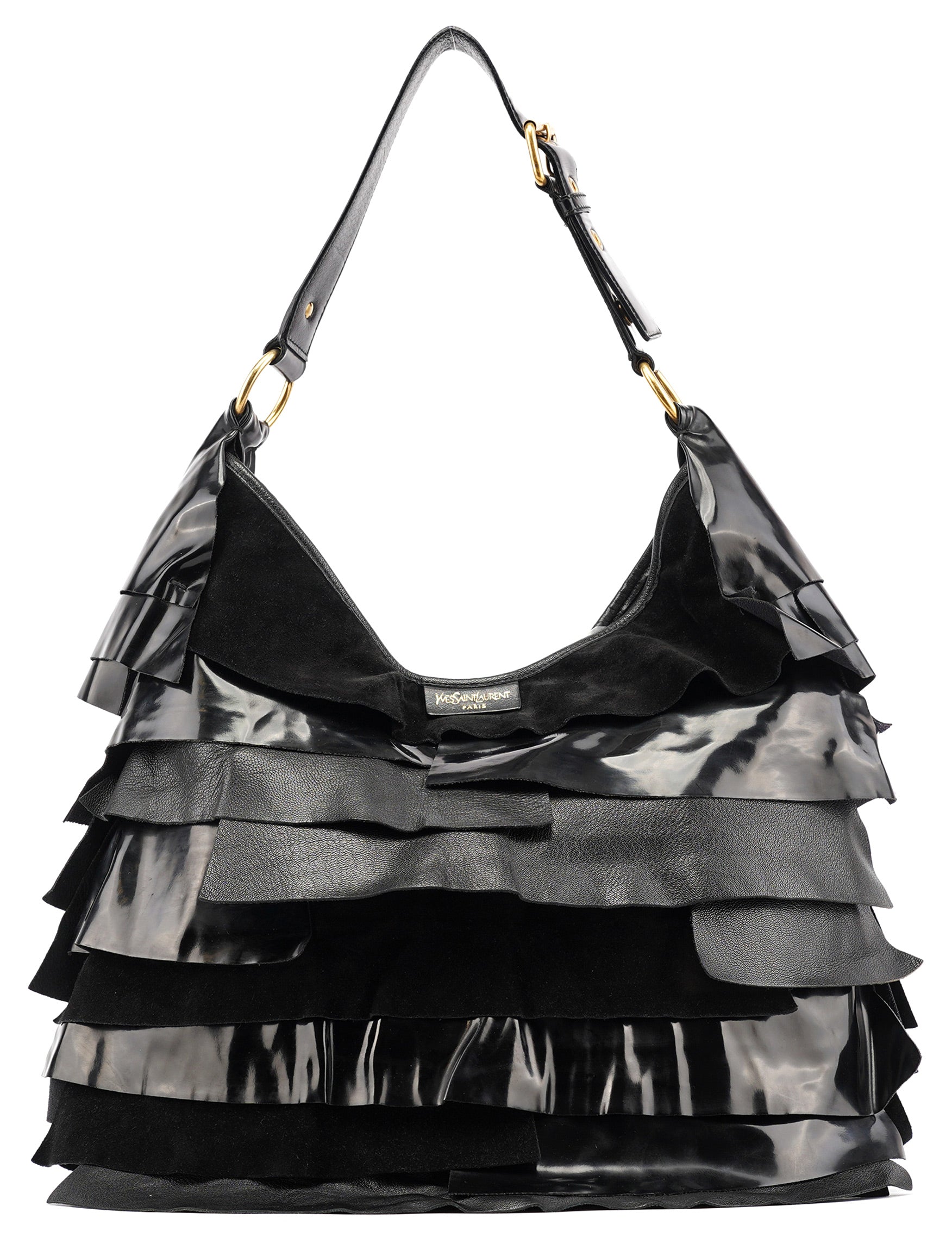 Designed in the early 2000s by Tom Ford, this vintage Yves Saint Laurent Saint Tropez shoulder bag is crafted from black patent leather, suede, and smooth calfskin in layered ruffles. The spacious hobo silhouette is finished with an adjustable shoulder strap and tonal leather trim, while the interior is lined with suede and fitted with a zip pocket for essentials. The YSL logo is prominently displayed in gold on the front.