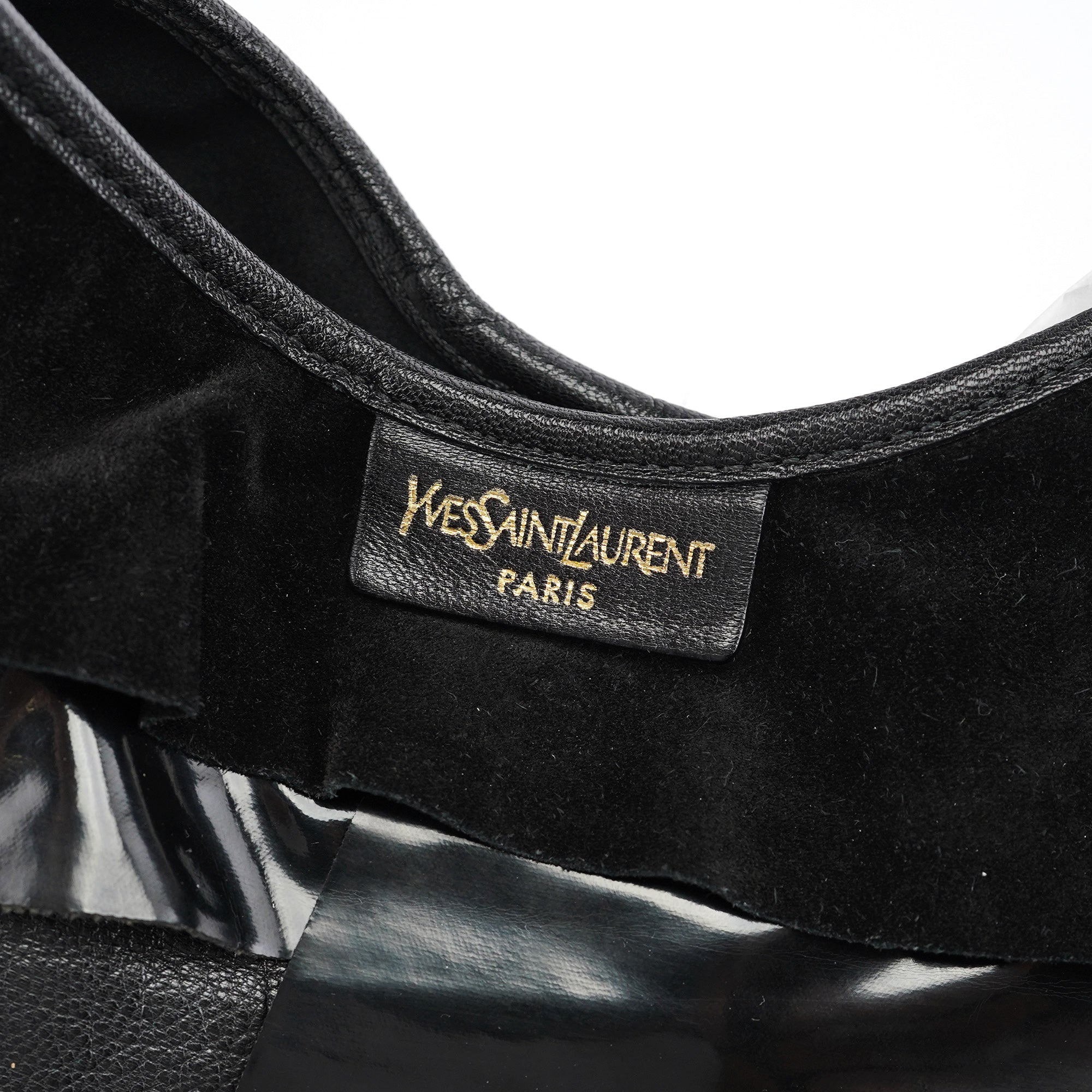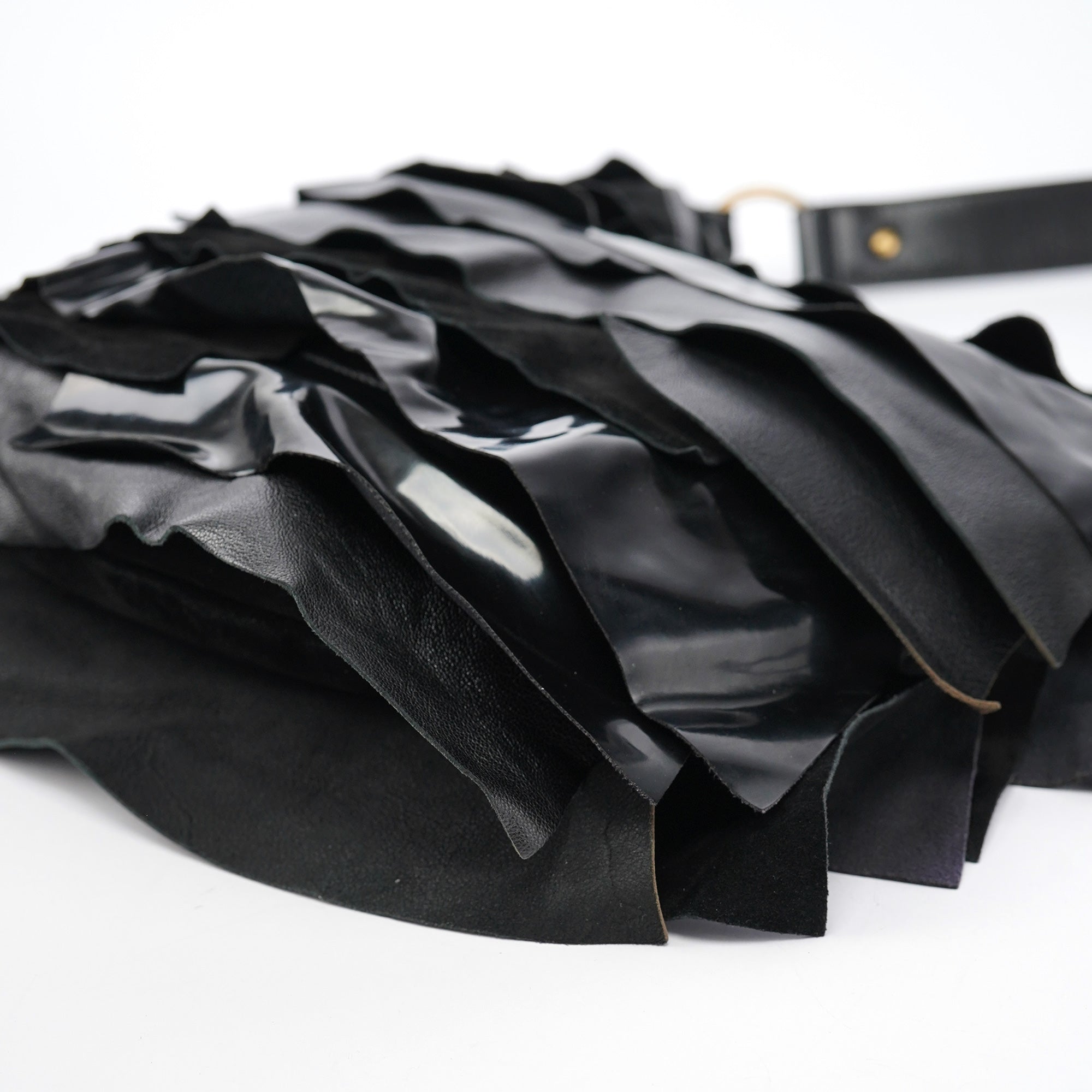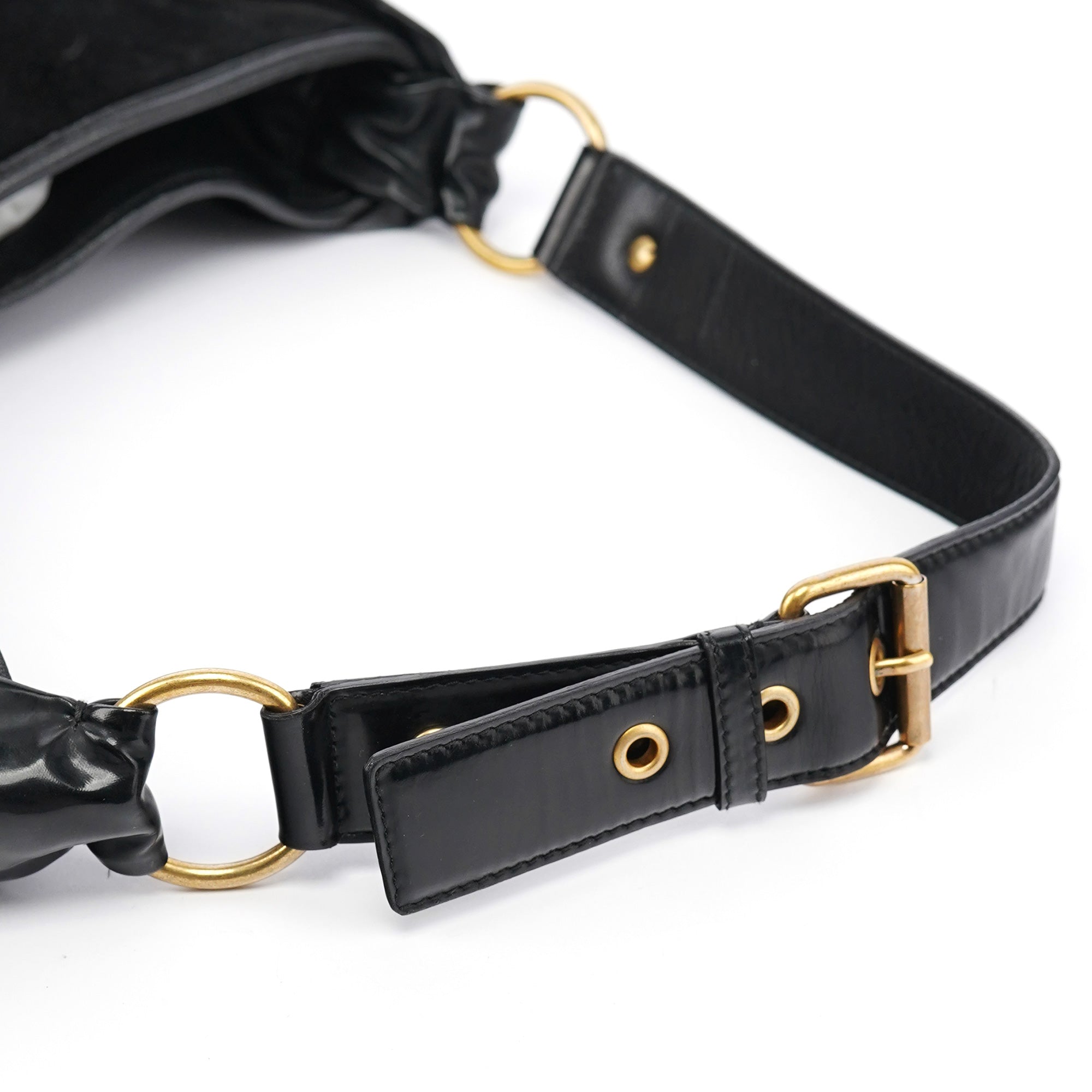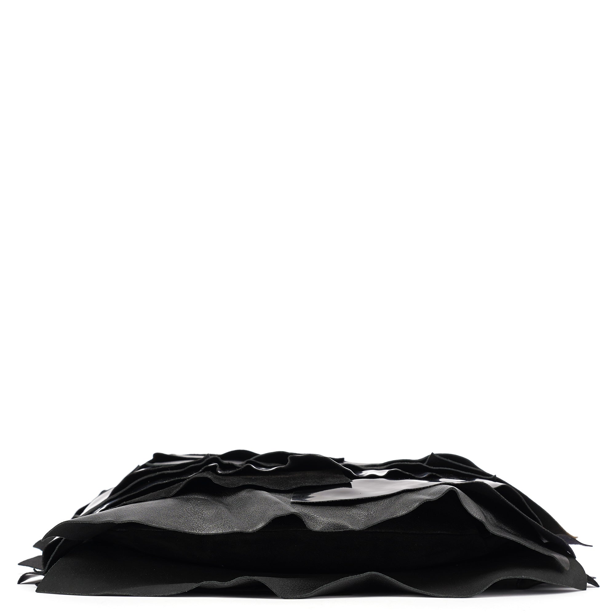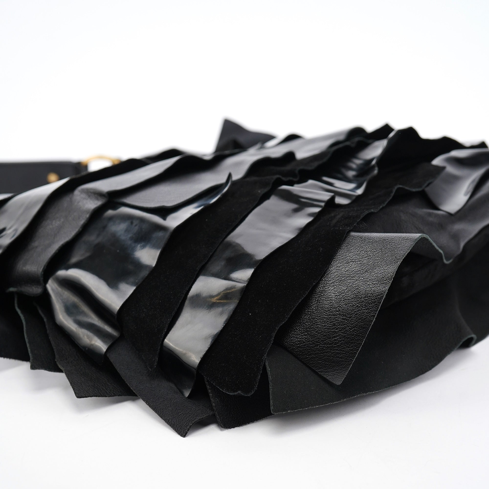 Designed in the early 2000s by Tom Ford, this vintage Yves Saint Laurent Saint Tropez shoulder bag is crafted from black patent leather, suede, and smooth calfskin in layered ruffles. The spacious hobo silhouette is finished with an adjustable shoulder strap and tonal leather trim, while the interior is lined with suede and fitted with a zip pocket for essentials. The YSL logo is prominently displayed in gold on the front.