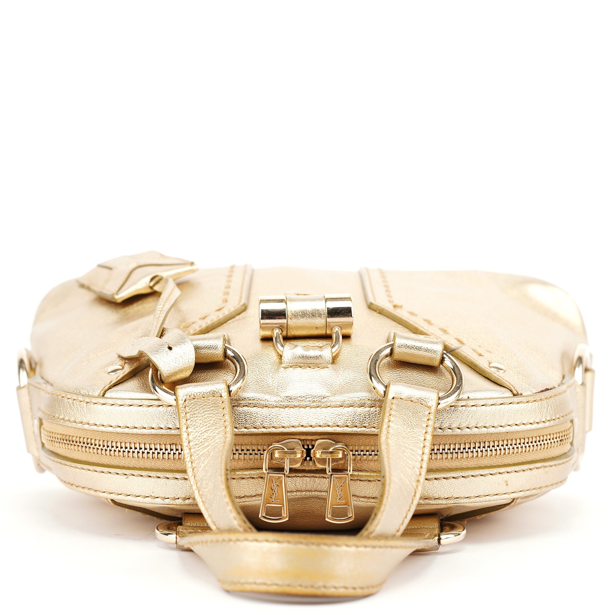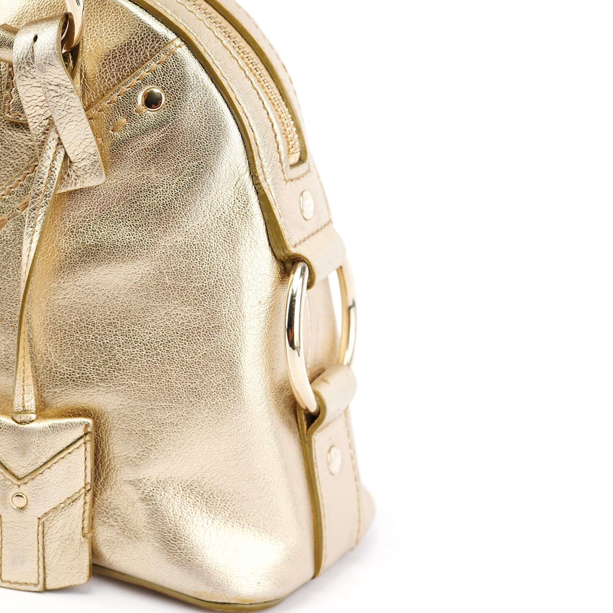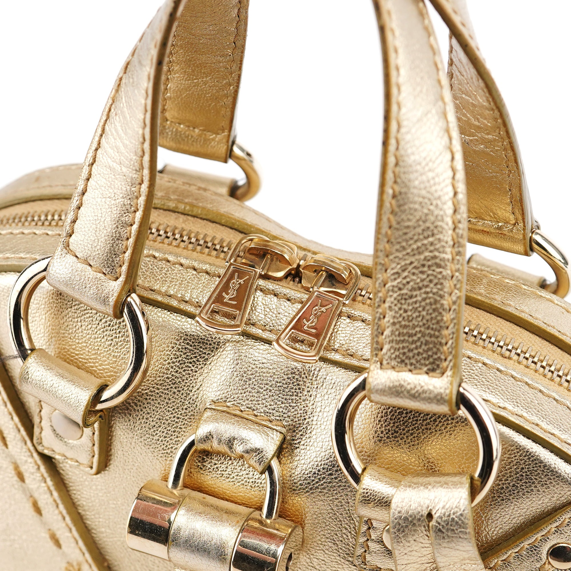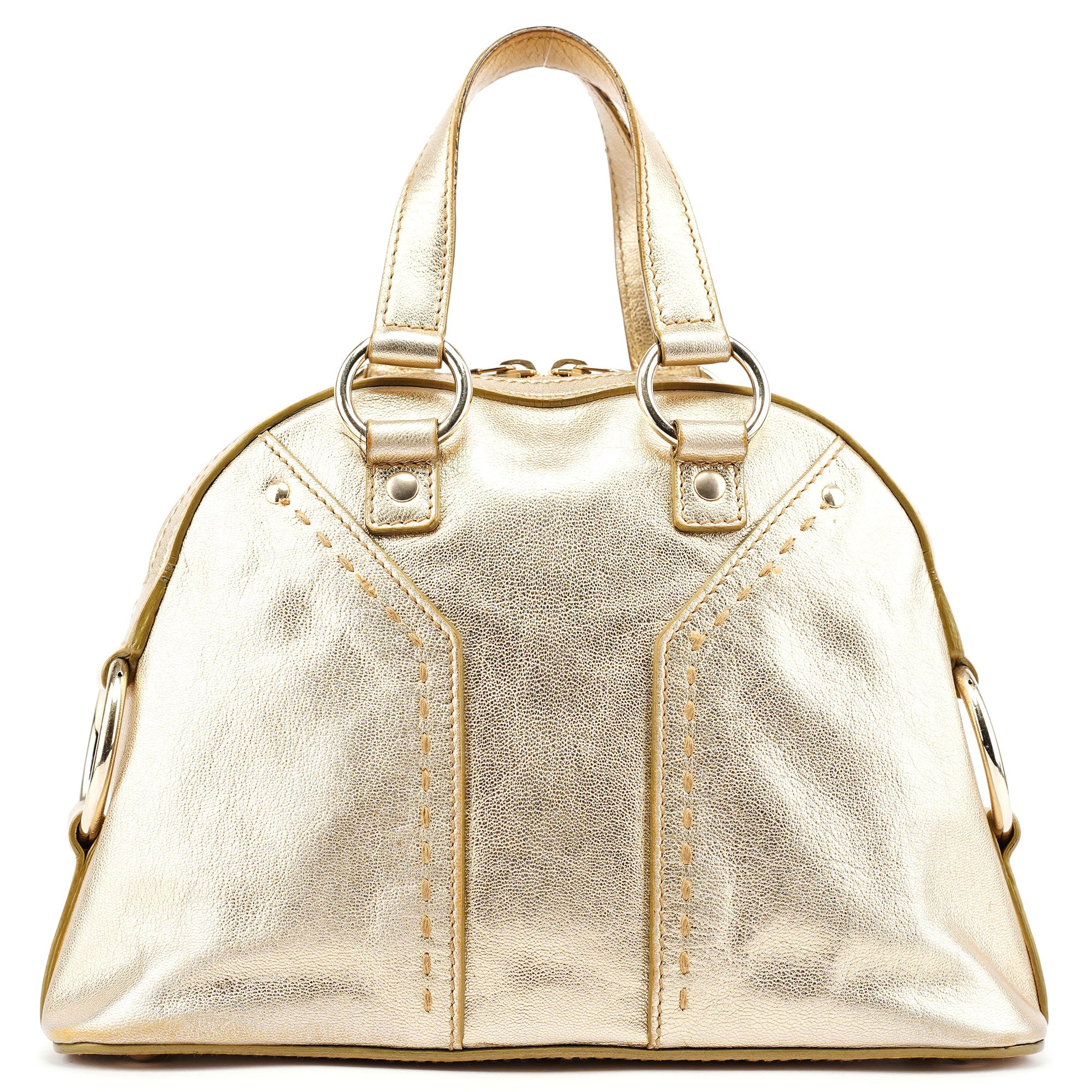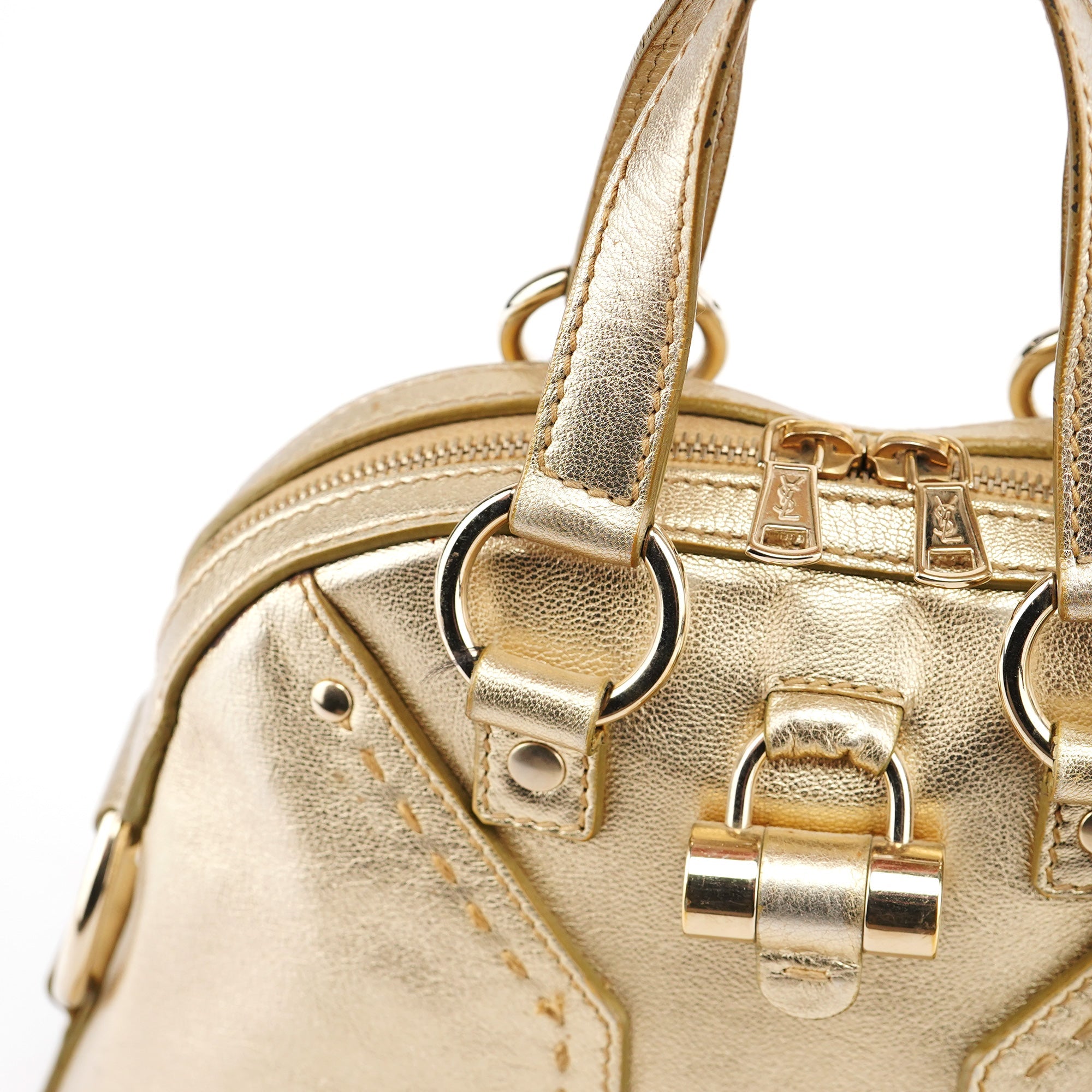 Designed in the late 2000s by Stefano Pilati, this Yves Saint Laurent Muse tote bag is crafted in metallic gold leather with structured panels, dual rolled handles, and gold-tone hardware including the signature oversized padlock detail. The zip-top closure opens to a spacious interior lined in black fabric.