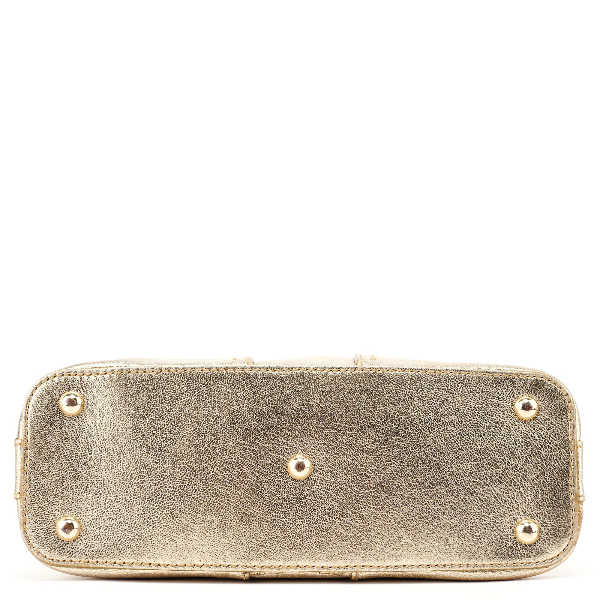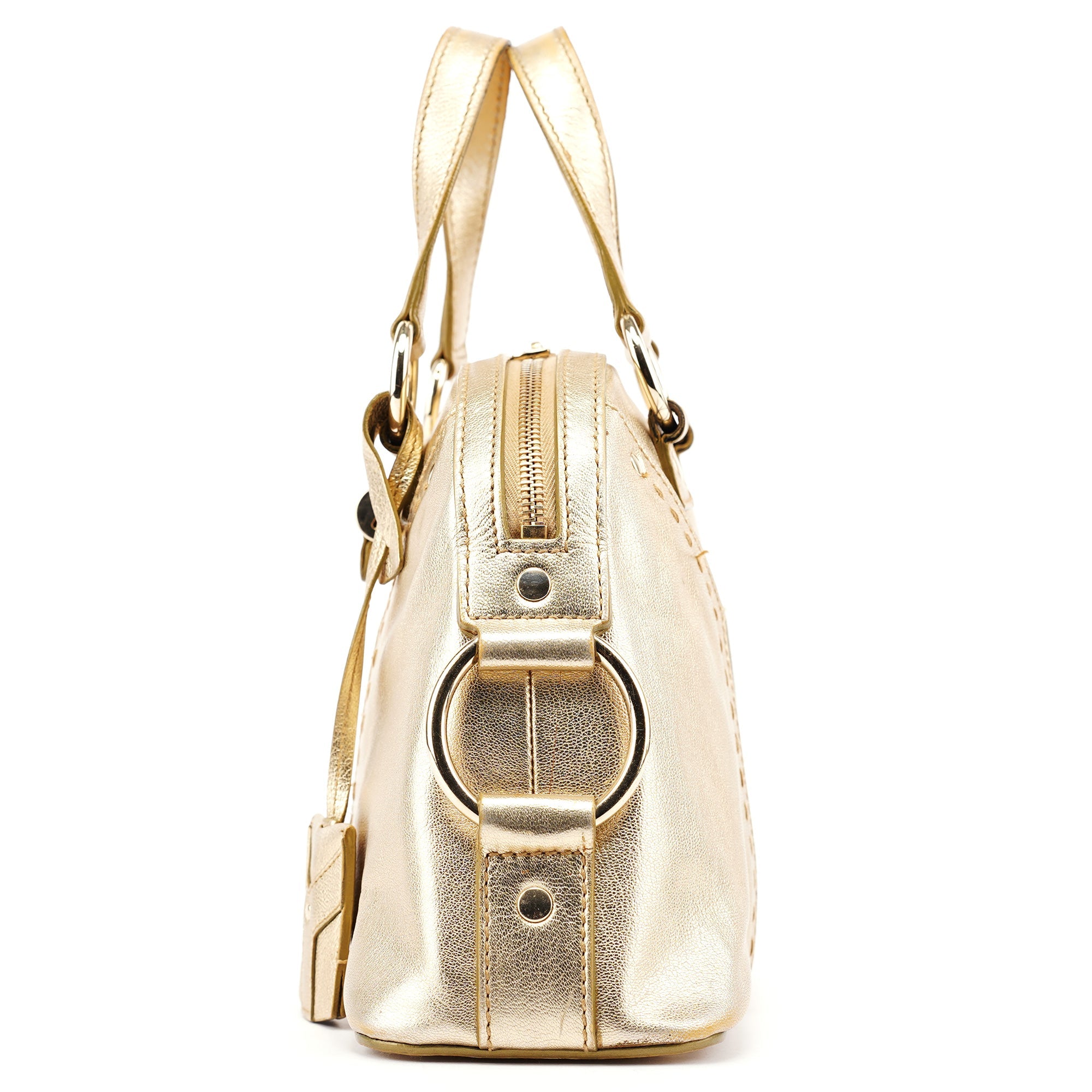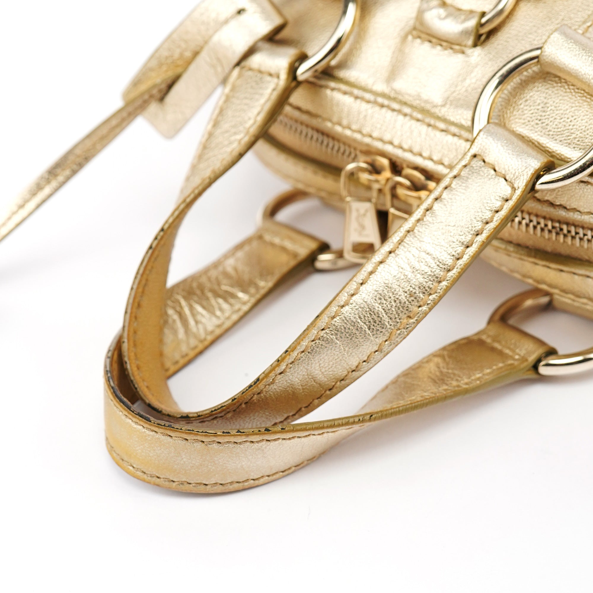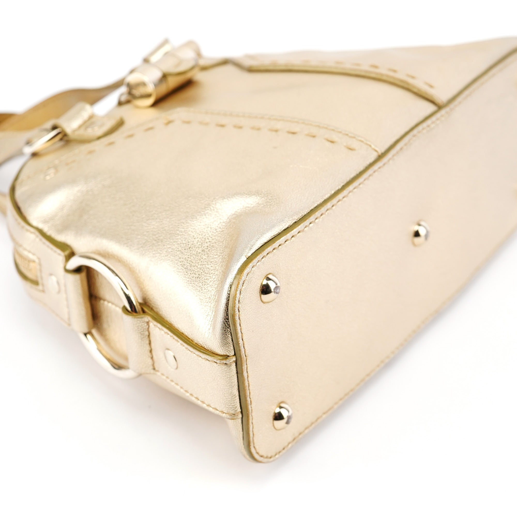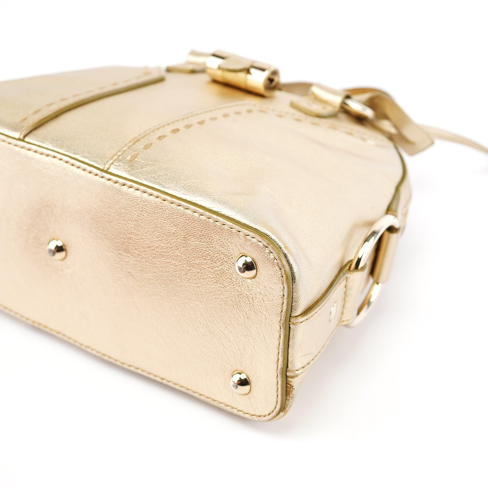 Designed in the late 2000s by Stefano Pilati, this Yves Saint Laurent Muse tote bag is crafted in metallic gold leather with structured panels, dual rolled handles, and gold-tone hardware including the signature oversized padlock detail. The zip-top closure opens to a spacious interior lined in black fabric.