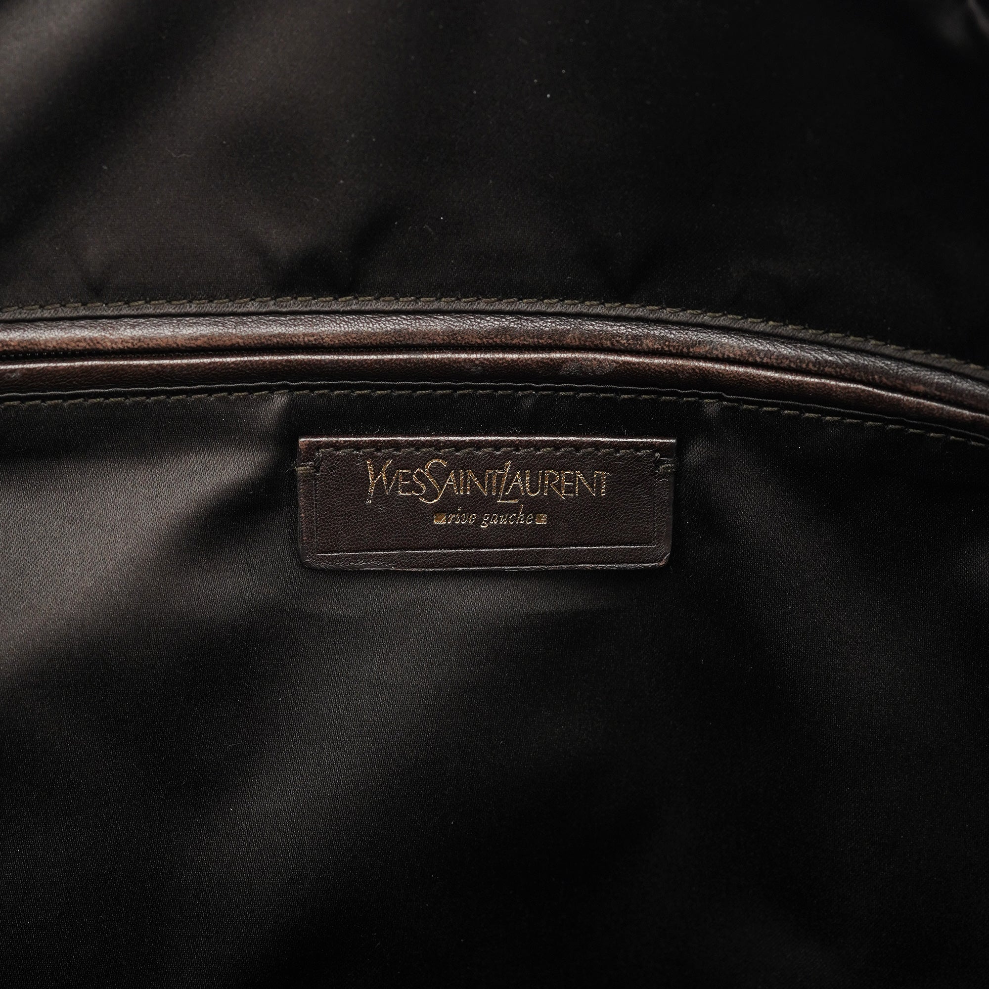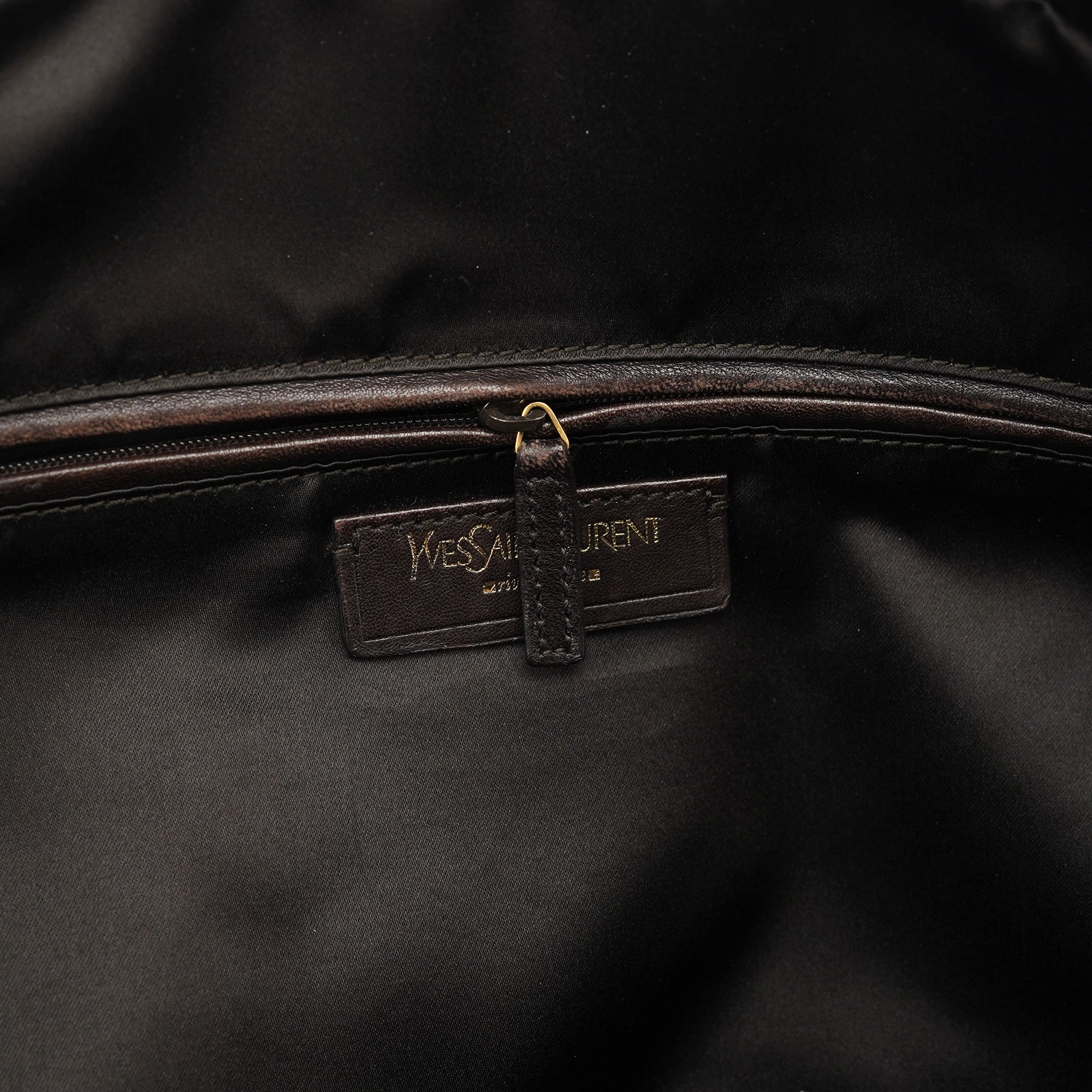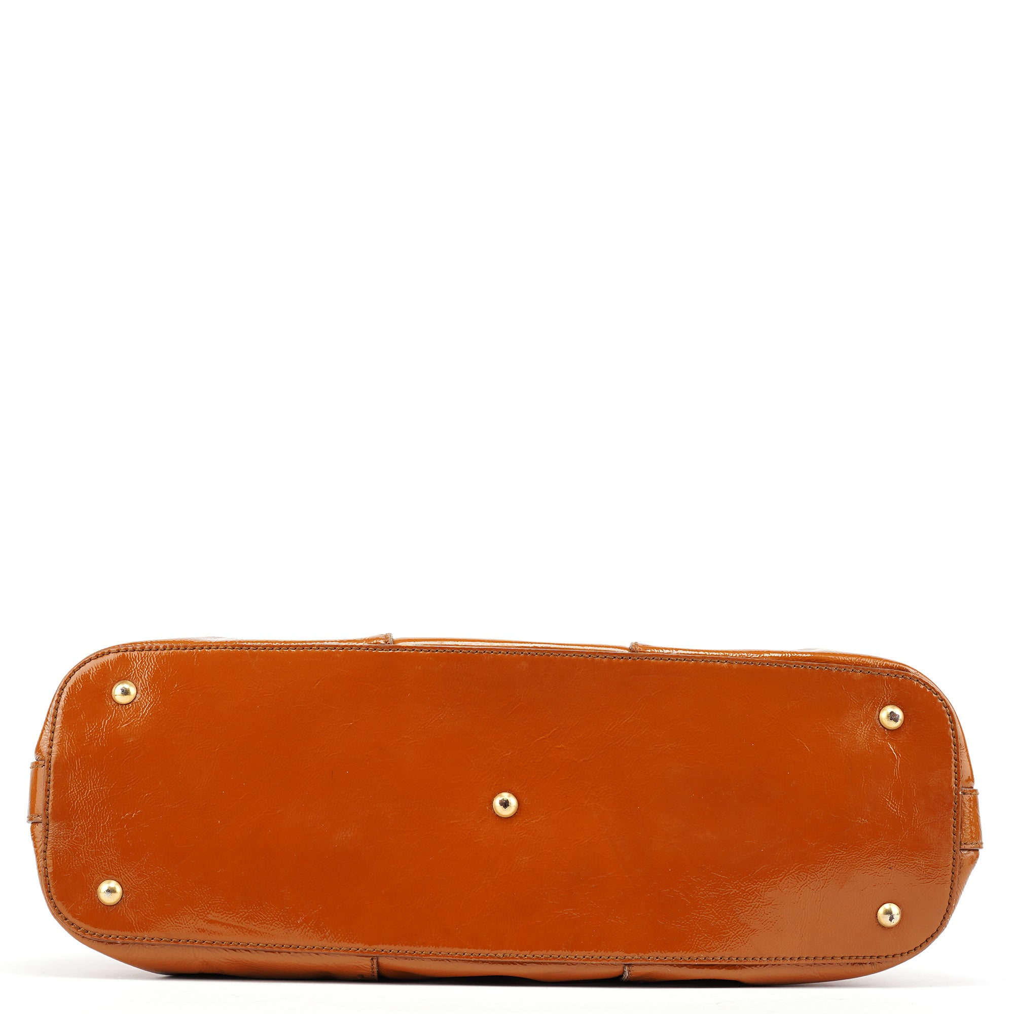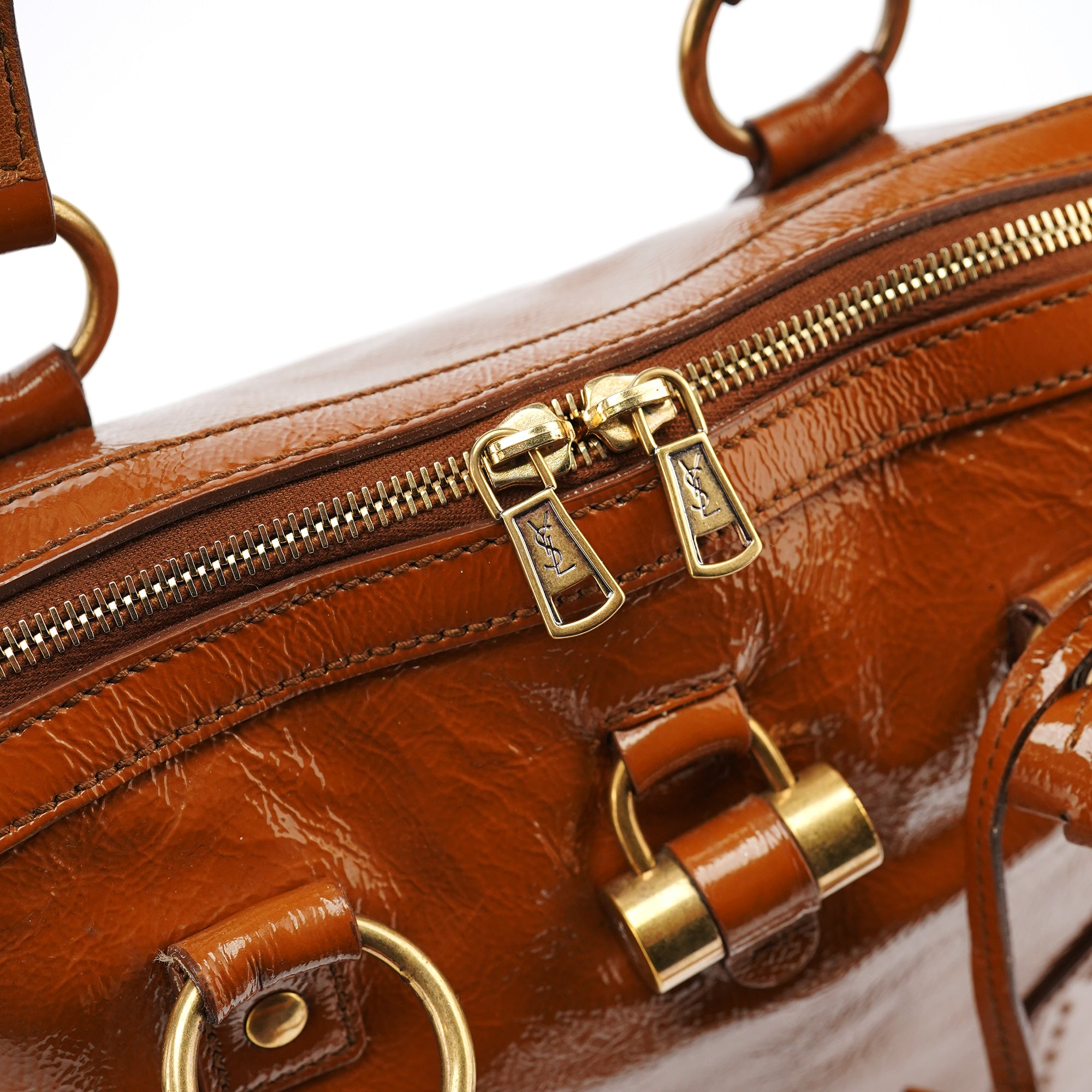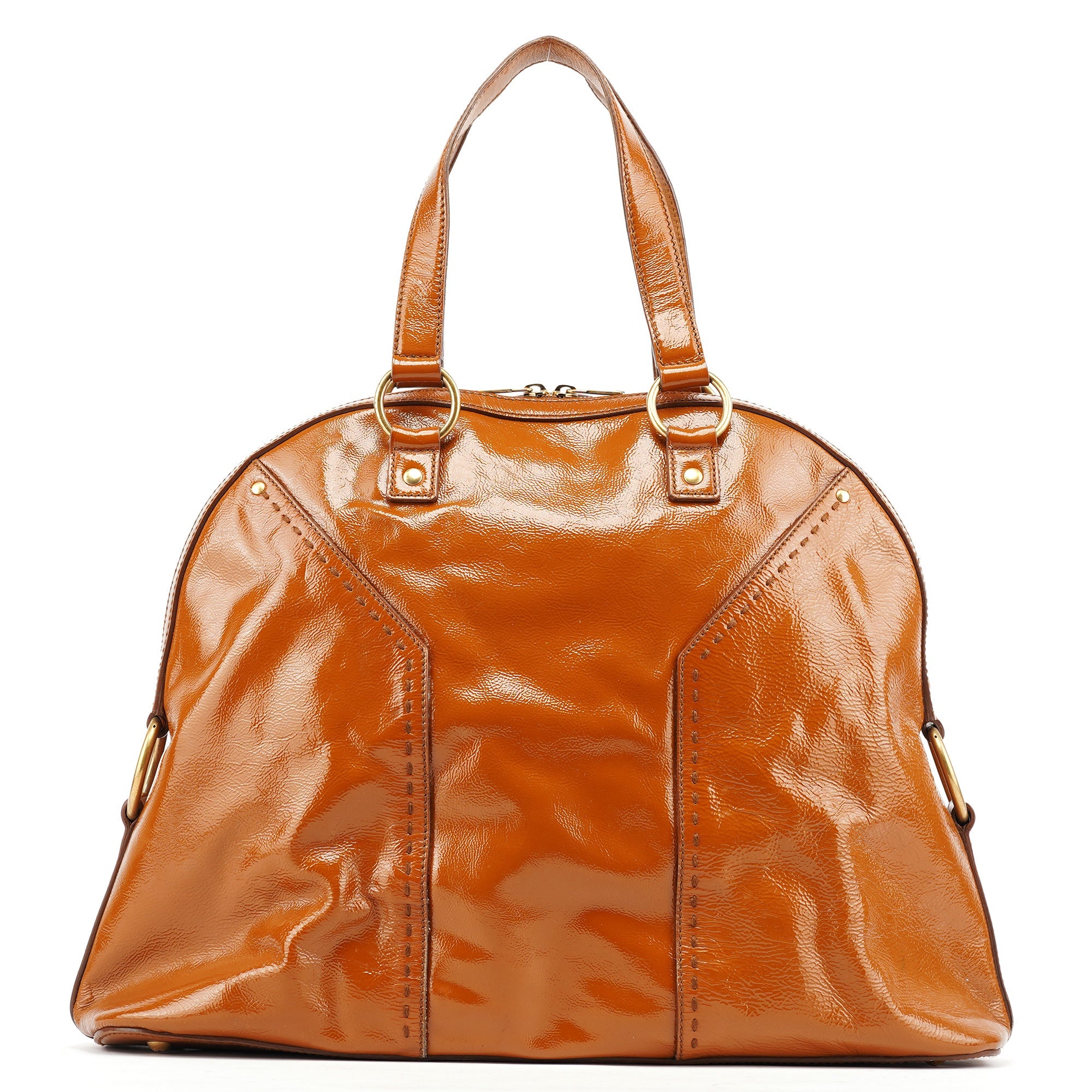 Designed in the late 2000s, this vintage Yves Saint Laurent Muse showcases the iconic dome-shaped silhouette in luxurious camel patent leather with a high-gloss finish. The bag features the signature Y-shaped leather accent at center front, gold-tone hardware, dual top handles, and the architectural design that made the Muse a modern classic. The spacious interior and structured shape create an elegant everyday tote.