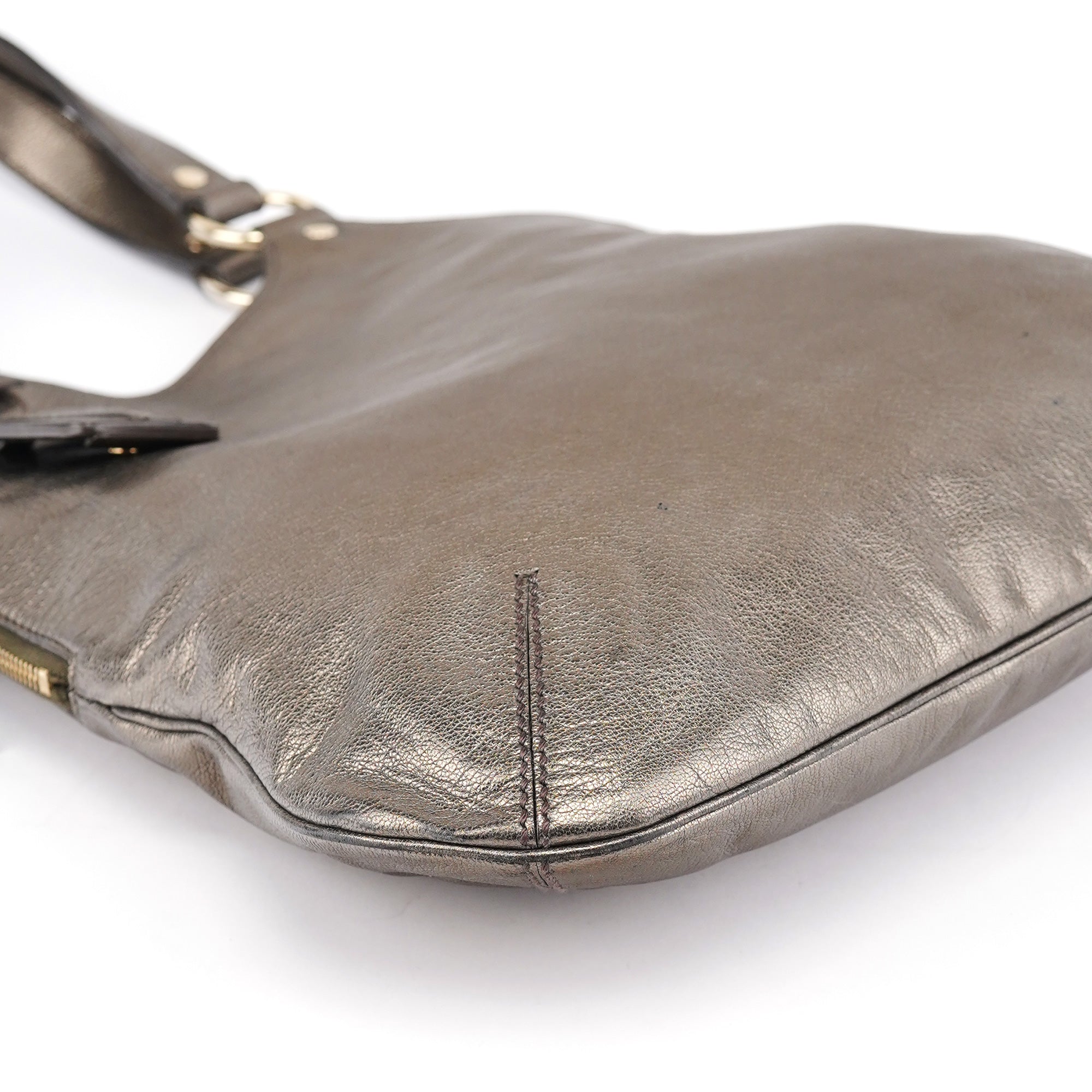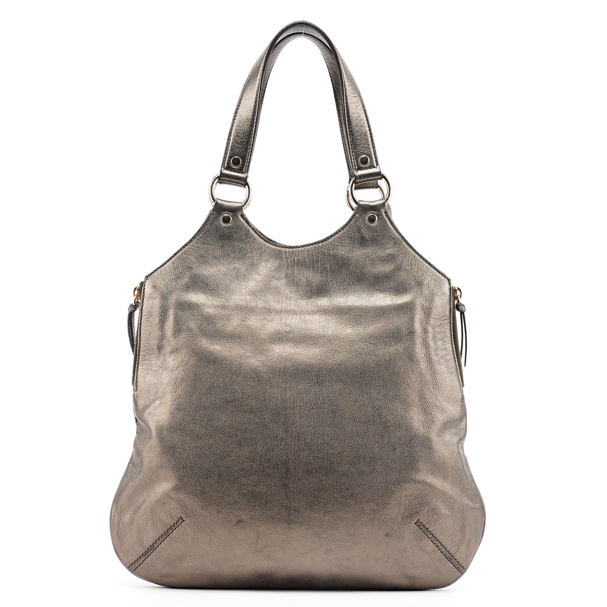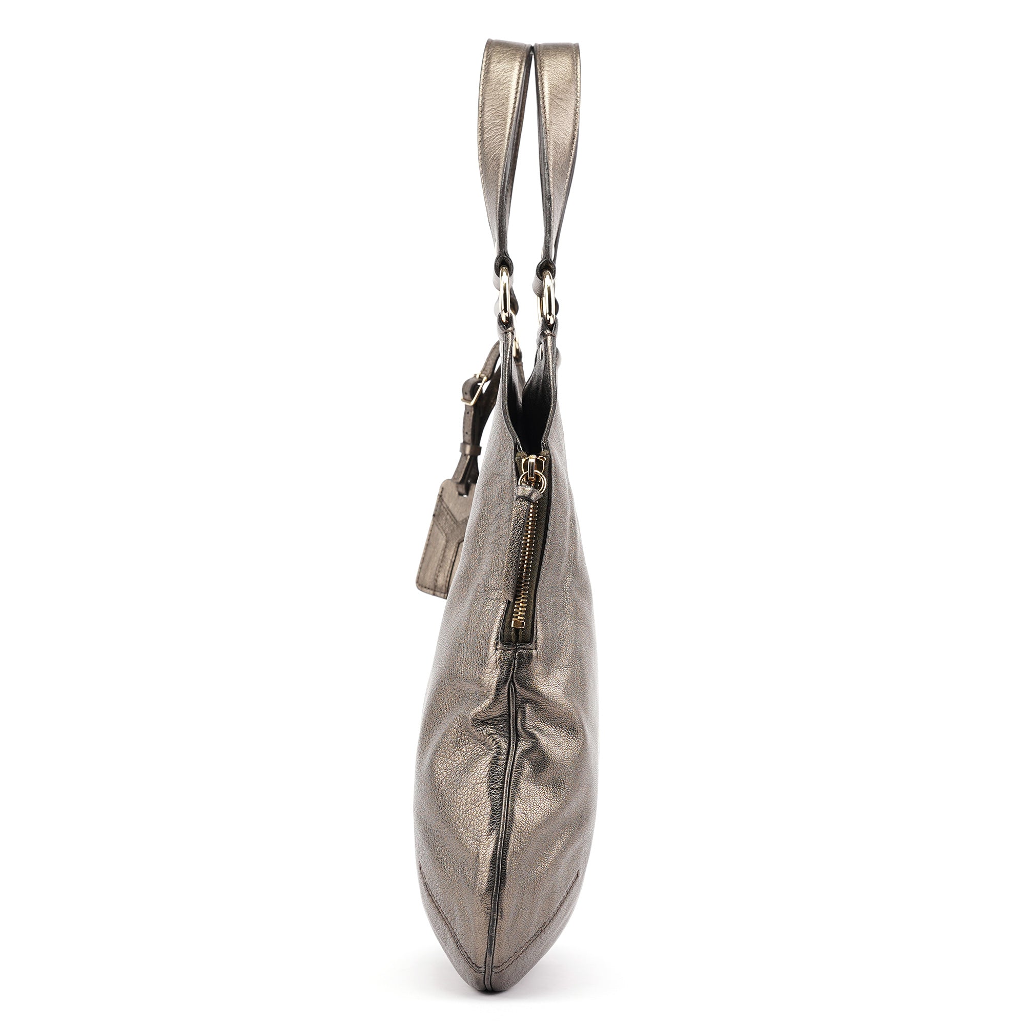 Designed in the late 2000s by Stefano Pilati, this YSL Metropolis shoulder bag is crafted in metallic platinum-finish leather with gold-tone hardware. Its tall, structured silhouette features dual flat shoulder straps, a spacious interior, and side zip details. The open top secures with concealed magnetic buttons, and the interior offers ample room for A4-size documents or magazines.