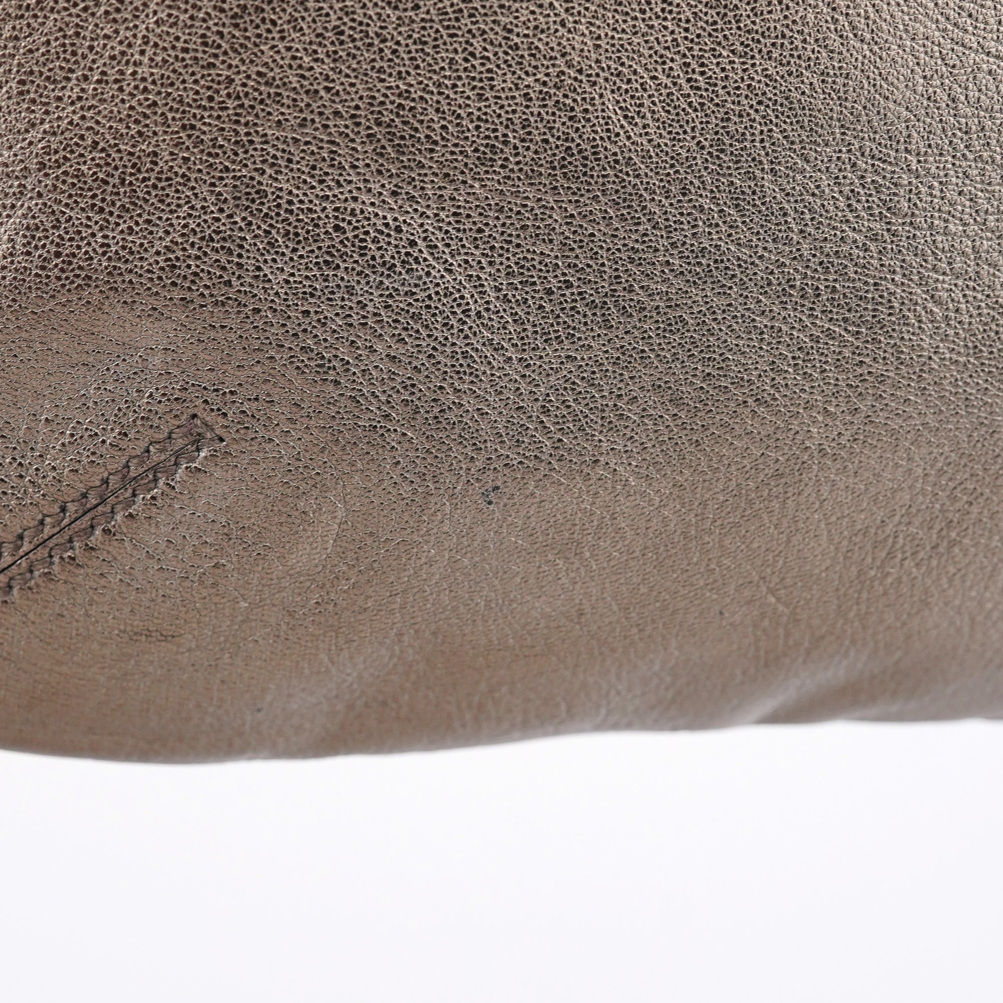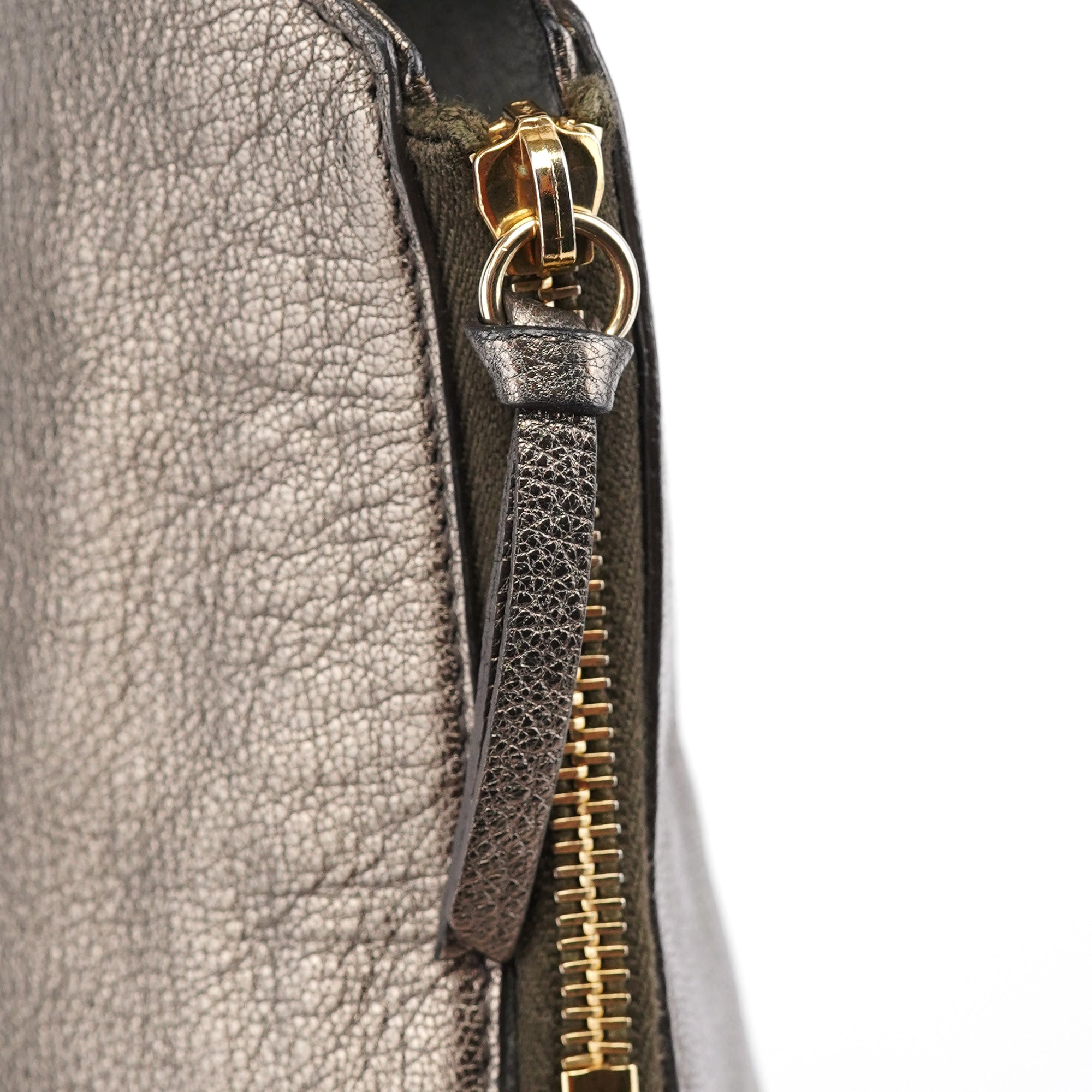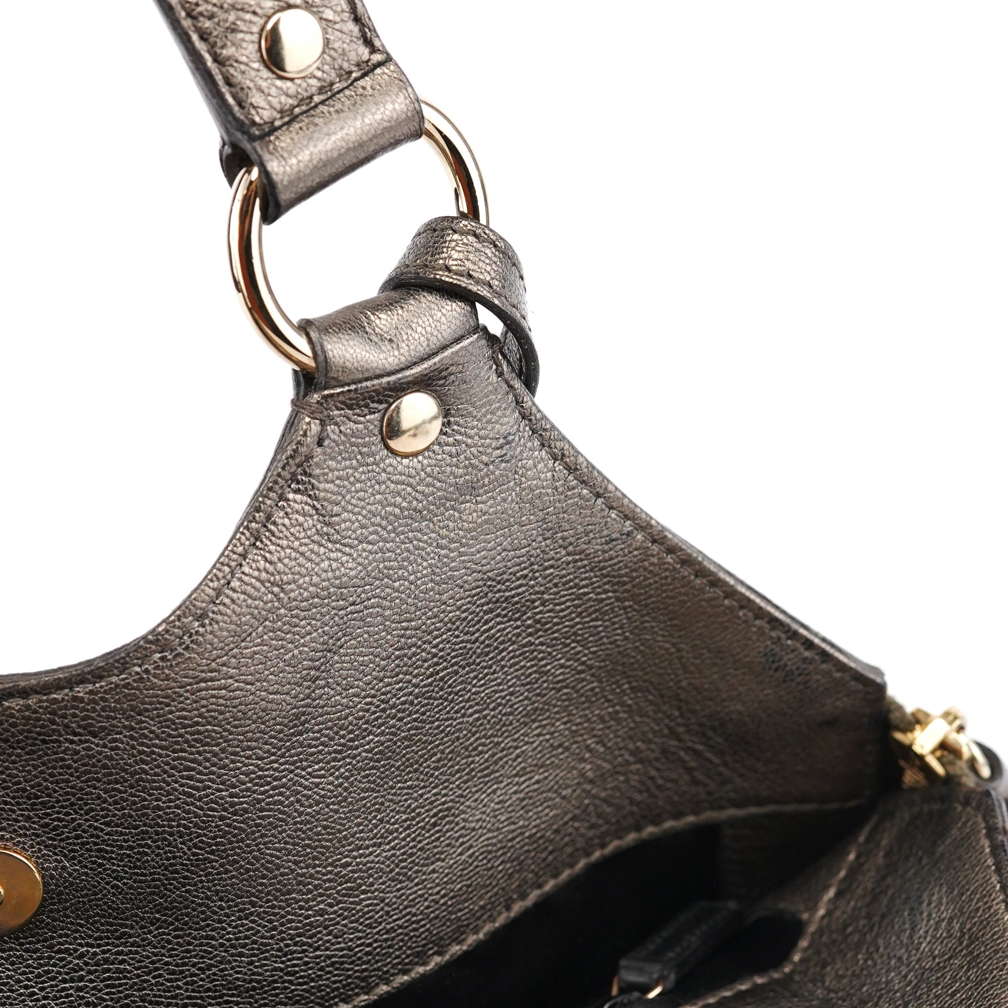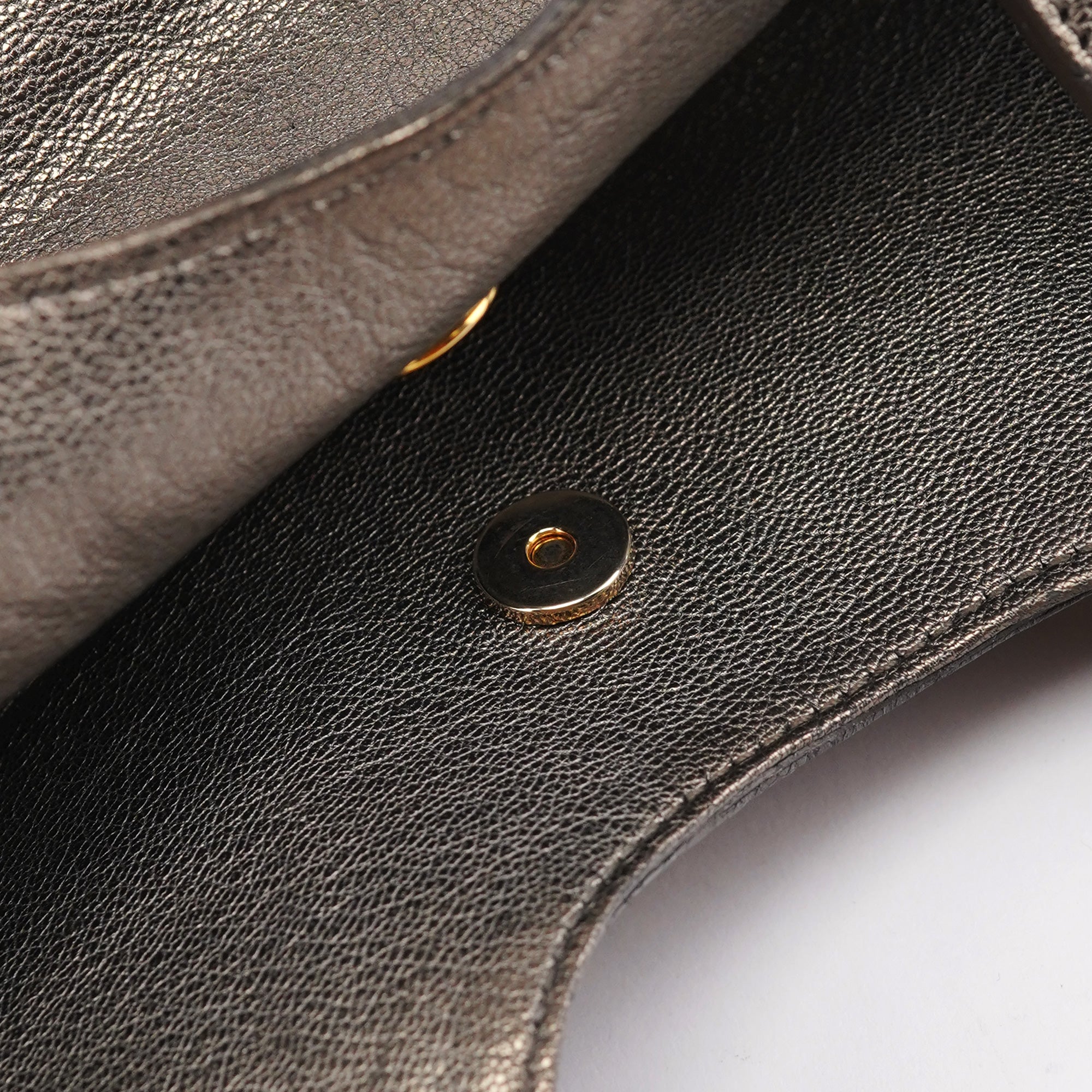 Designed in the late 2000s by Stefano Pilati, this YSL Metropolis shoulder bag is crafted in metallic platinum-finish leather with gold-tone hardware. Its tall, structured silhouette features dual flat shoulder straps, a spacious interior, and side zip details. The open top secures with concealed magnetic buttons, and the interior offers ample room for A4-size documents or magazines.