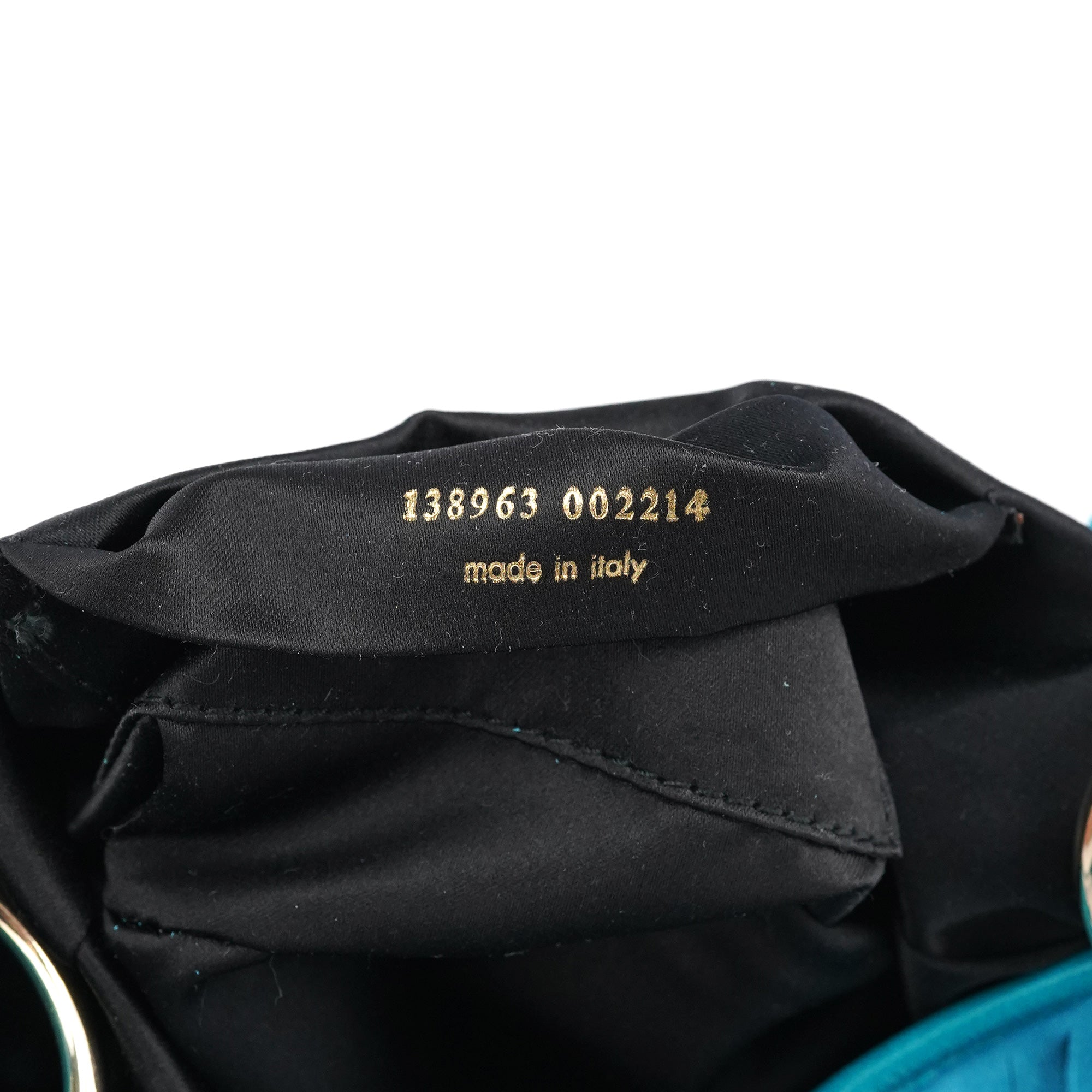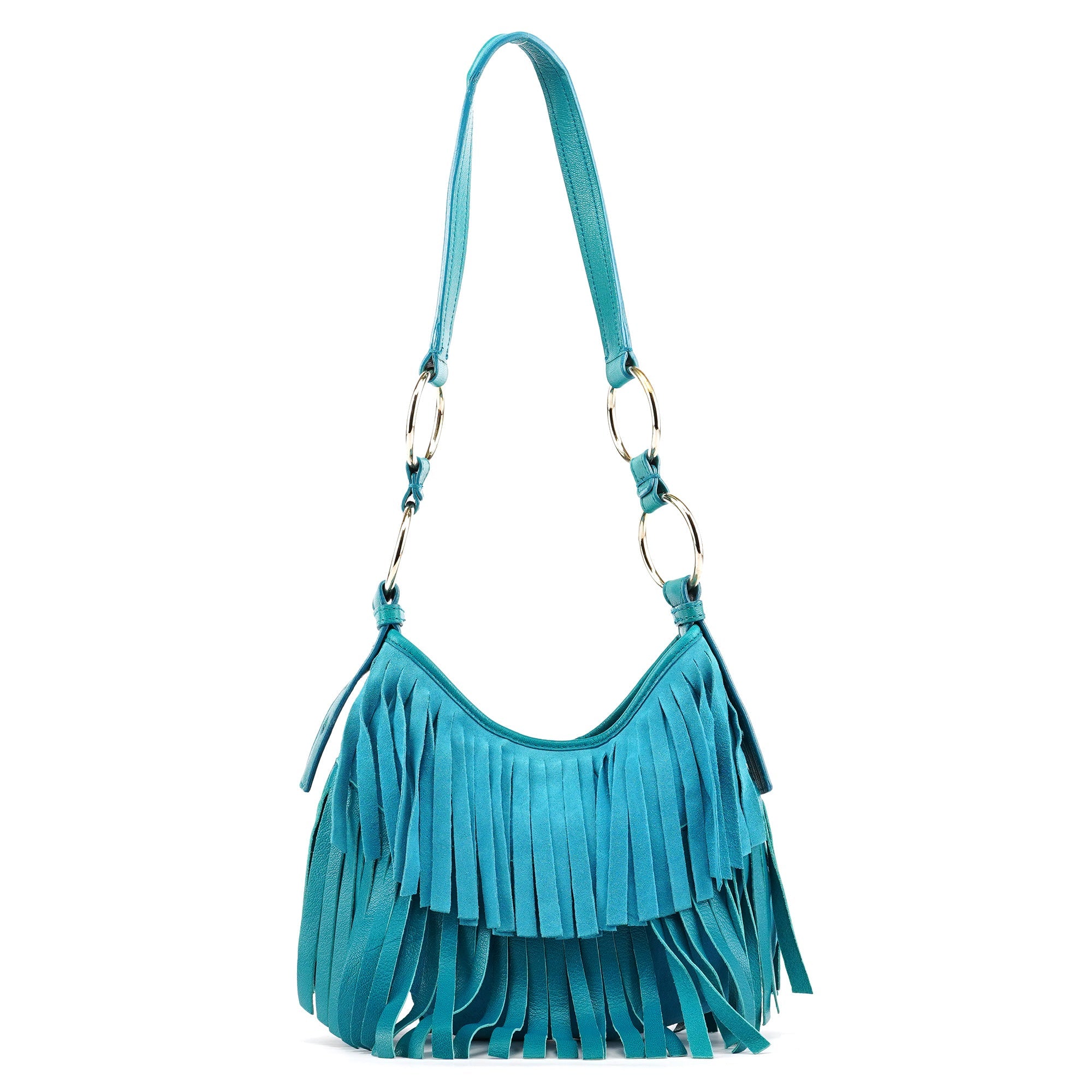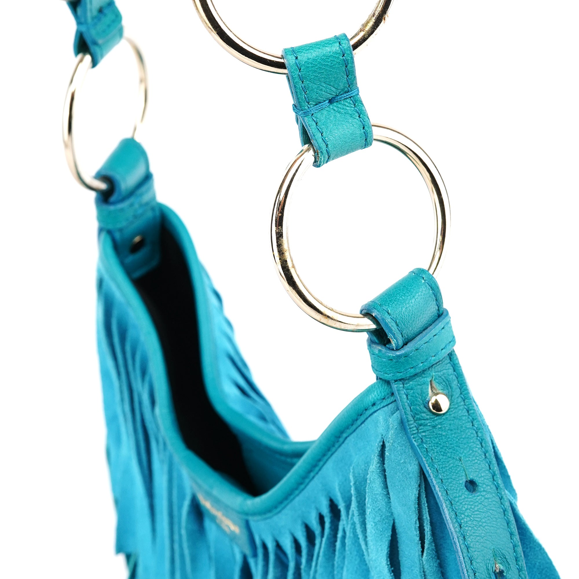 Designed in the early 2000s by Tom Ford, the Yves Saint Laurent Boheme Fringe bag is crafted from turquoise suede with tonal leather trim and silver hardware. Its bohemian silhouette features cascading fringe detailing and oversized metal rings along the strap. The interior is lined in black silk with a magnetic closure.